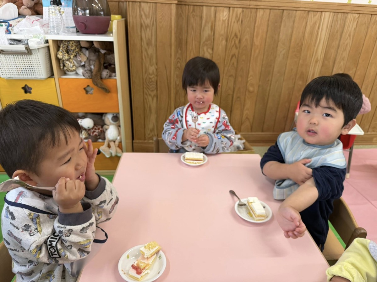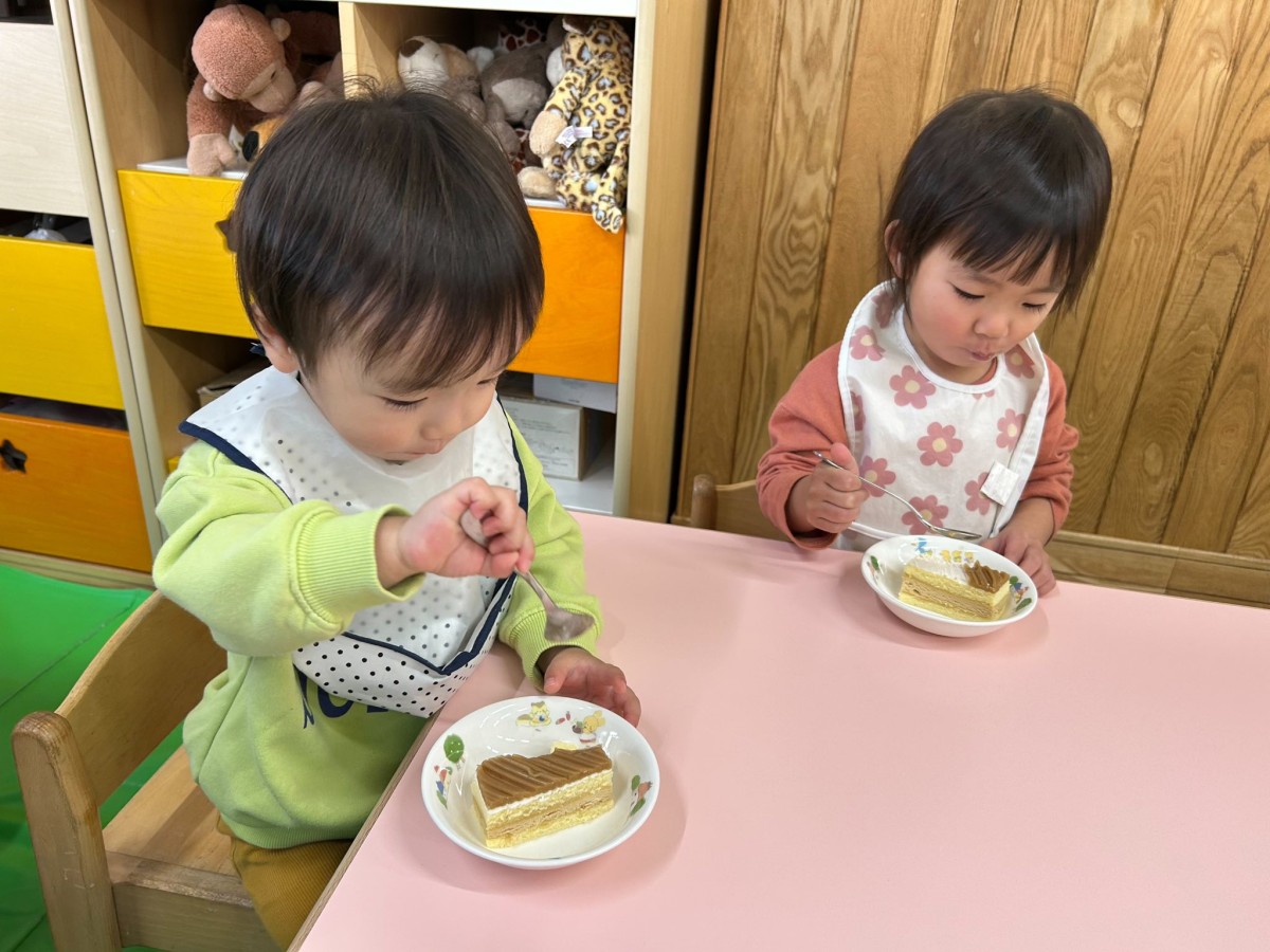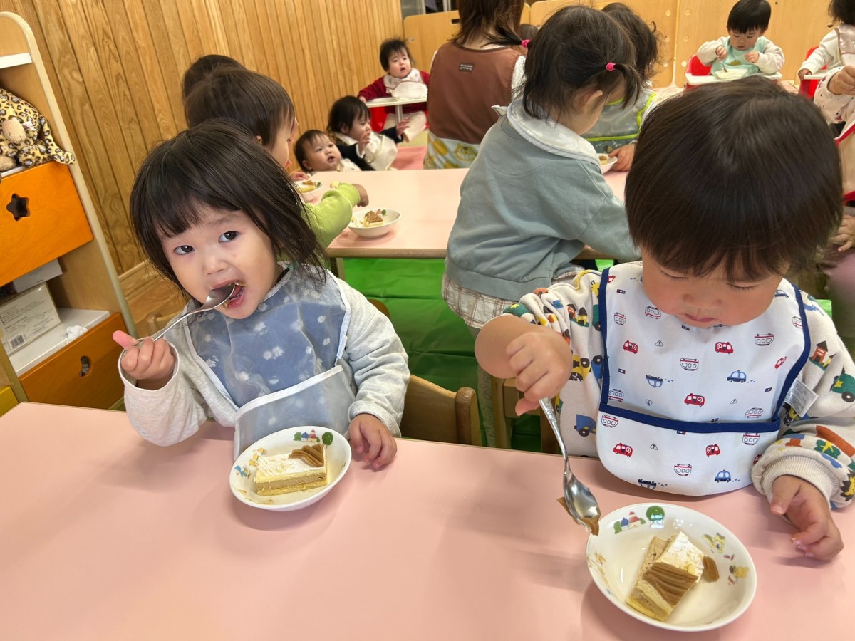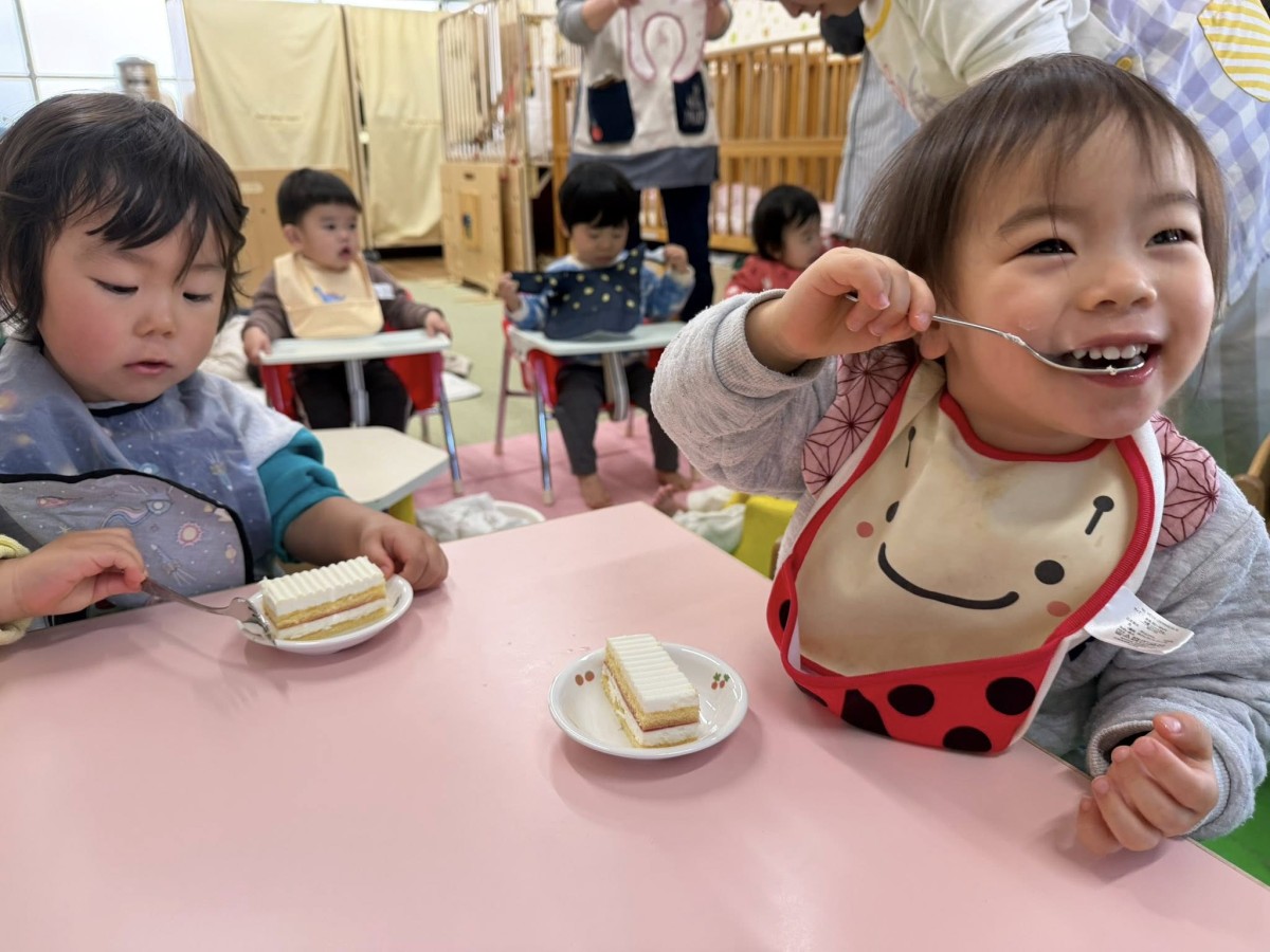 | 今日は12月のお誕生会に参加しました。大好きなハッピーバースデーの歌が始まると、手拍子をしながら身体を揺らして歌い出すひよこさん♪お部屋に戻っても「誕生日歌ったね!」「おめでとうしたね!」「またやりたいなぁ」と先生やお友達と話す姿が見られました。おやつのケーキ、美味しかったね! |