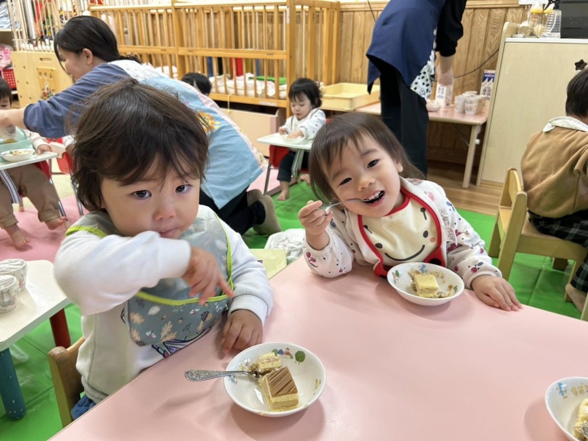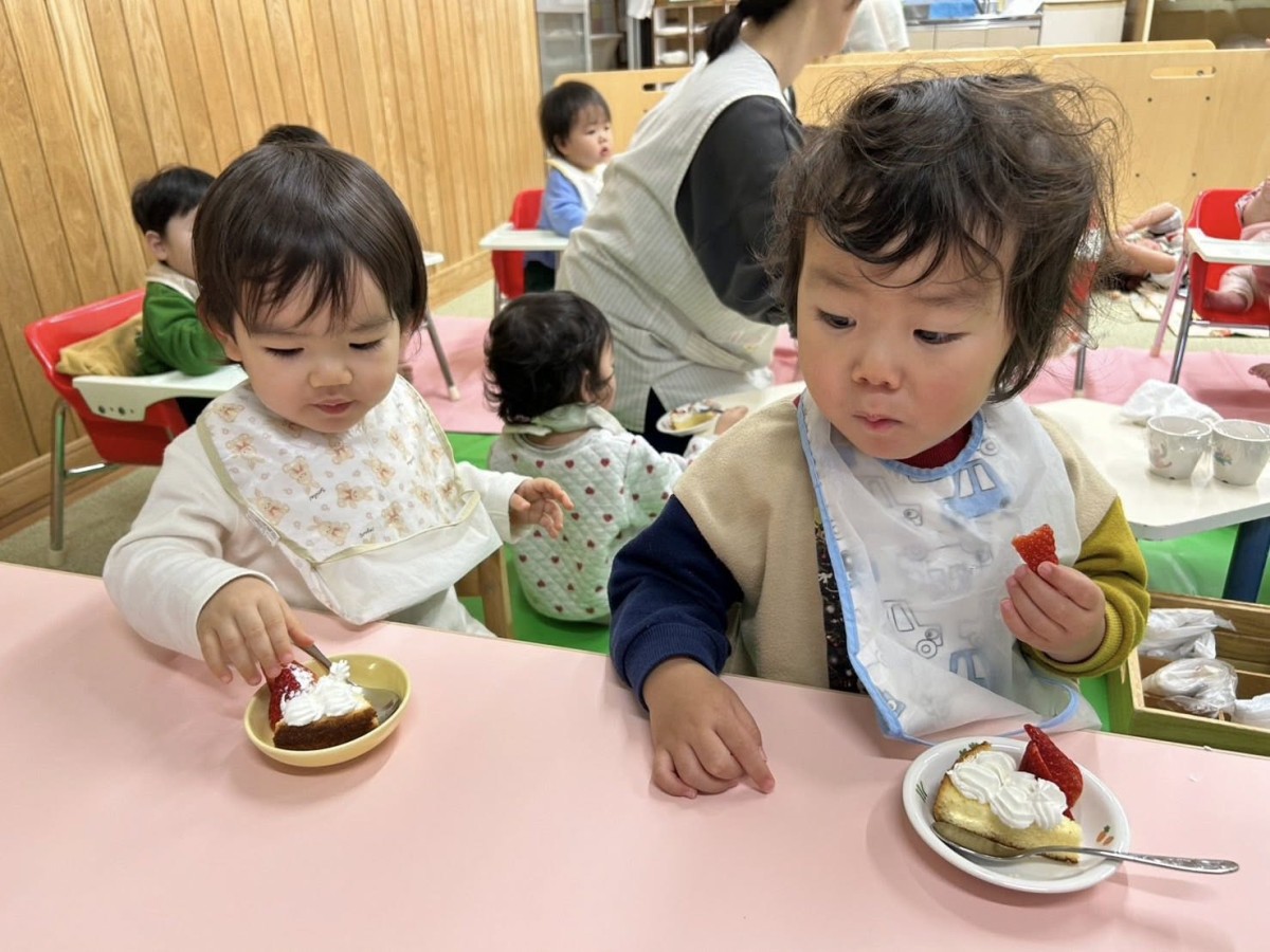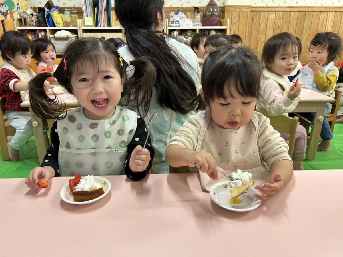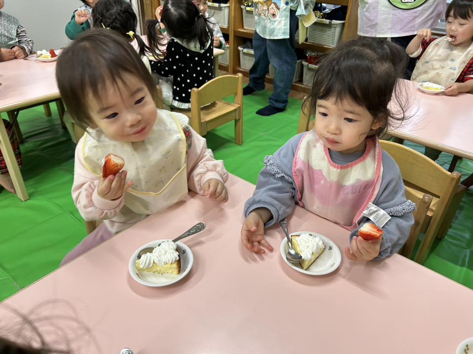 | 今日は12月のお誕生会に参加しました。大好きなハッピーバースデーの歌が始まると、手拍子をしながら身体を揺らして歌い出すひよこさん♪お部屋に戻っても「誕生日歌ったね!」「おめでとうしたね!」「またやりたいなぁ」と先生やお友達と話す姿が見られました。おやつのケーキ、美味しかったね! |