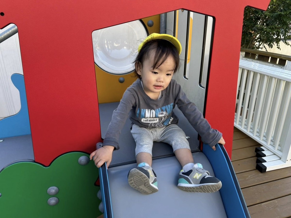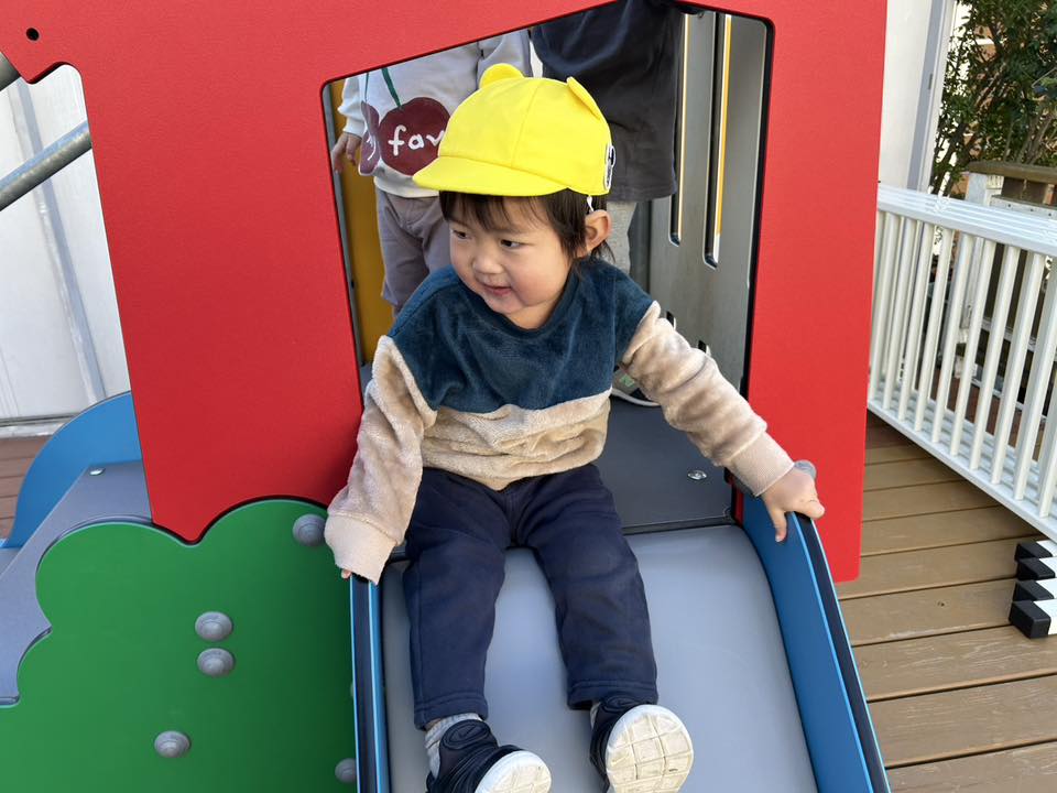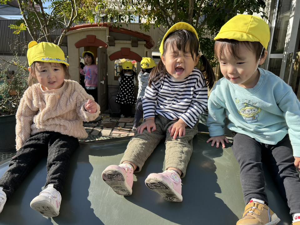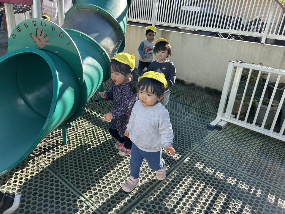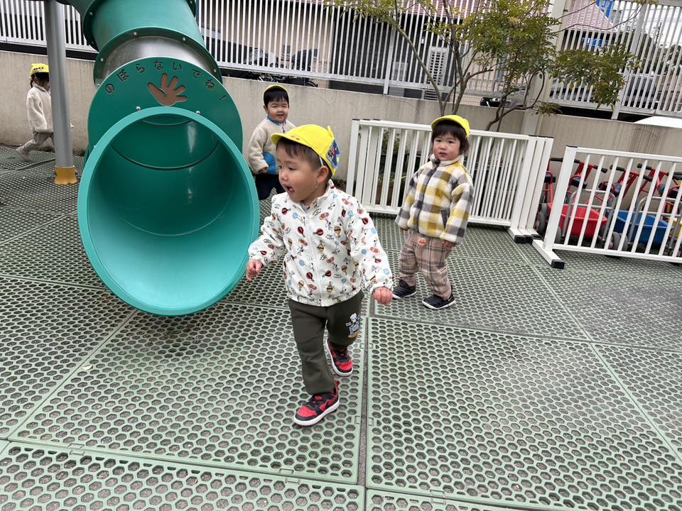 | 今日は園庭で追いかけっこや滑り台、乗り物やお砂場で遊びました。滑り台では上まで登り「おーい!」と手を振ったりお友達が滑ると「じょうず!」と拍手してあげる姿が見られました。バイクや三輪車では自分の足元を見ながら上手に地面を蹴って走っていました♪ |