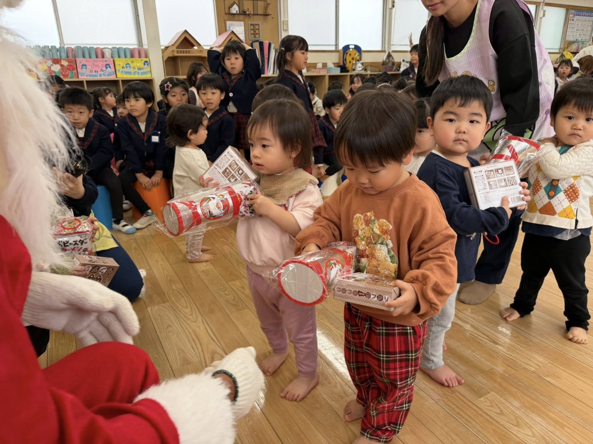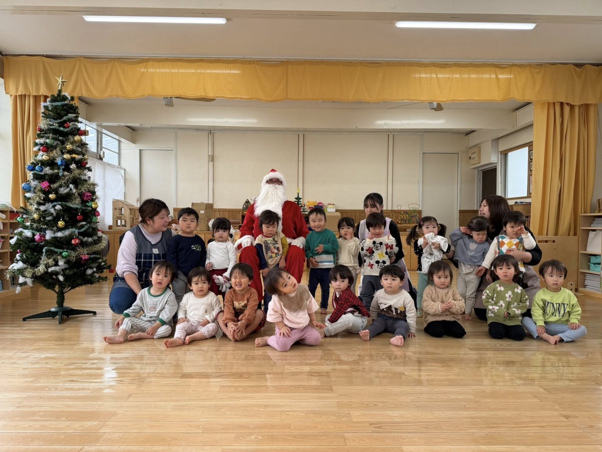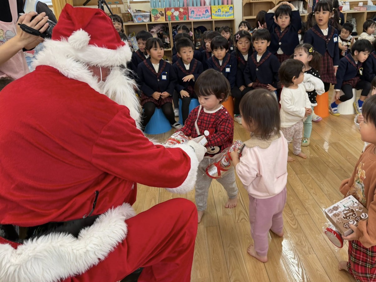 | 今日はクリスマス会に参加しました。サンタさんの登場に少し驚いていましたが、音楽やお歌が流れると体を揺らして歌ったり、手拍子をしてノリノリで楽しむ姿が見られました♪サンタさんからプレゼントを貰ってとっても嬉しそうです!おやつのケーキでは、大きな苺をお口いっぱいに頬張りニコニコ笑顔なひよこ組さんでした☆ |