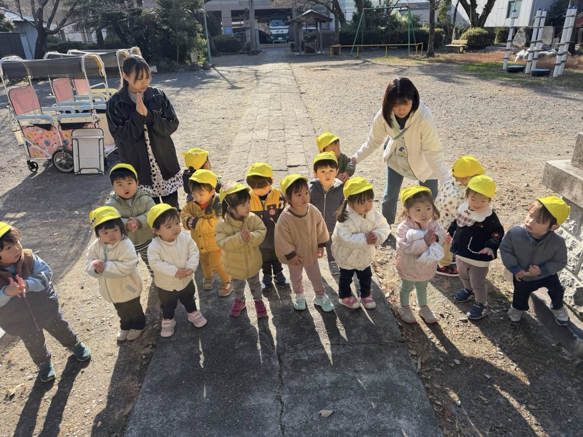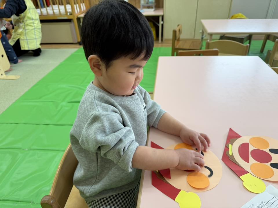 明けましておめでとうございます。本年もよろしくお願いします。 今日はベビーカーに乗って八雲神社へお参りに行ってきました。神社で鳥の鳴き声が聞こえると「どこかな?」「あっちかな?」「鳥さんどこー?」とキョロキョロしながら探しています♪園に戻ってからは制作をしました。アンパンマンの顔のパーツを自分で貼っています。自分だけのアンパンマンが出来上がると「出来たー!」と嬉しそうな表情が見られました♪ 年賀の式にも参加しました。 |