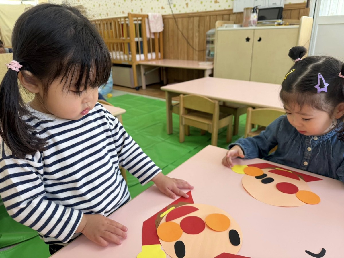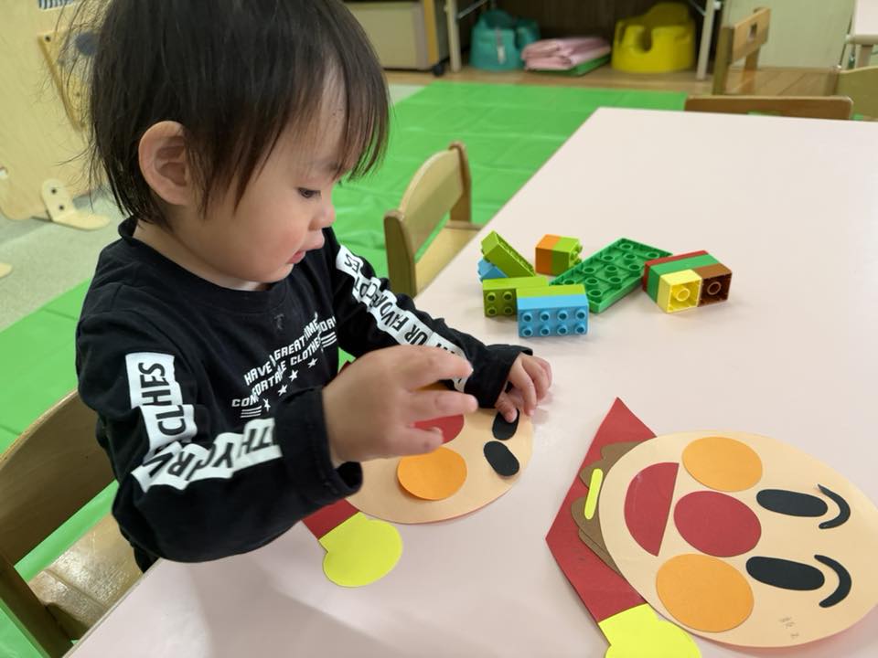 | 今日は園庭で遊ぶ前に誘導ロープで歩く練習をしました。駐車場まで出ましたが、手を離すことなく最後まで歩く事が出来ました!その後は園庭で遊びました。太鼓橋やスモールハウスの中、遊具の下に隠れてお友達が見つけると笑顔で逃げています。隠れんぼのようにお友達同士で楽しむ姿が見られました。室内では制作をしました。自分なりのアンパンマンの顔をつくっています。「ここかなぁ?」「これはどこ?」と先生に聞いたり、見本を見ながら一生懸命頑張っていました! |
