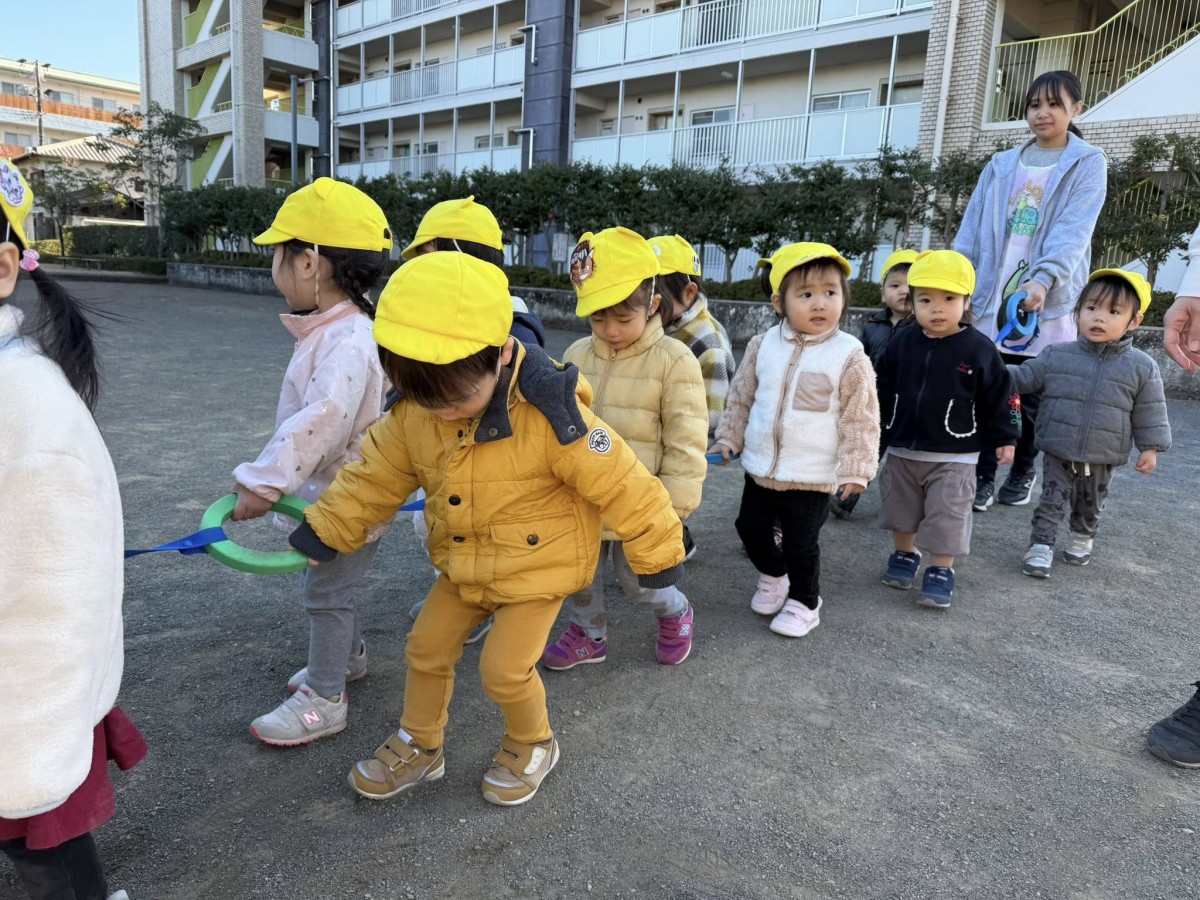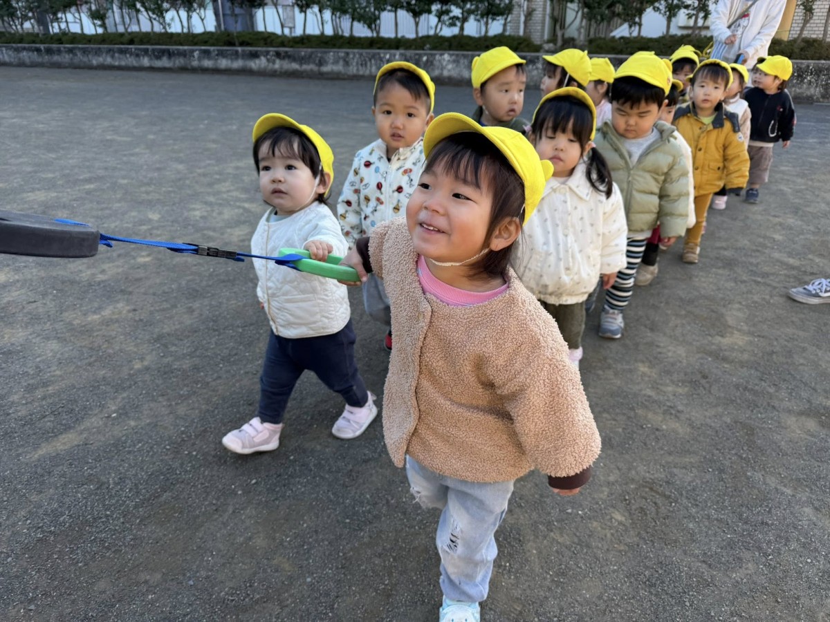 | 今日は南公園で誘導ロープで歩く練習をしてきました!園庭での練習とは少し違う景色や雰囲気、足元が砂利道という中で、輪っかをしっかりと持ち前を向いて歩く事が出来ました。帰り道は工事のおじさんや通行人の方にご挨拶をしたり、鳥や飛行機に手を振って賑やかな帰り道でした♪ |