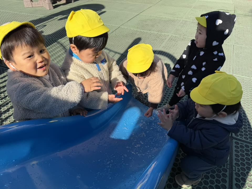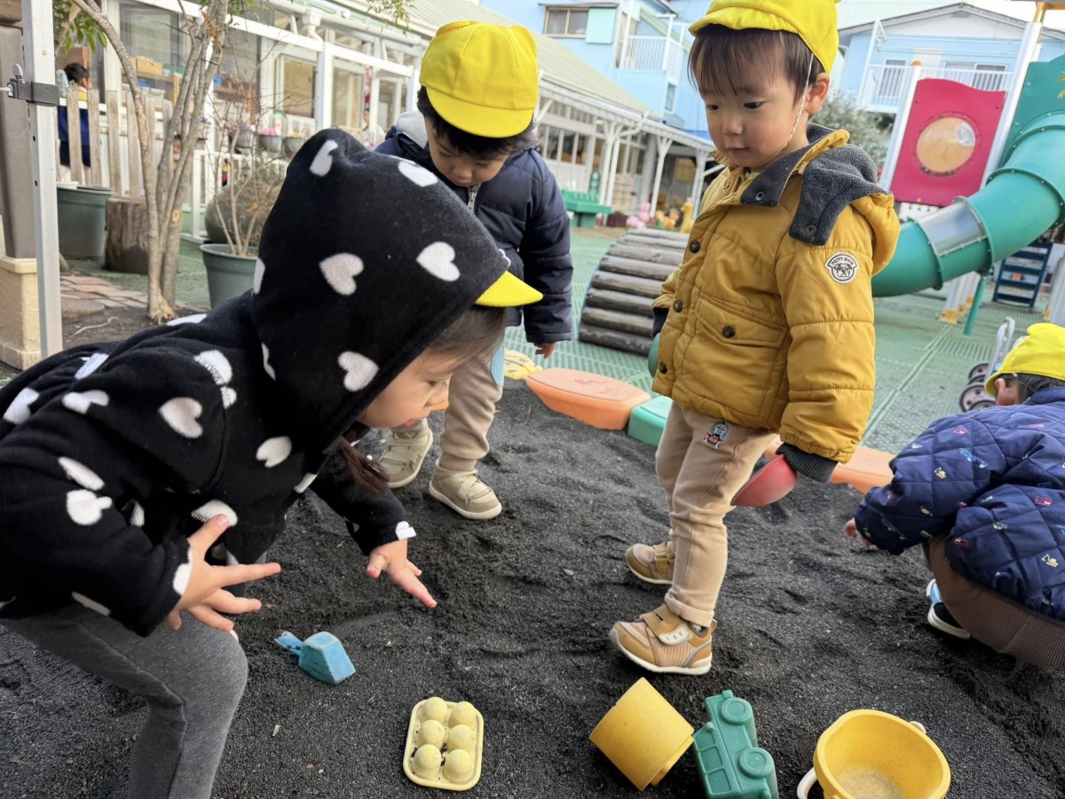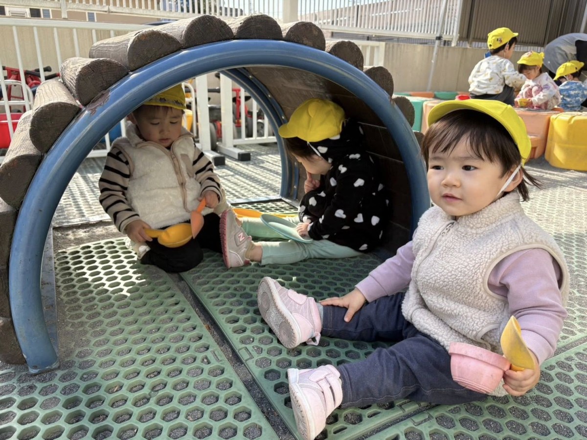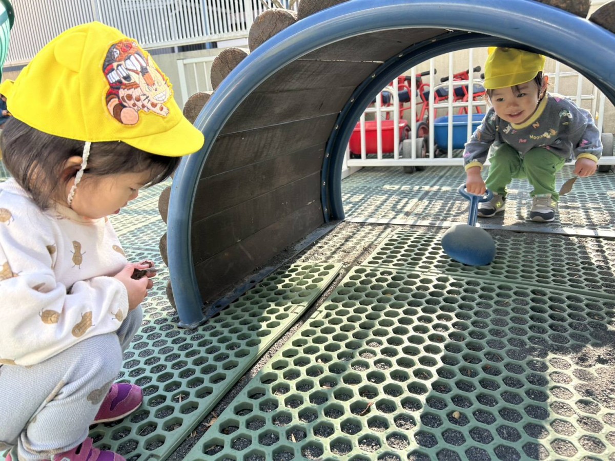 | 園庭で遊びました。遊具に張っていた氷を見せるとツンツンと触ってみたり、手に持って「つめたーい!」と言いながら楽しむ姿が見られました。お砂場ではトンネルの中に車を通して走らせたり、容器に砂を入れて食べ物に見立てておままごとのように遊んでいました。 |
