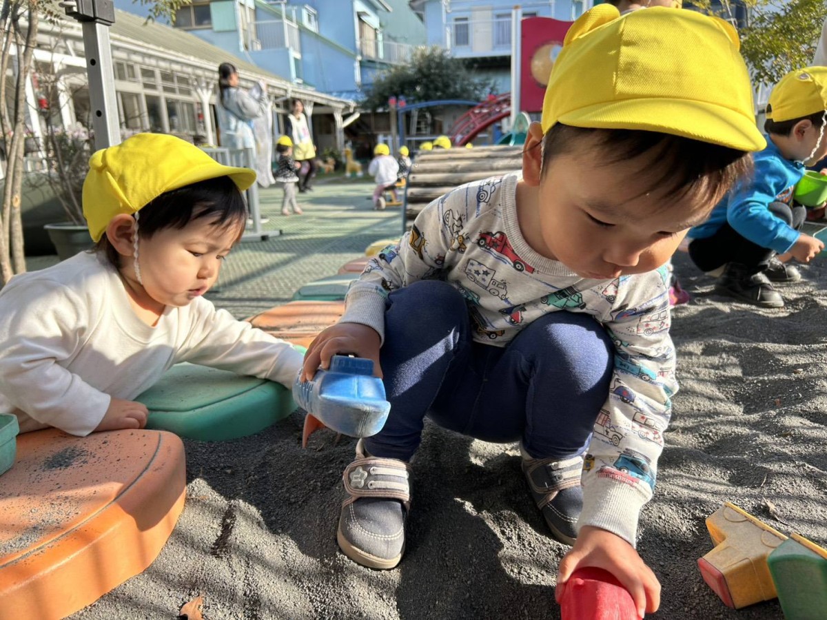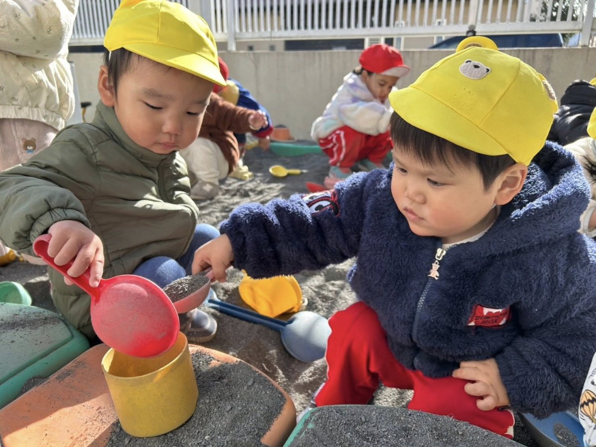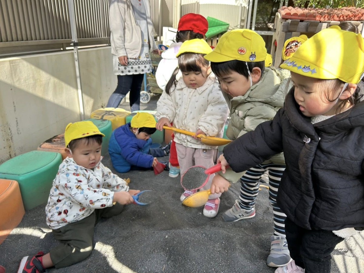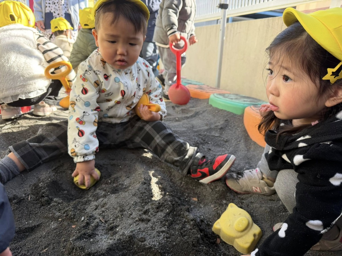 | 園庭で遊びました。遊具に張っていた氷を見せるとツンツンと触ってみたり、手に持って「つめたーい!」と言いながら楽しむ姿が見られました。お砂場ではトンネルの中に車を通して走らせたり、容器に砂を入れて食べ物に見立てておままごとのように遊んでいました。 |