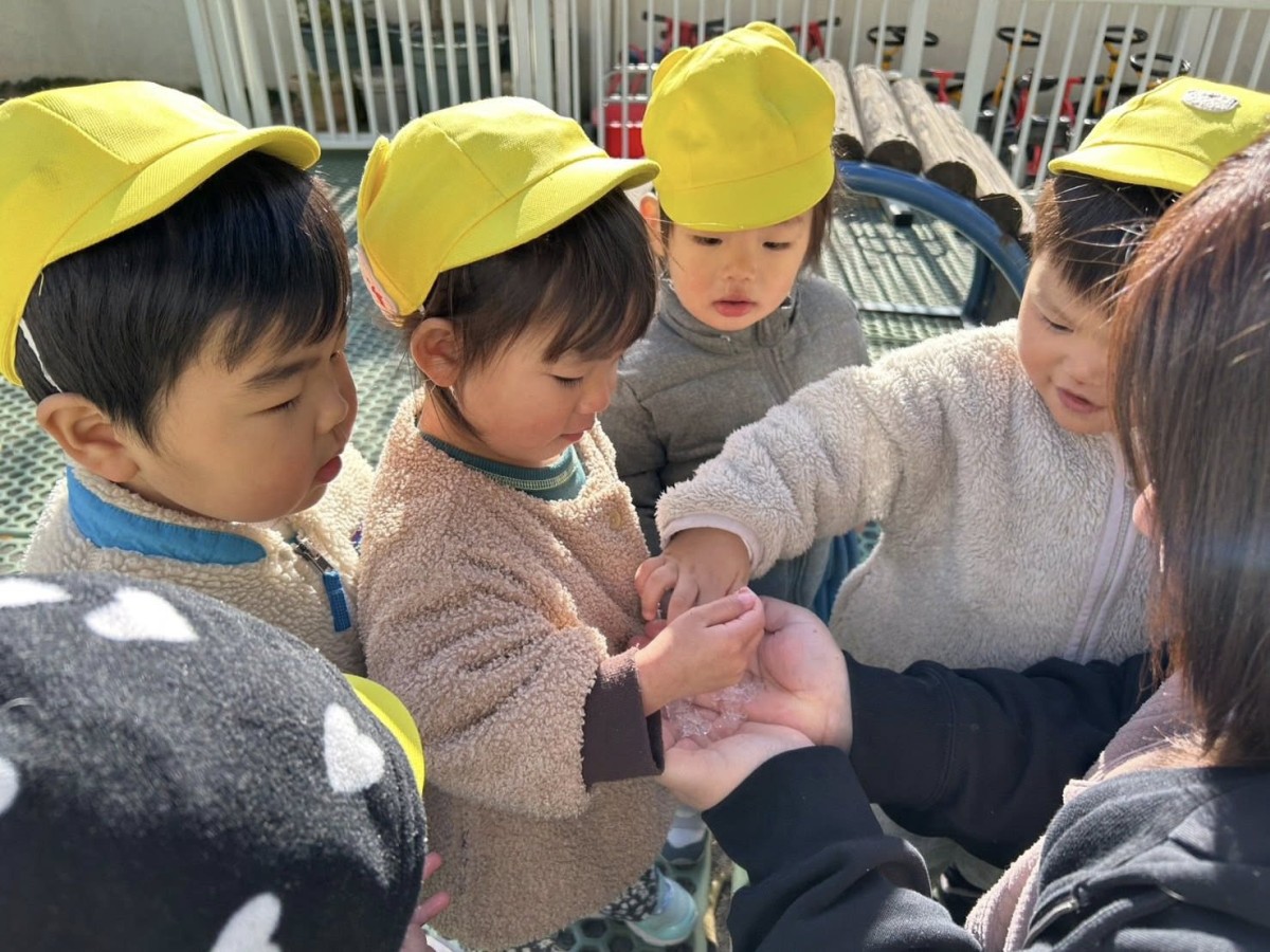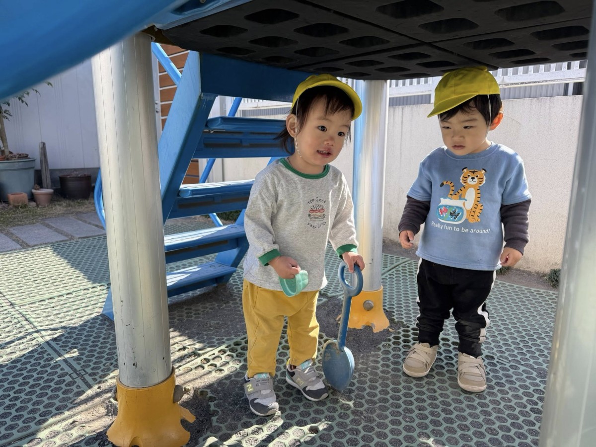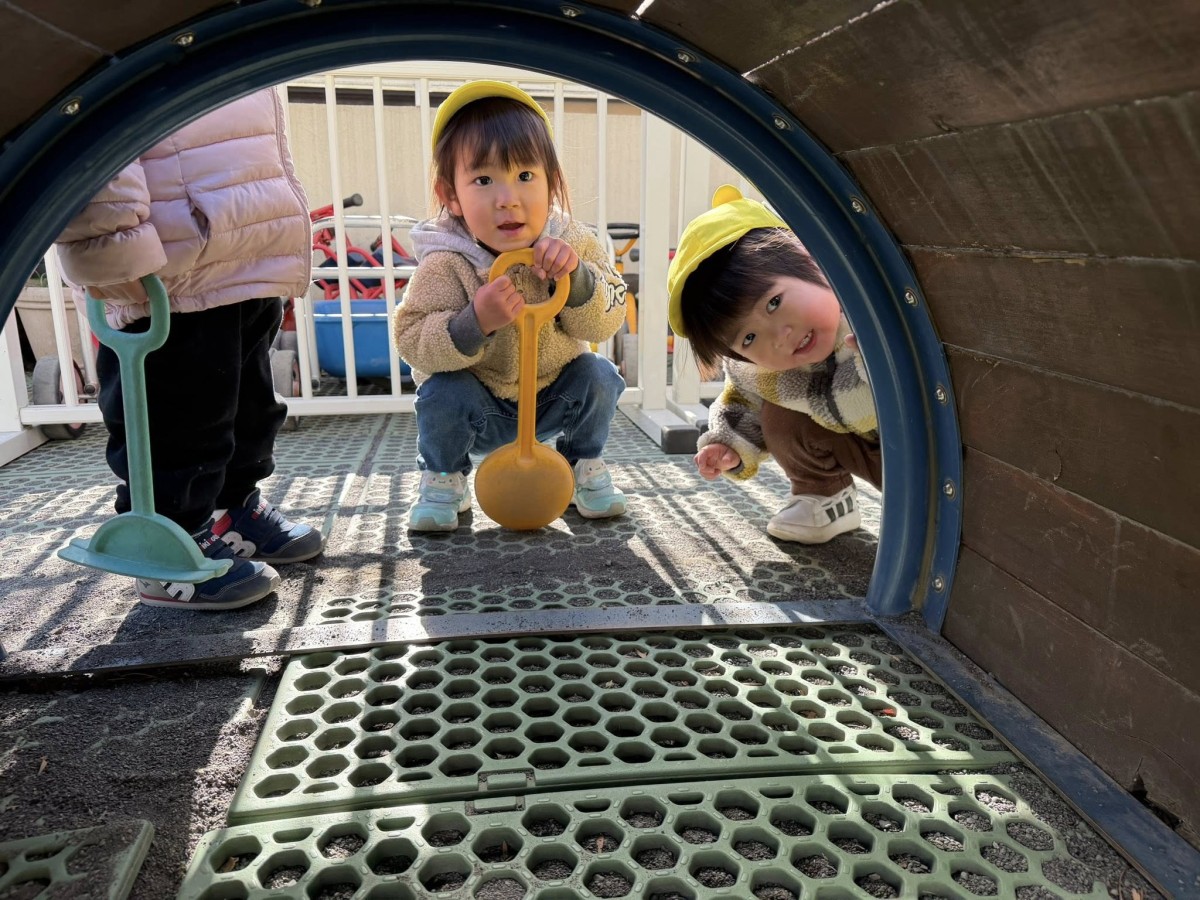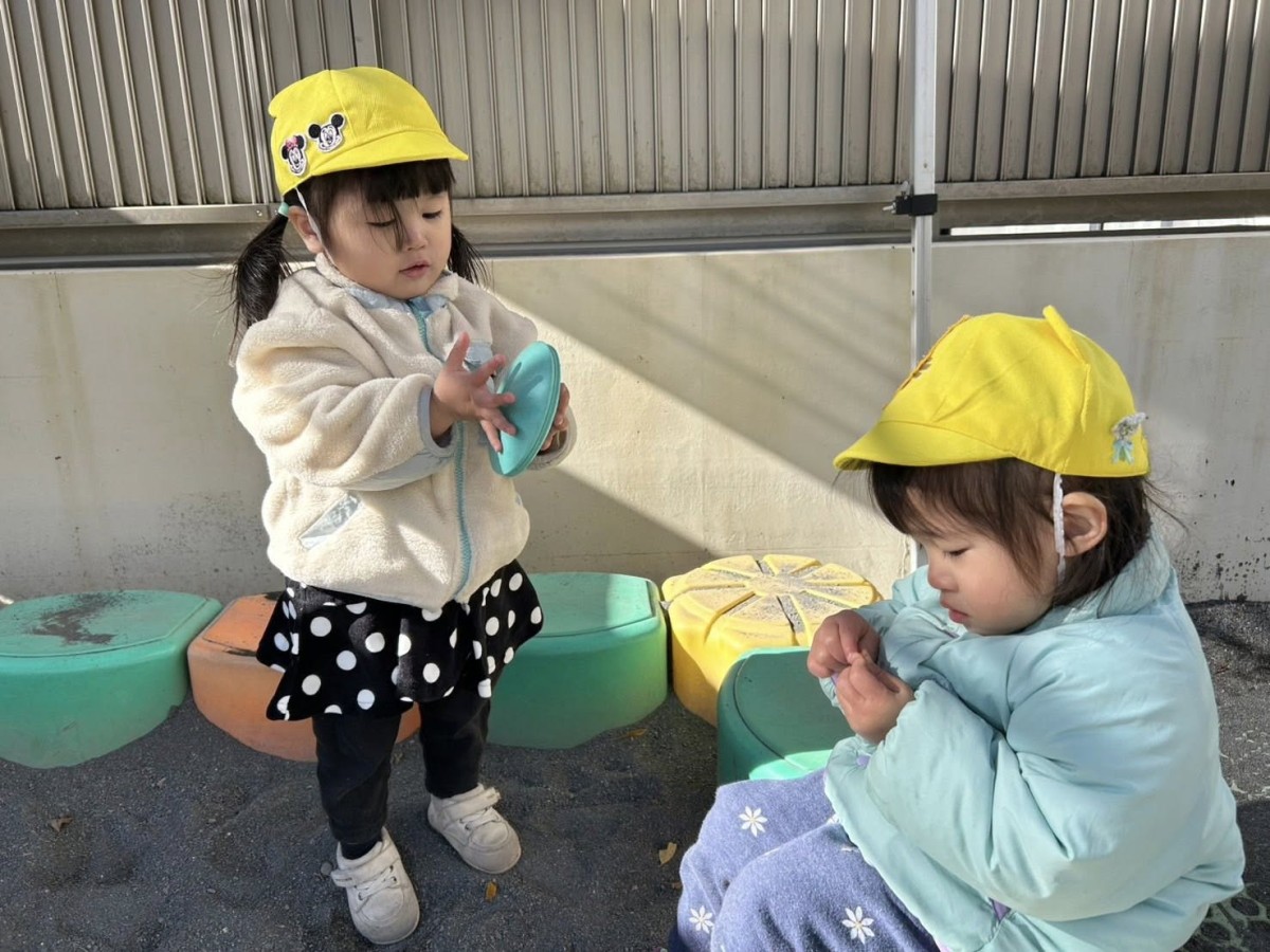 | 園庭で遊びました。遊具に張っていた氷を見せるとツンツンと触ってみたり、手に持って「つめたーい!」と言いながら楽しむ姿が見られました。お砂場ではトンネルの中に車を通して走らせたり、容器に砂を入れて食べ物に見立てておままごとのように遊んでいました。 |