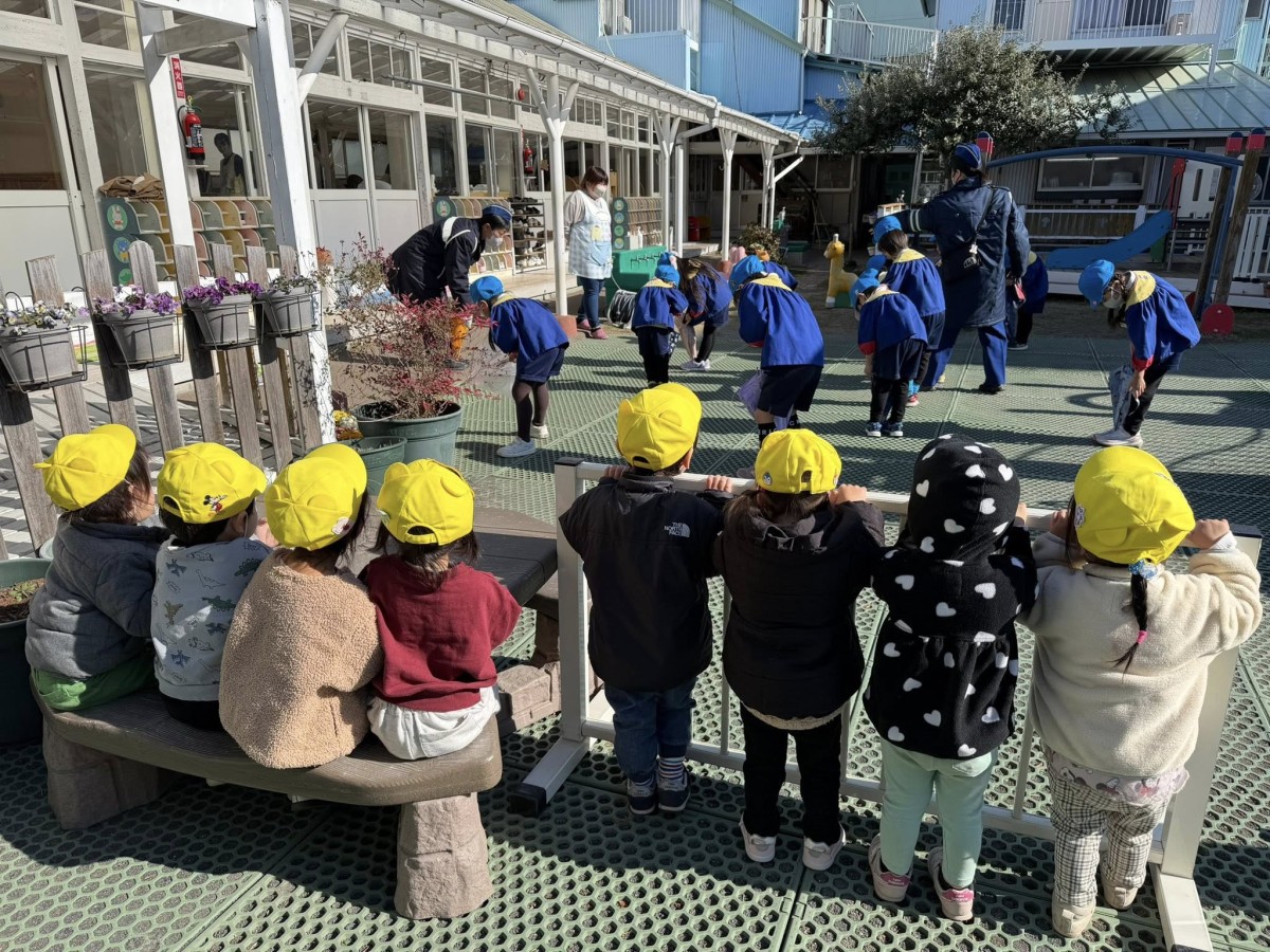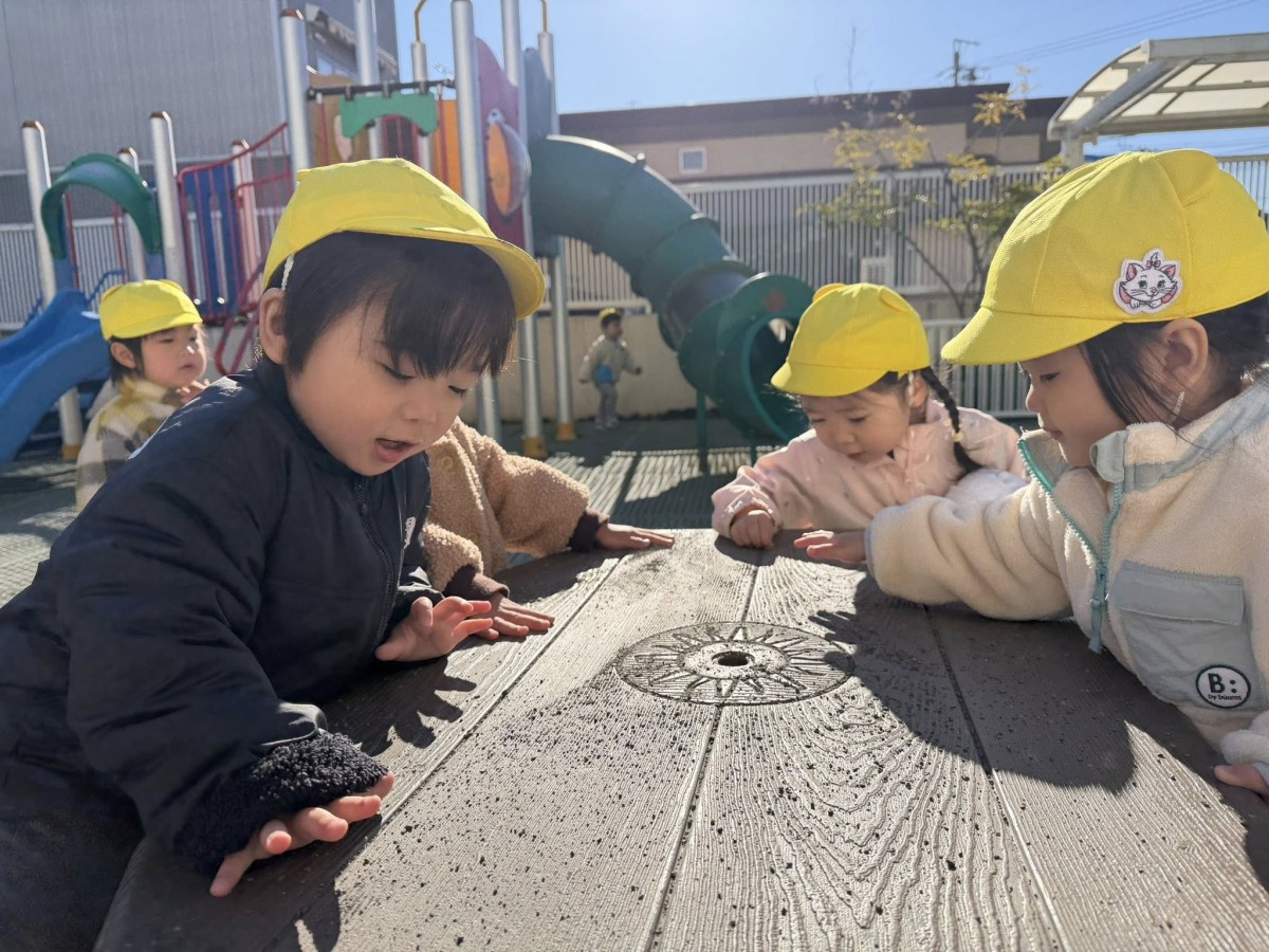 | 園庭では、あお組さんの交通教室の様子をテーブルに座ってじっと見つめ、「何してるのかな?」「傘持ってるね」とお友達同士で興味津々に話す姿が見られました。また、太鼓橋の下をくぐっては、顔を近づけて内緒話を楽しむ姿もあり、子どもたちならではのかわいらしいやりとりに心が和みました。それぞれが好きな遊びを見つけながら、園庭でのびのびと過ごした一日でした。 |