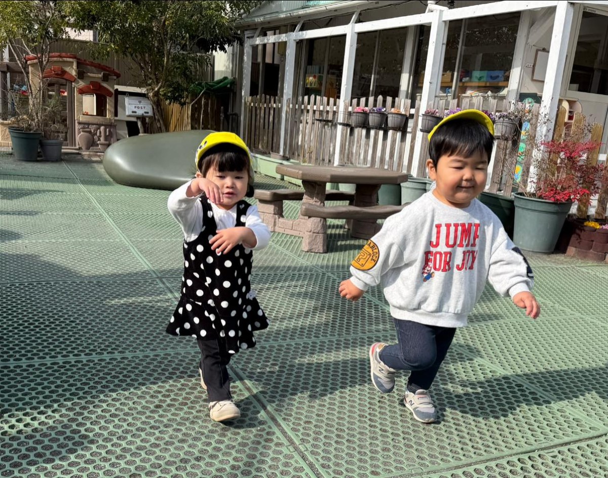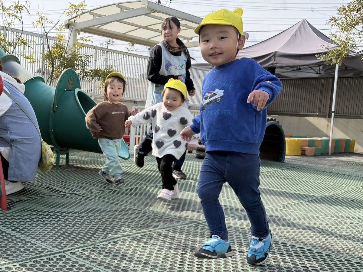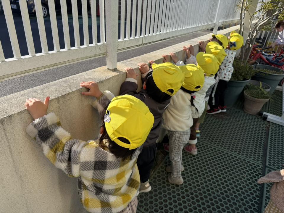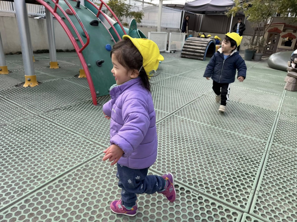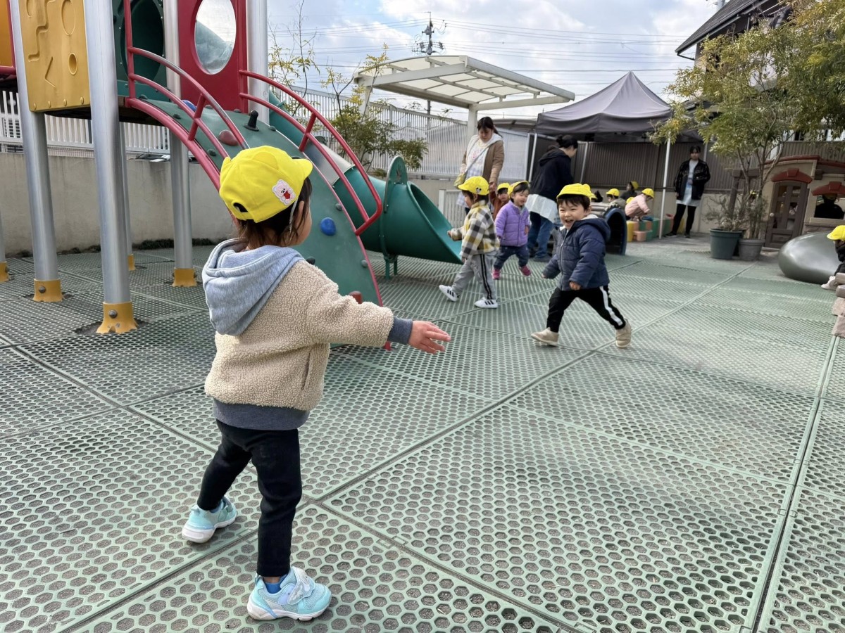 | 園庭で遊びました。追いかけっこでは「こっちおいでー!」「手を繋ごう!」とお友達に声をかけて一緒に走っています。駐車場に車が来ると「車きたね」「だれかな?」と一生懸命外を覗こうとする姿が可愛いです♪ |
