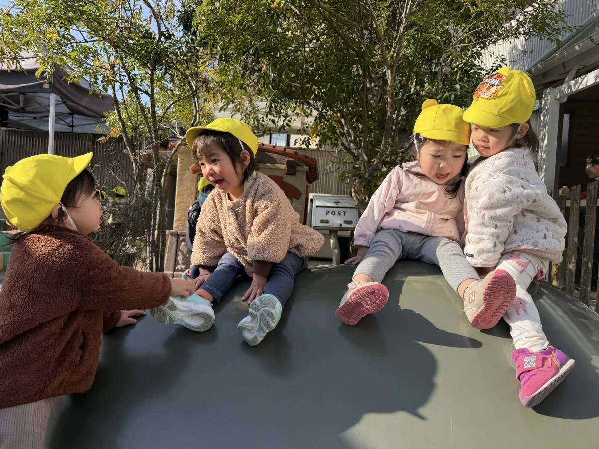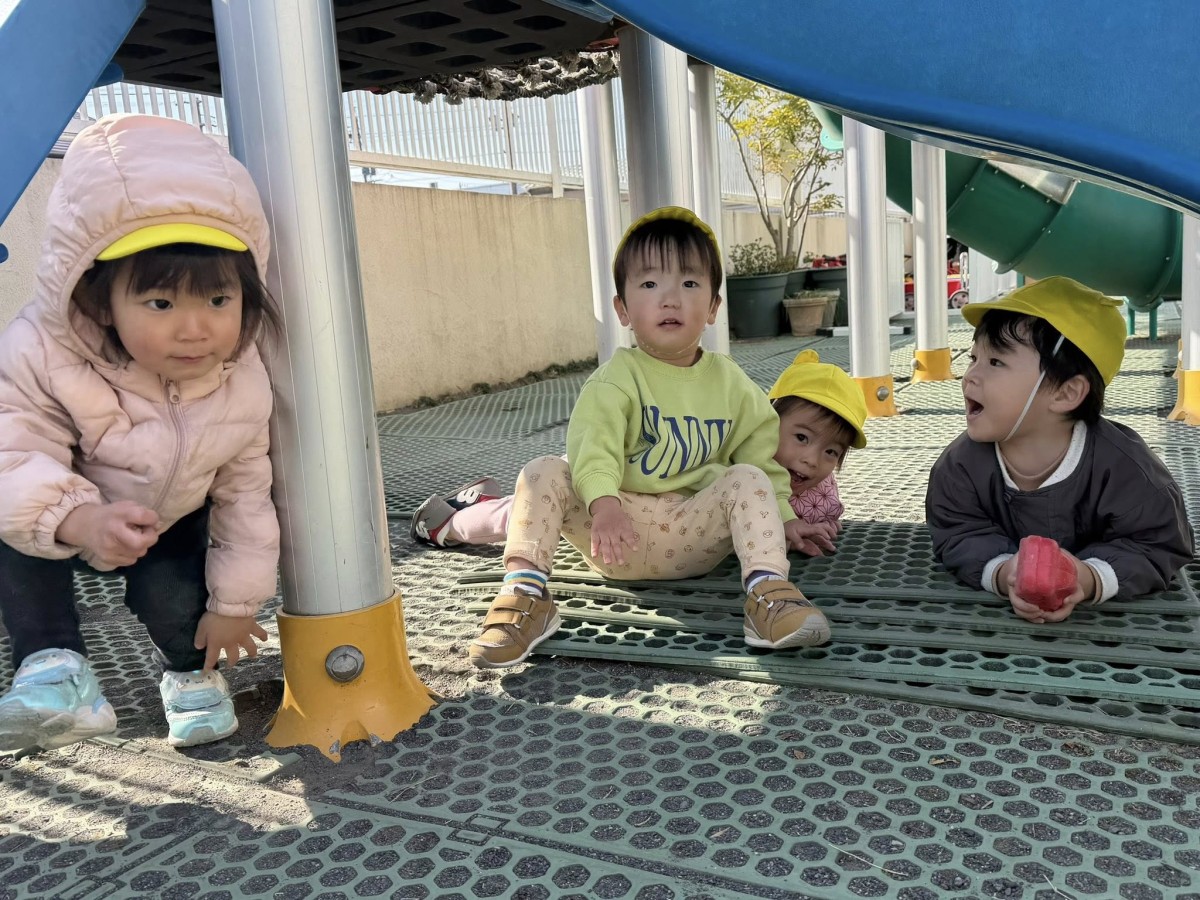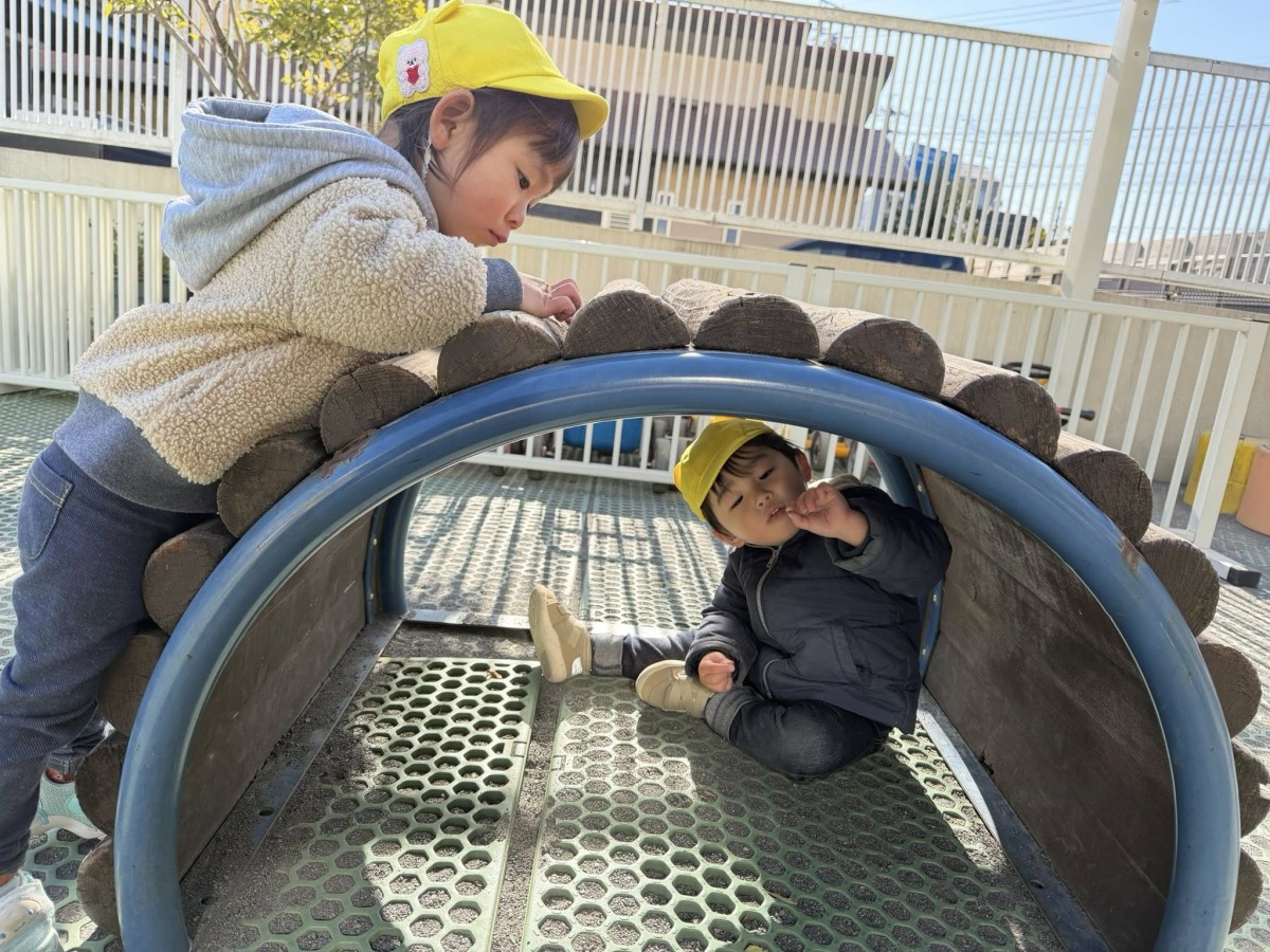 | 今日は園庭で遊びました。かけっこをした後、太鼓橋や大型遊具の下の空間などそれぞれの秘密基地のような空間にお友だちと集まって和やかに遊んでいる姿がとても可愛らしかったです。 |