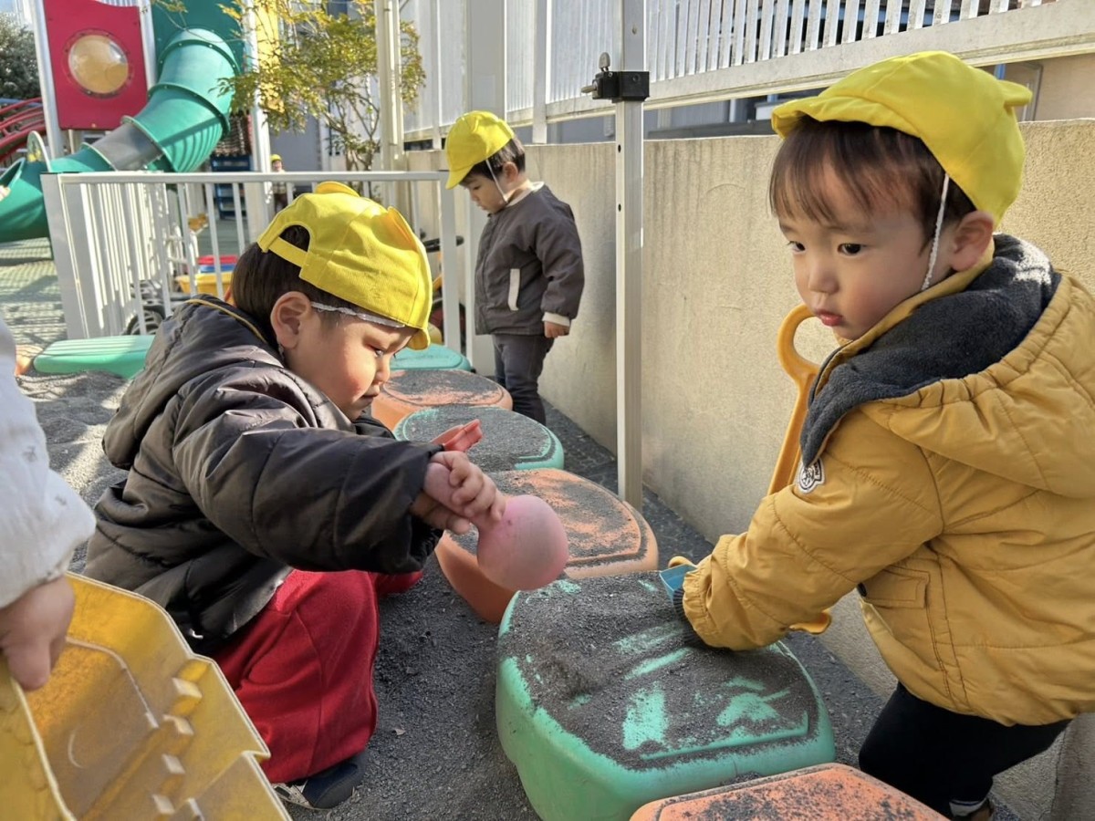 | 園庭で遊びました。追いかけっこをした後はお砂場やスモールハウス、大きないしで遊んでいます。お砂場では大きなスコップを持ってお友達と穴を掘ったり、大きなお山を作って楽しんでいました。型抜きをして崩れてしまうと「もう1回!」と何度も諦めず挑戦していました! |