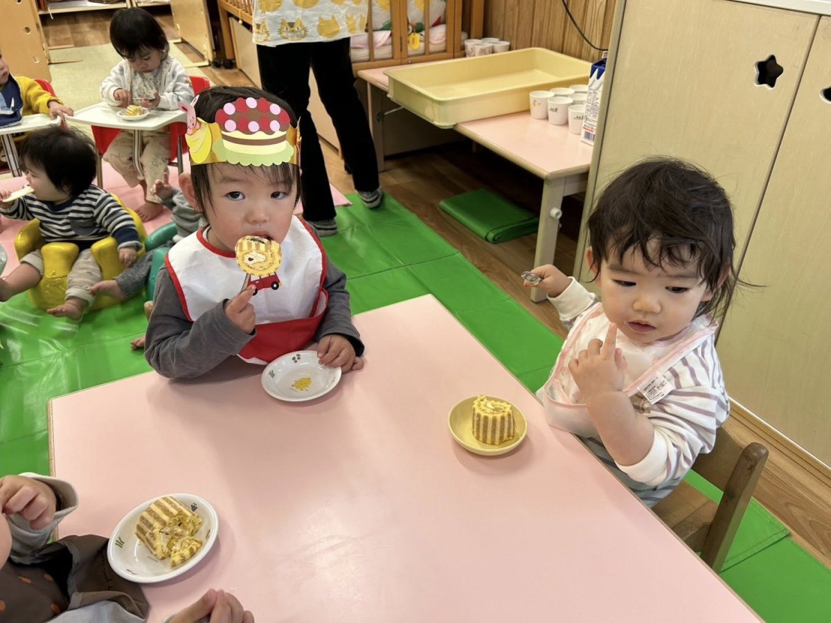 | 今日は毎月楽しみにしているお誕生会に参加しました!ハッピーバースデーの歌はお部屋でもよく歌っていて、音楽が流れると手拍子をしながら歌う姿が見られました。お部屋に戻っても「おめでとうしたね!」「楽しかった!」とお友達や先生とお話しています♪おやつのケーキ、美味しかったね(^^) |