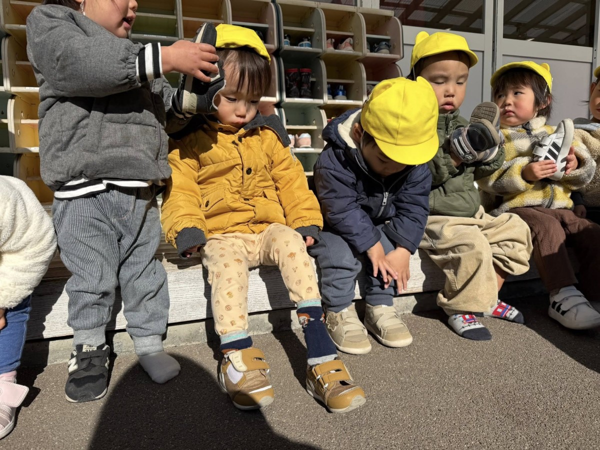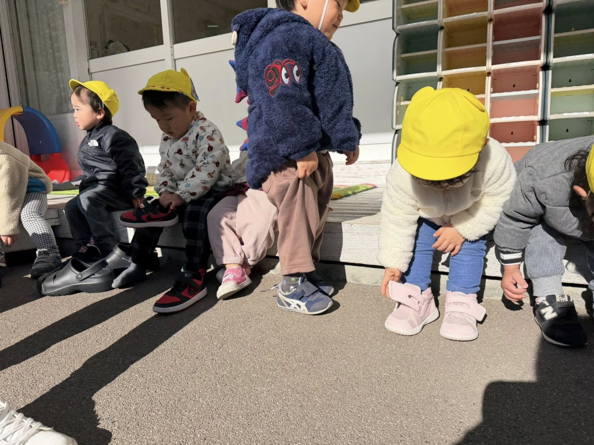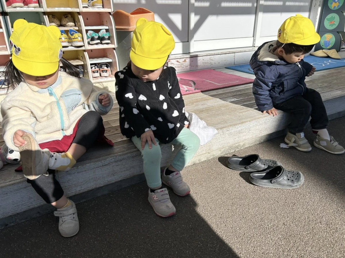 | 靴を自分で履こうと頑張るひよこ組さん。マジックテープを剥がす事は出来ても靴の中に足を入れる事が難しく「出来ないー」「むずかしい」と言いながら頑張っています。履けても左右反対だったりと苦戦していますが、毎日「自分で!!」と一生懸命です!園庭では滑り台や乗り物で遊びました。赤いバイクが人気で常に順番待ちです。ですが、乗っているお友達が乗りたそうなお友達に「乗ってもいいよ」と貸してあげていました。貸して貰ったお友達も他のお友達に貸してくれる姿を見てとてもほっこりしました。 |
