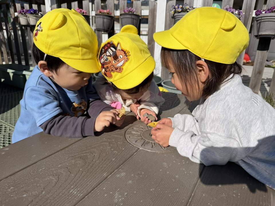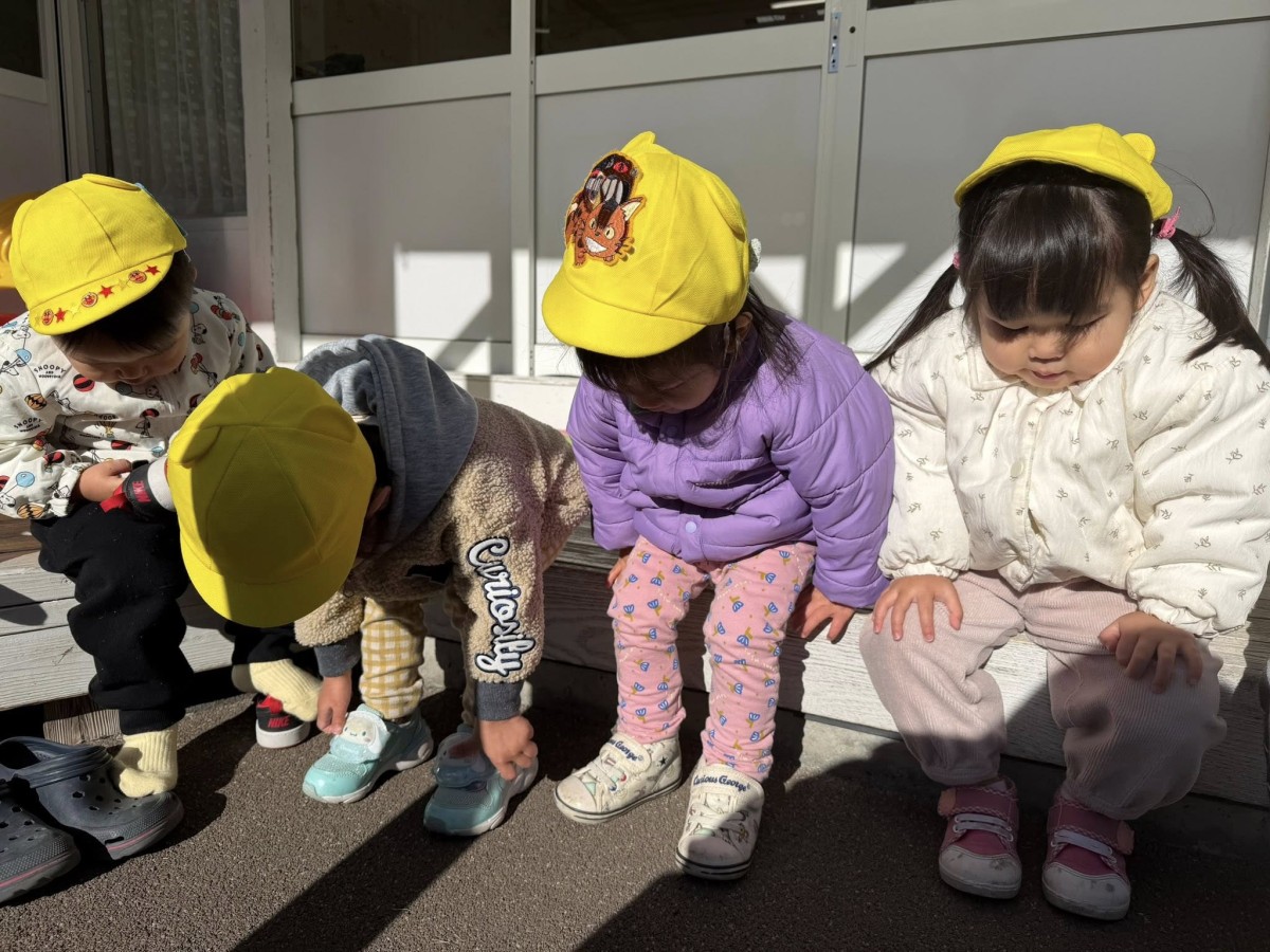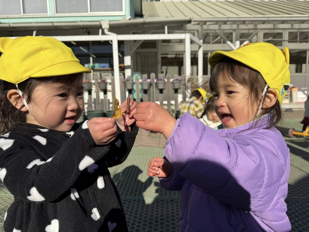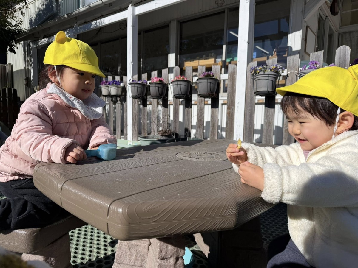 | 園庭で遊びました。葉っぱや小さな石拾いに夢中なひよこ組さん。見つけたものを「先生みてー!」「たくさんあったよ」と自慢してくれたり、お友達同士で見せあって楽しむ姿が見られました。隠れんぼや追いかけっこをしてたくさん身体を動かしました! |