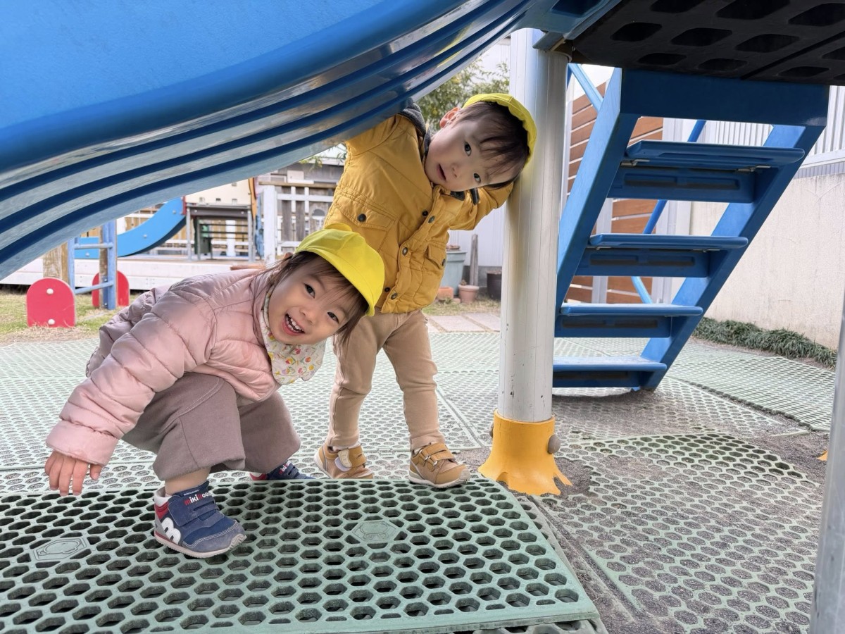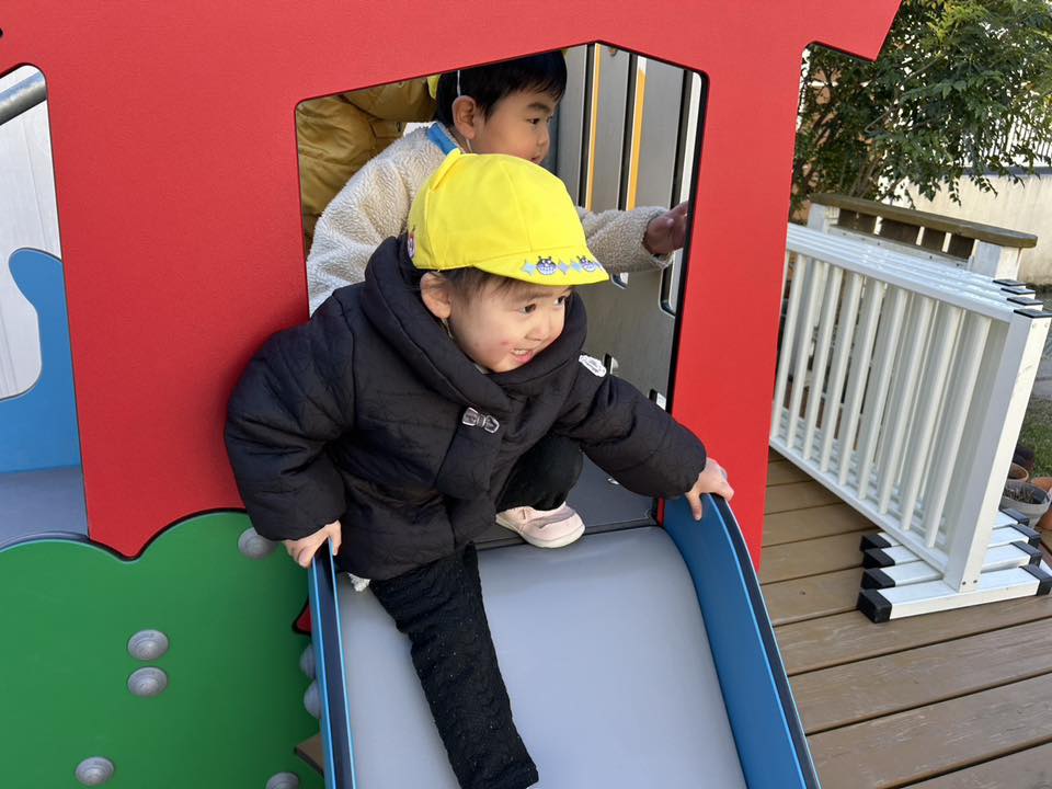 | 園庭で遊びました。追いかけっこではお友達同士「一緒に走ろう」「こっちおいでー!」と声を掛け合い仲良く走る姿が見られました。太鼓橋や滑り台の下に隠れて、「どーこだ!」「みーつけた!」と隠れんぼのように遊んでいました。 |