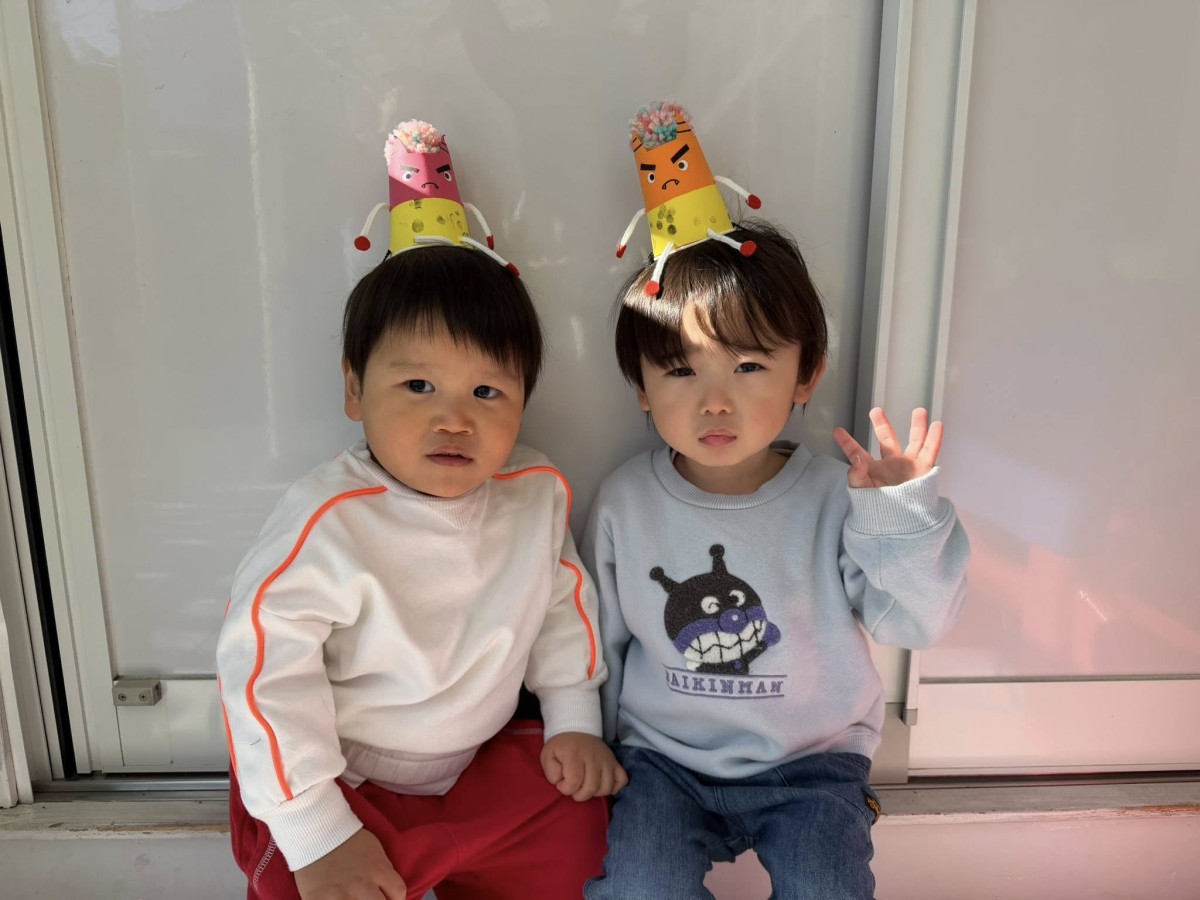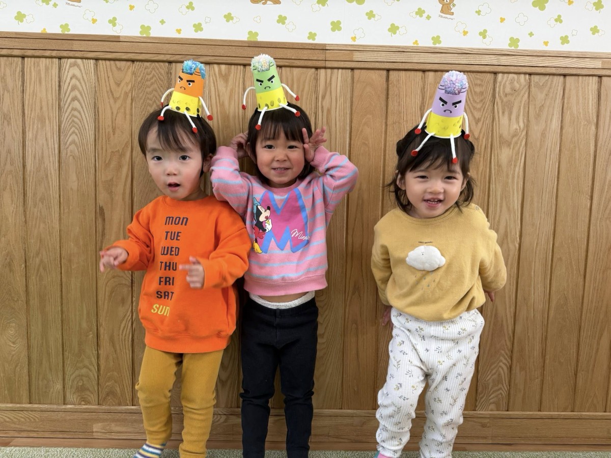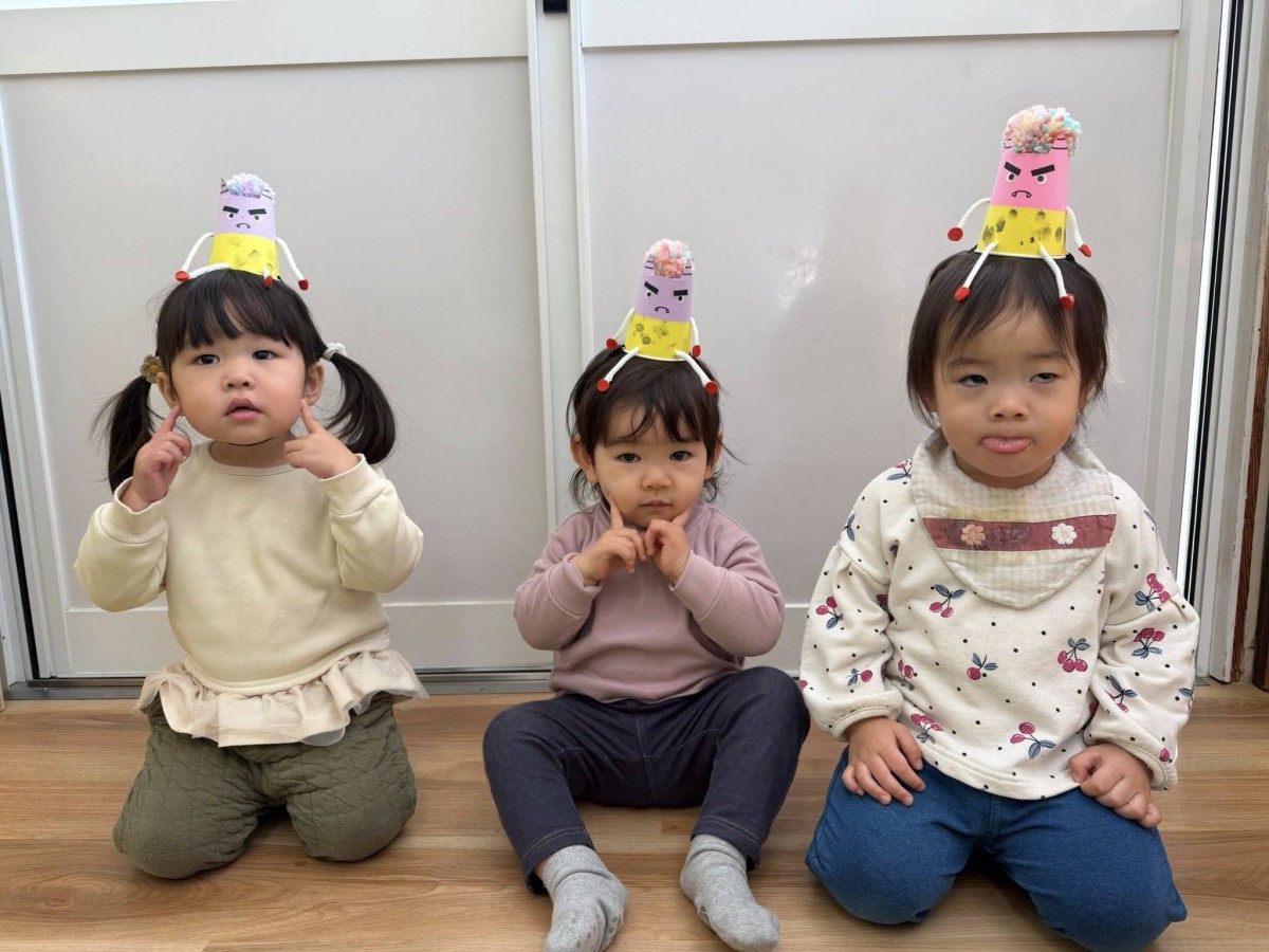 | シール帳にシールを貼る時に、「どうしようかなぁ」「これにしようかなぁ」「今日はこの子にする!」と楽しそうにシール選びをしています。毎日の楽しみになっています♪園庭でたっぷり遊んだ後はお部屋で鬼の制作をつけて写真をとりました。「鬼だぞー!」と言いながらポーズをバッチリ決めてくれました! |