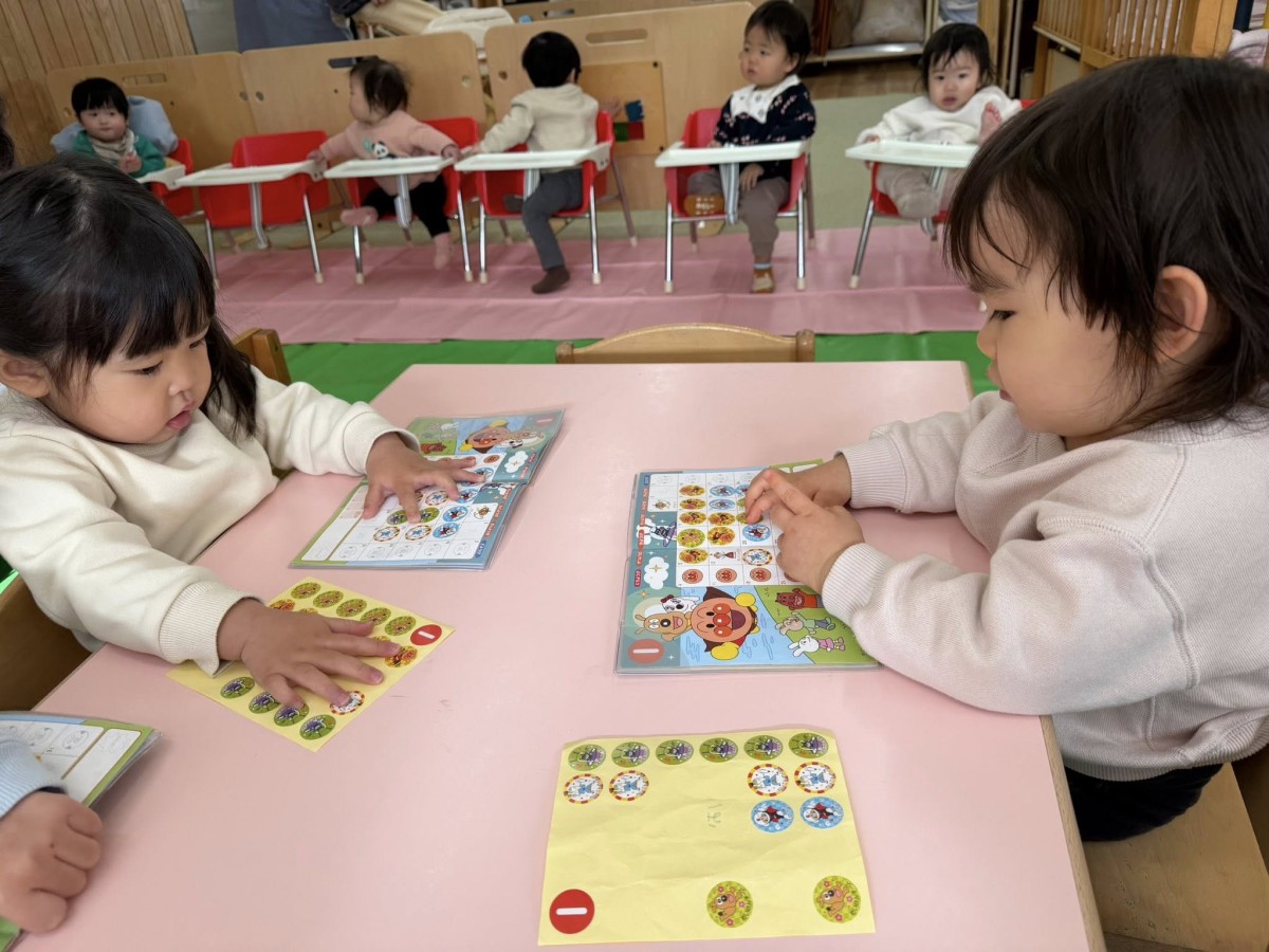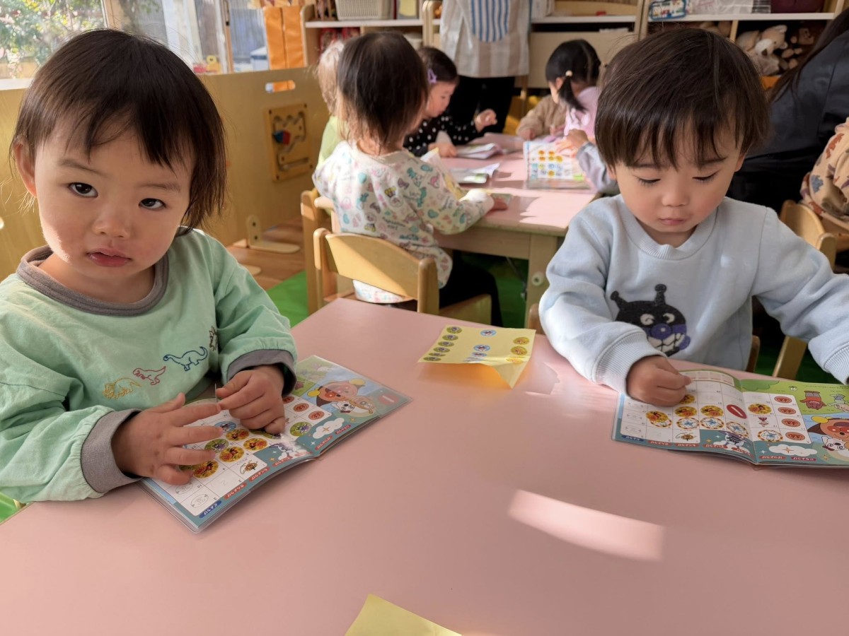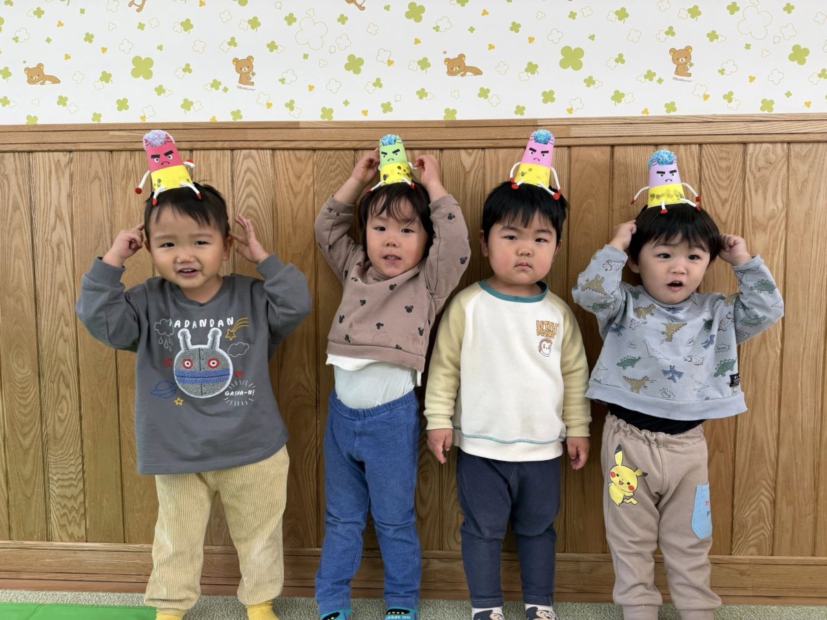 | シール帳にシールを貼る時に、「どうしようかなぁ」「これにしようかなぁ」「今日はこの子にする!」と楽しそうにシール選びをしています。毎日の楽しみになっています♪園庭でたっぷり遊んだ後はお部屋で鬼の制作をつけて写真をとりました。「鬼だぞー!」と言いながらポーズをバッチリ決めてくれました! |