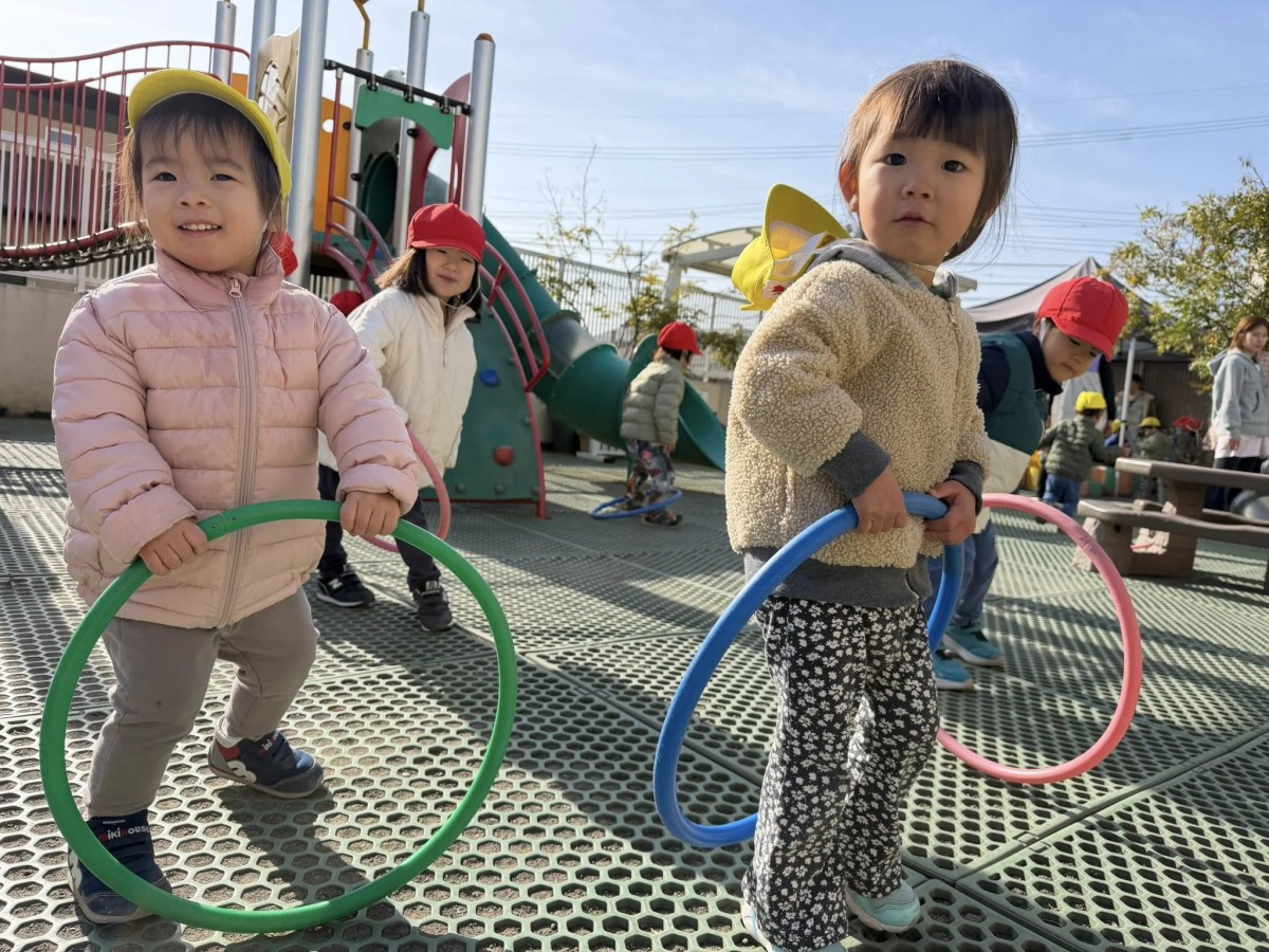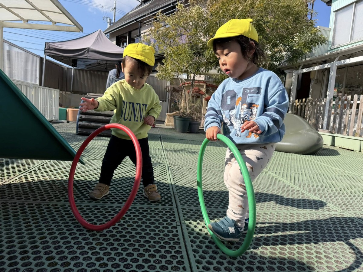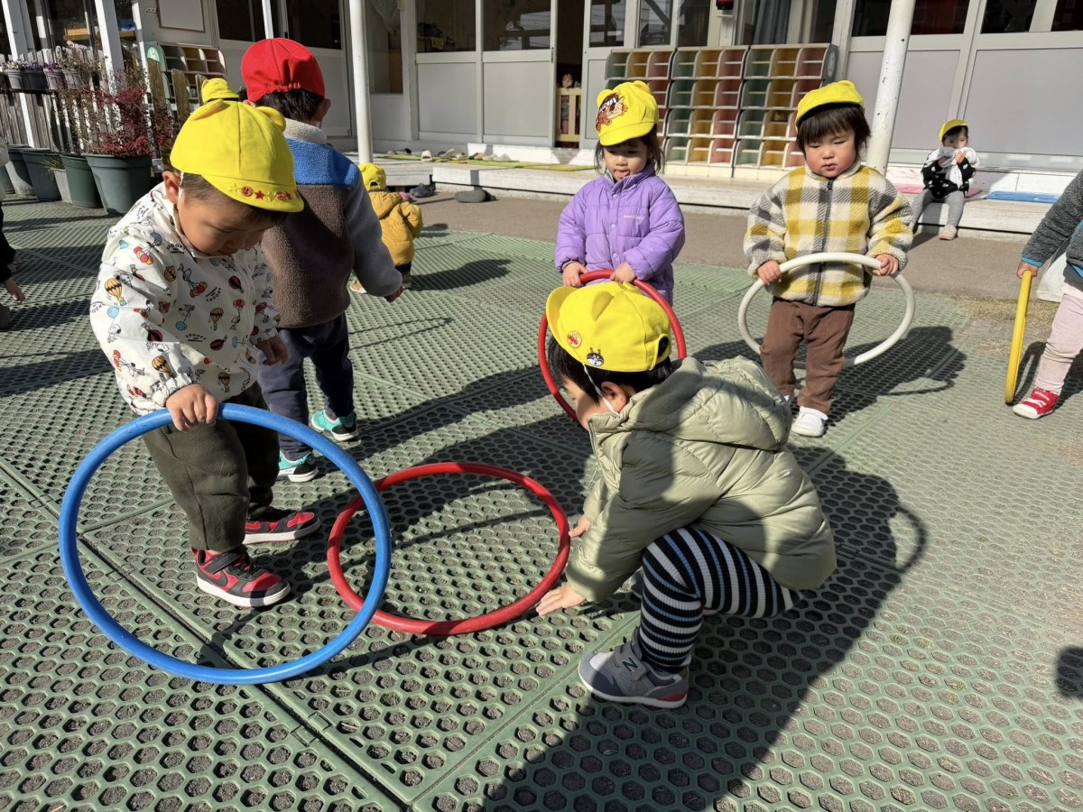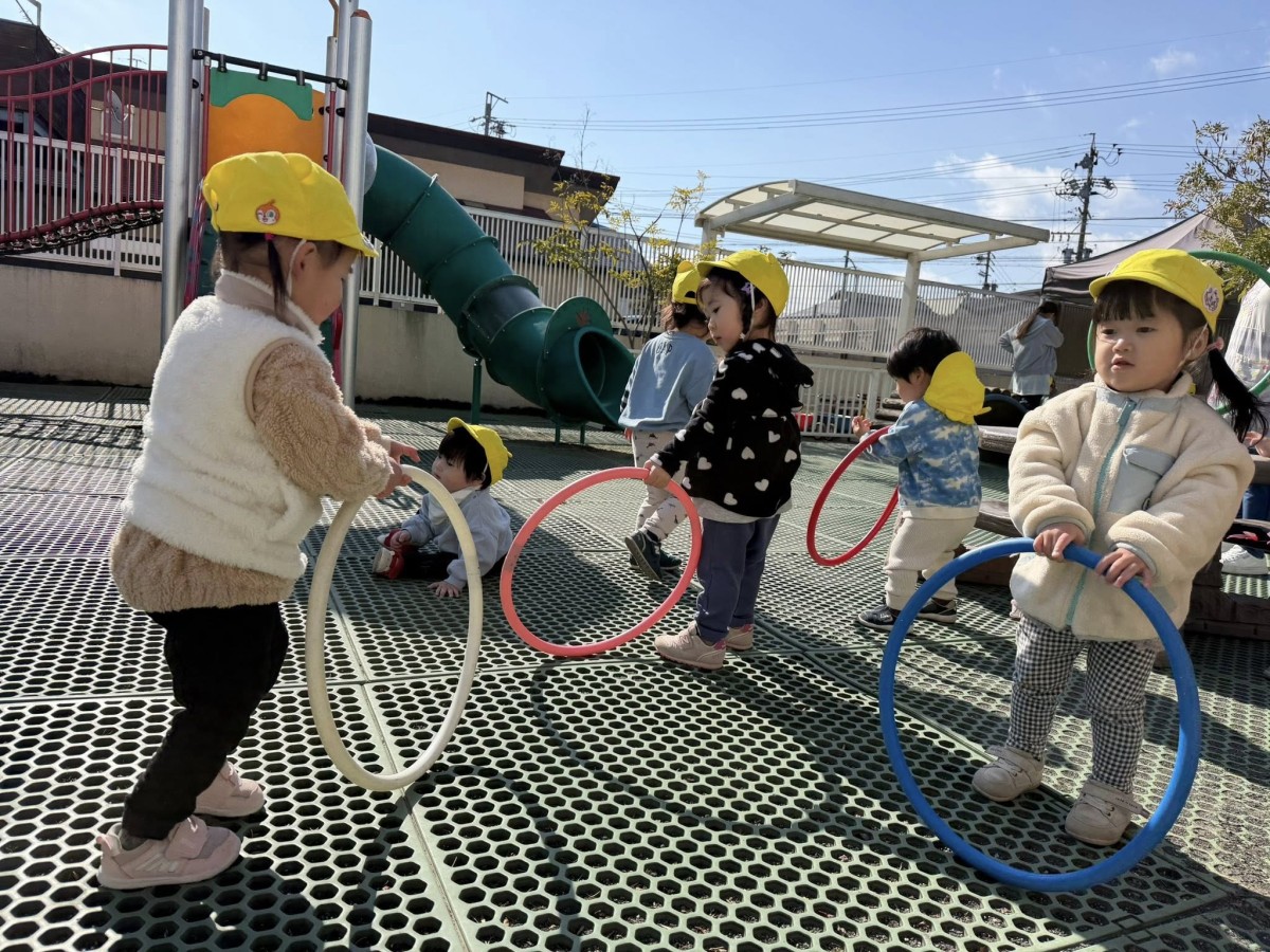 | 今日は園庭でフラフープ遊びをしました。お友達同士で「いくぞー!」とクルクル回したり、輪の中に入り、列になって電車のように歩いたりと楽しむ姿が見られました。フラフープを置いて、先生が輪の中にジャンプしてみると「一緒にやる!」と楽しそうに遊ぶ姿がみられました。 |