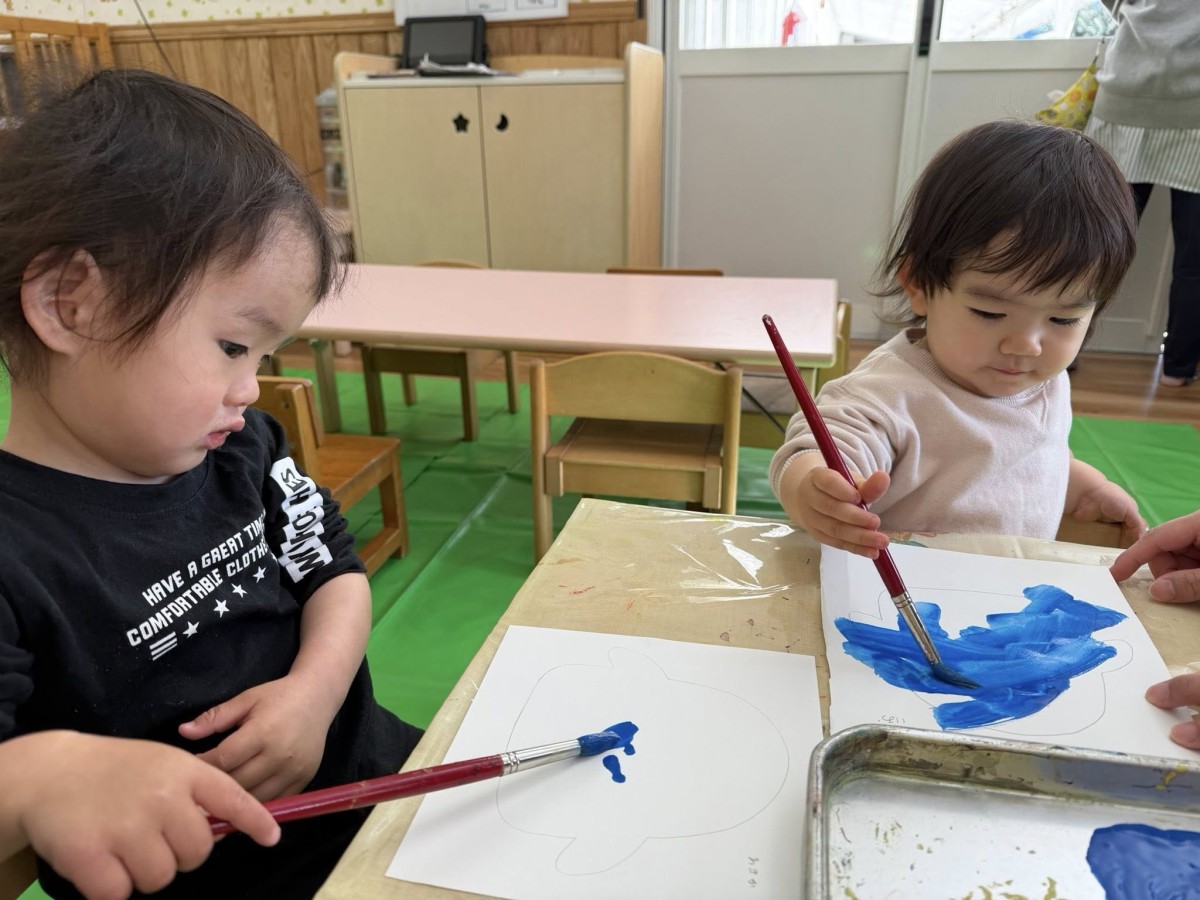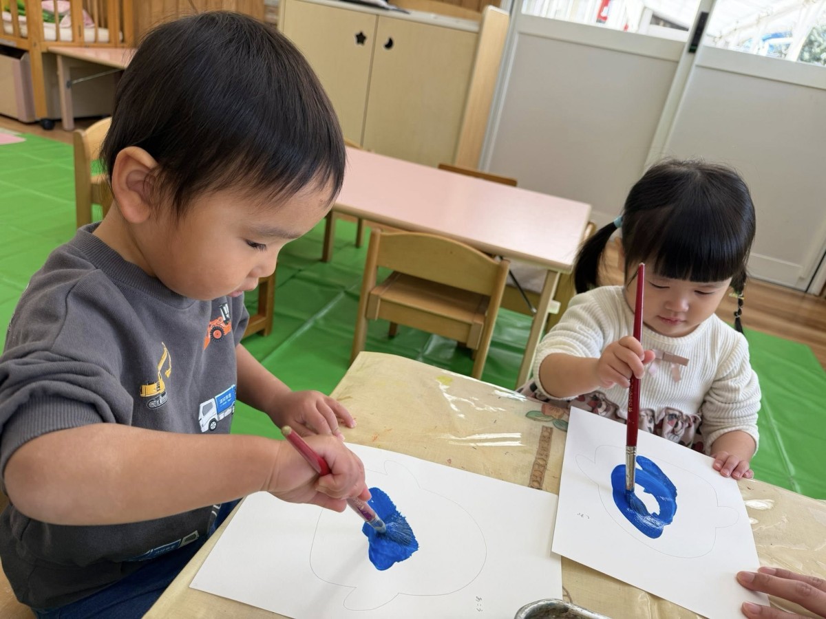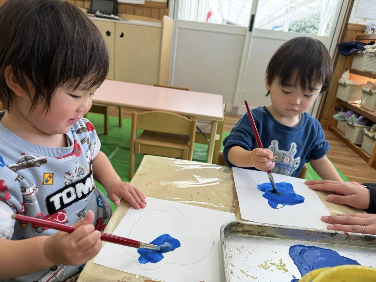| 今日は園庭で遊んだ後はお部屋で制作をしました。白い紙に描かれた線の中を青い絵の具で色塗りをしました。「ここ?」「いっぱいかいていい?」とお話しながら筆を持って塗っています。線からはみ出してしまいますが、こども達なりに慎重にトントンと塗ったり、ゆっくり動かして頑張る姿が見られました。 |