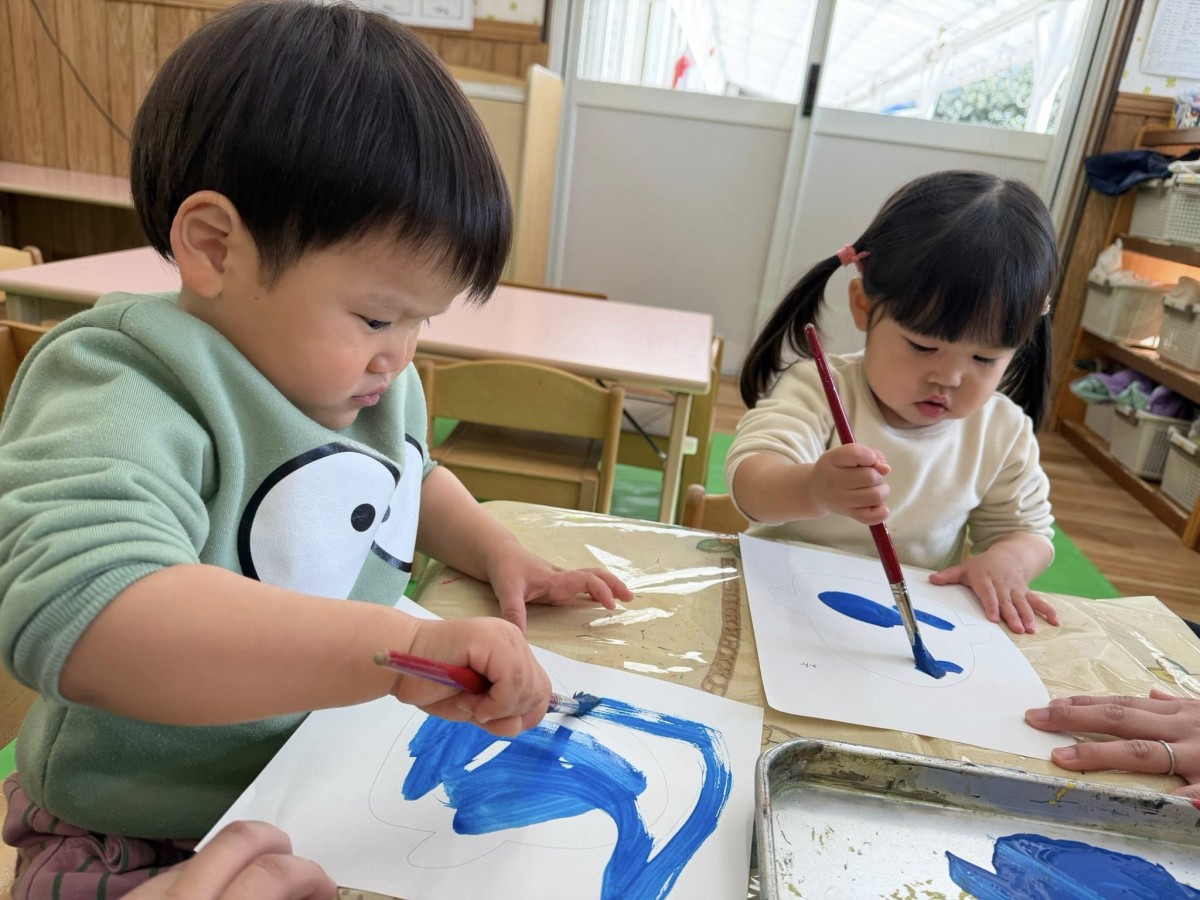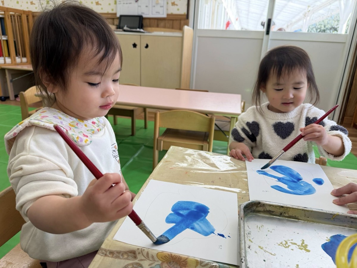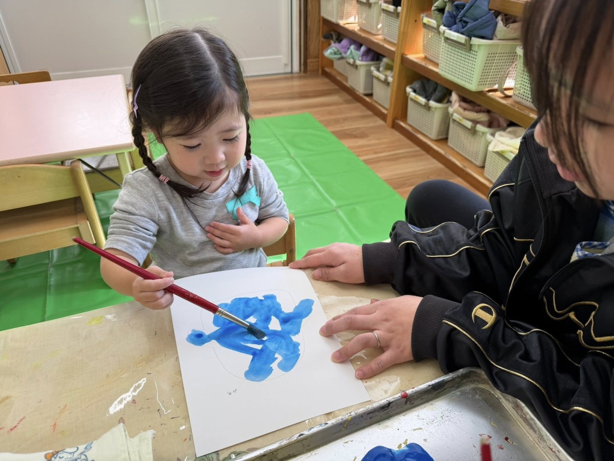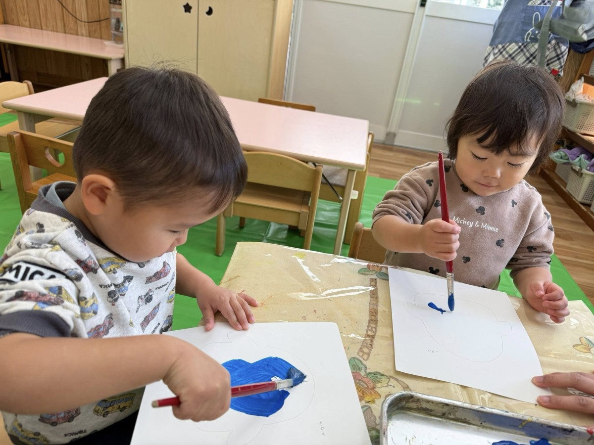 | 今日は園庭で遊んだ後はお部屋で制作をしました。白い紙に描かれた線の中を青い絵の具で色塗りをしました。「ここ?」「いっぱいかいていい?」とお話しながら筆を持って塗っています。線からはみ出してしまいますが、こども達なりに慎重にトントンと塗ったり、ゆっくり動かして頑張る姿が見られました。 |