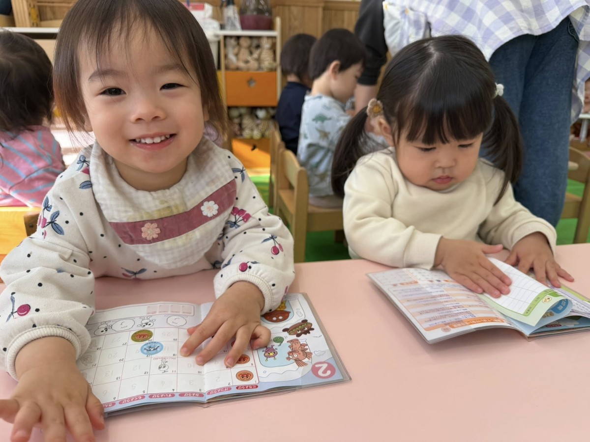 | 毎朝、シール帳に自分でシールを貼ります。「何にしようかな?」「今日はこれにする!」と自分で選んだシールを「ここに貼る?」と聞きながら貼っています。シールの向きや貼る場所にこだわりがあり毎朝の楽しみになっています♪園庭ではお気に入りのおもちゃを持って園庭をお散歩していました。テーブルに並べてお店屋さんのように「ひとつどうぞ〜」「これちょーだい」などのやり取りも見られました。 |
