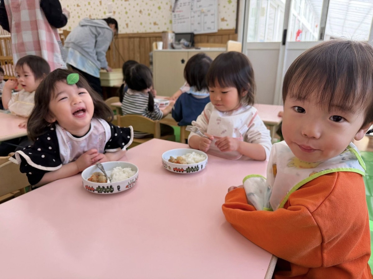 | 園庭で遊びました。最近は滑り台の下や太鼓橋の中に入って隠れんぼを楽しむ姿が見られます。先生やお友達に見つかると「きゃー!」と嬉しそうに逃げていきます♪お給食では配膳をしてからご挨拶をして食べ始めます。手はお膝!と言いながらご挨拶するまで食べずに我慢して待っています。ご挨拶すると「やったー!」と嬉しそうに食べる姿が可愛いです(^^) |