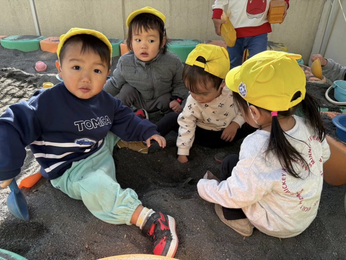 | 今日は園庭で遊びました。三輪車で園庭をドライブしたり、砂場でお砂を集めたりして遊ぶひよこ組さん。途中、飛行機が飛んでいるのを見つけると「飛行機!」「おーい!」と一生懸命手を振っていました。 |