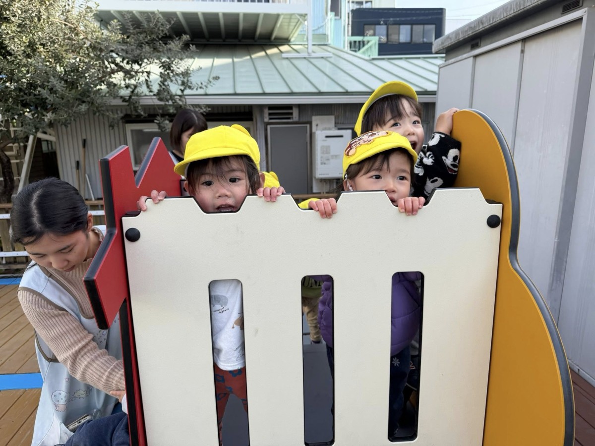 | 園庭では寒かったので最初は追いかけっこをして身体をあたためました!「手が冷たいね」「寒いね」と言いながら元気に走っています。その後はお砂場やおおきないし、スモールハウスで遊びました。早めにお部屋に入り、レゴブロックや制作をして過ごしました。 |