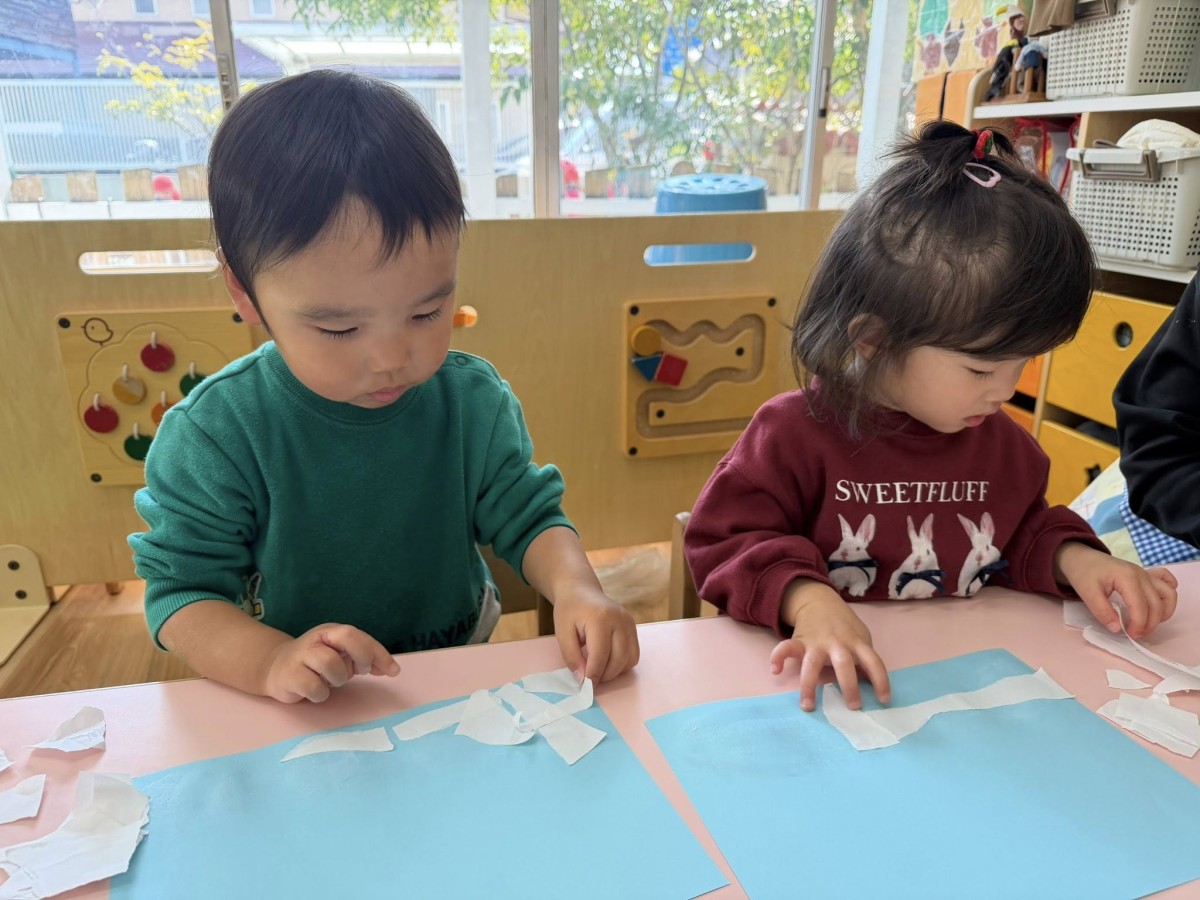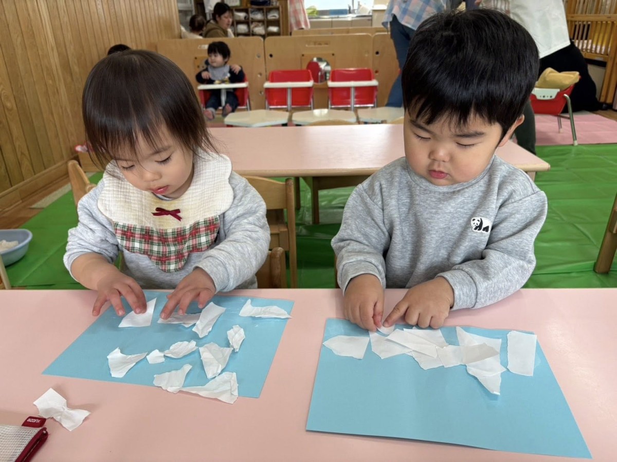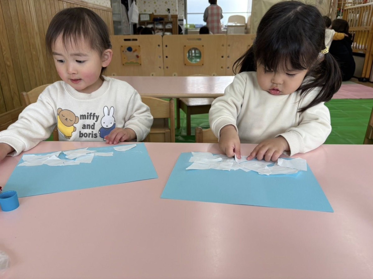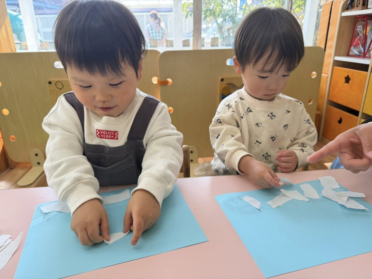 | 園庭では、元気いっぱいに体を動かして遊びました。おおきないしにも挑戦し、登る動きがとても上手になってきています。室内では制作活動を行いました。以前にちぎった白い紙を、先生がのりを塗ったところへ“氷”に見立ててペタペタと貼り、楽しみながら取り組む姿が見られました。遊びや制作を通して、できることが少しずつ増えているひよこ組さんです♪ |