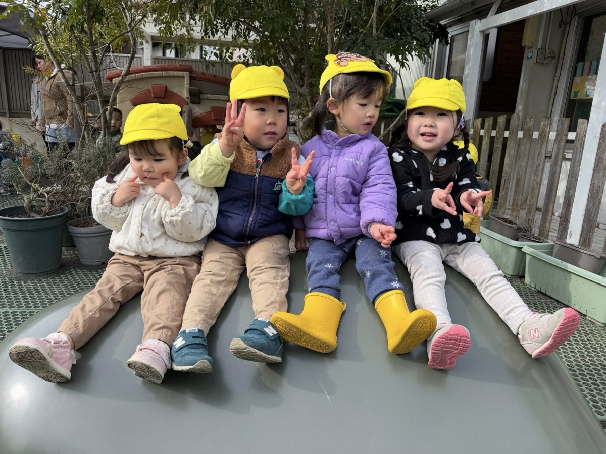 | 園庭で遊びました。追いかけっこの後は滑り台で遊びました。上まで登ると「おーい!」と先生やお友達に手を振ったり、「もう1回!」と何度も滑って楽しむ姿が見られました。お部屋では鬼の制作をしました。 |