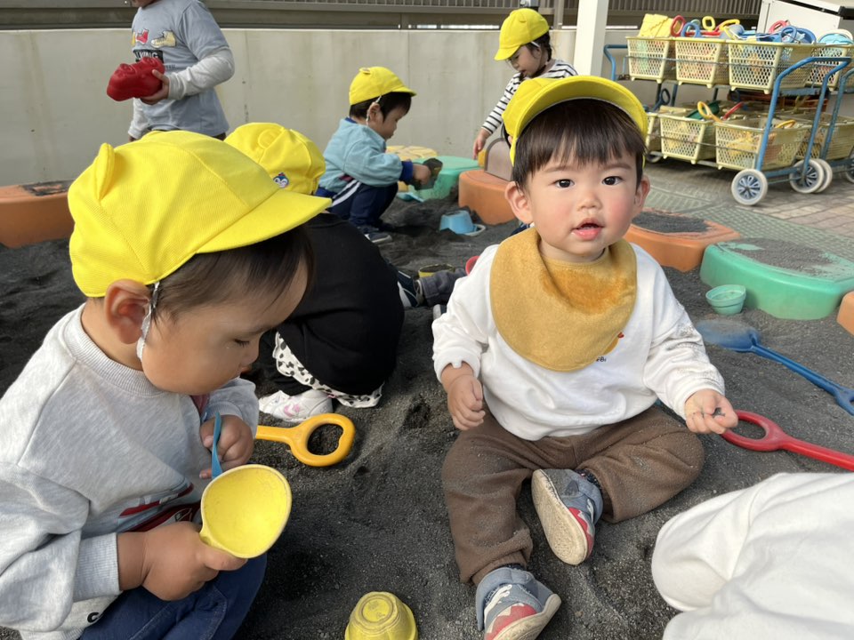 | 園庭と室内に分かれて遊びました。園庭では、1歳児クラスのお友だちが一緒にカップの中に砂を入れてくれたり砂を握っては落として遊んでいるといつの間にかズボンは砂だらけ!思いきり楽しんでいます!お部屋では、段差を登ったりハイハイしたりお友だちと追いかけっこしたり身体を動かしながら遊んでいます。 |