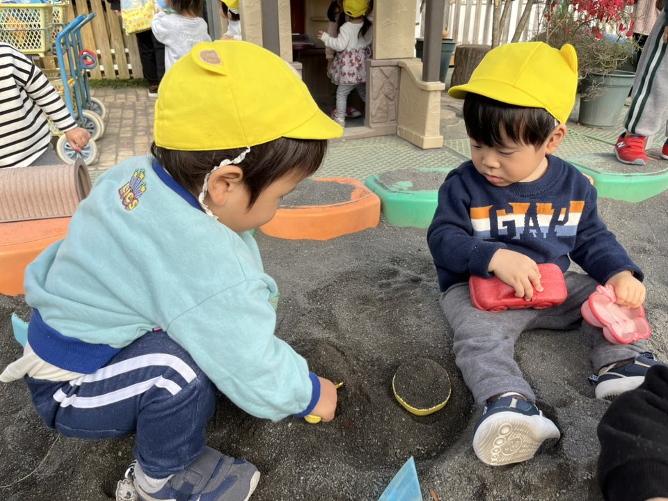 | 今日は園庭とお部屋に分かれて遊びました。お砂場に座って車やカップの型に砂をつめて遊んでいます。ひっくり返して見せると出来上がった姿に喜ぶ様子を見せ、もう一回と楽しんで遊んでいました。 |