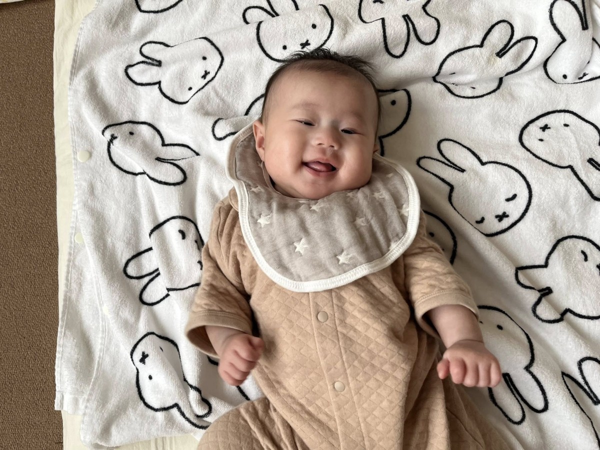 | 園庭にピクニックシートを敷いて遊びました。心地よくてお友だちも嬉しそうでした。お砂を見つけると夢中になって触ったり、シートの上をハイハイや歩いてたくさん動いたりしていました。ゴロンと寝転んでとても気持ちよさそうでした♪ |
