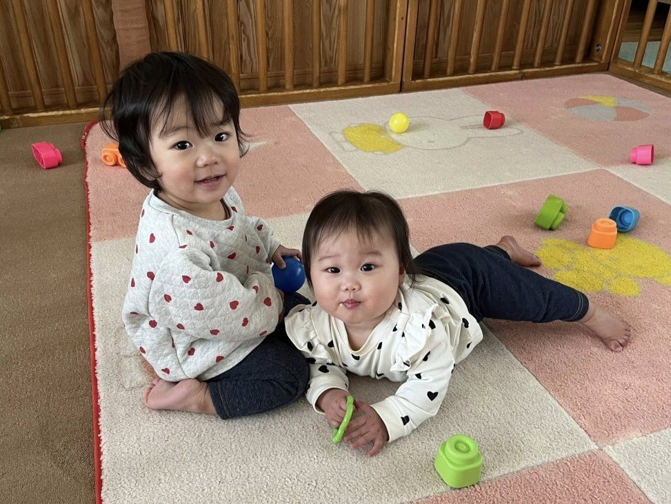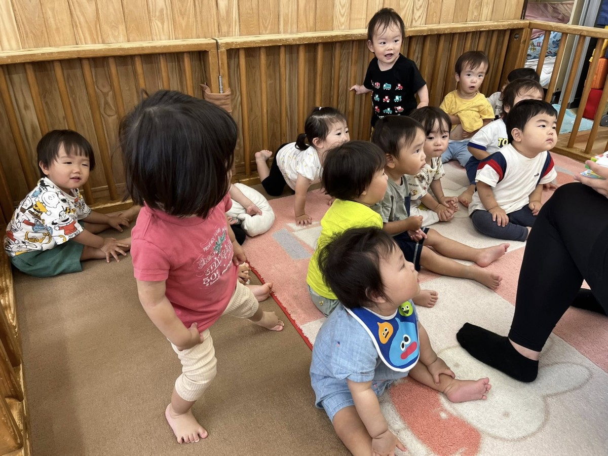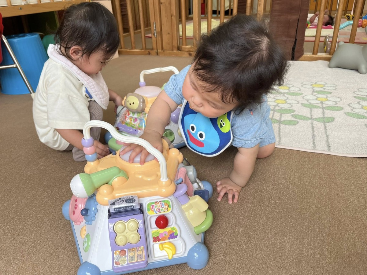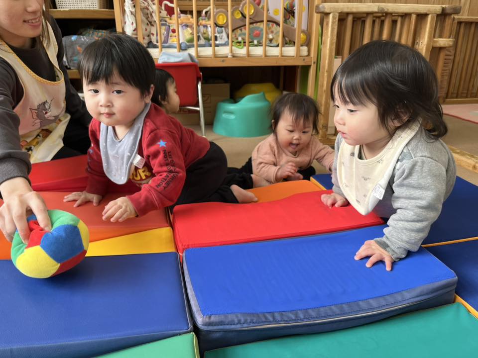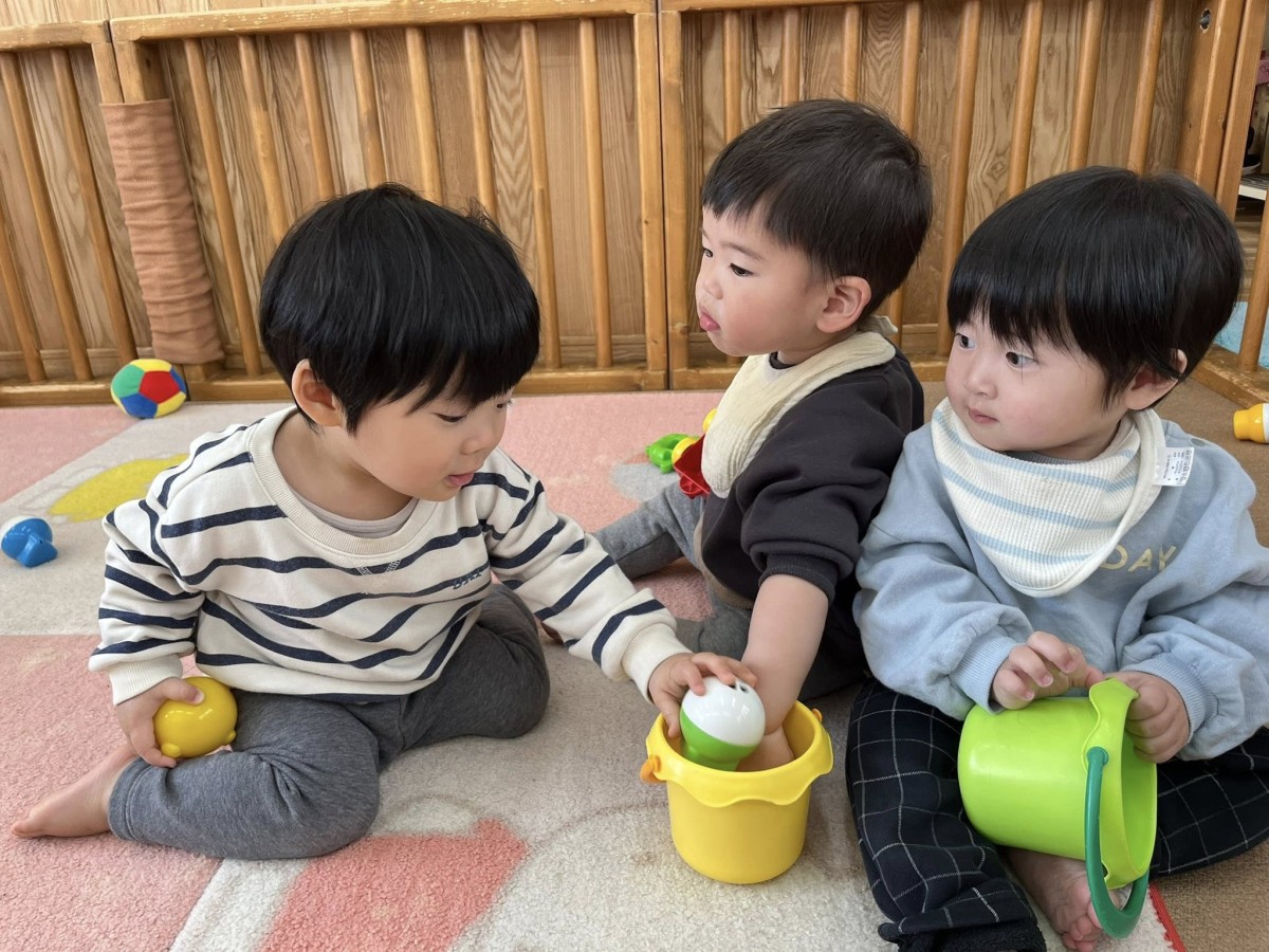 | 室内で遊びました。活発に動くようになったお友だち。ハイハイ、伝い歩き、歩行などお部屋中を探索しています!お友だちの遊ぶ姿を見て同じ遊びをしてみたり、ハイハイで追いかけっこをする等一緒に遊ぶ姿も少しずつ増えてきました。 |