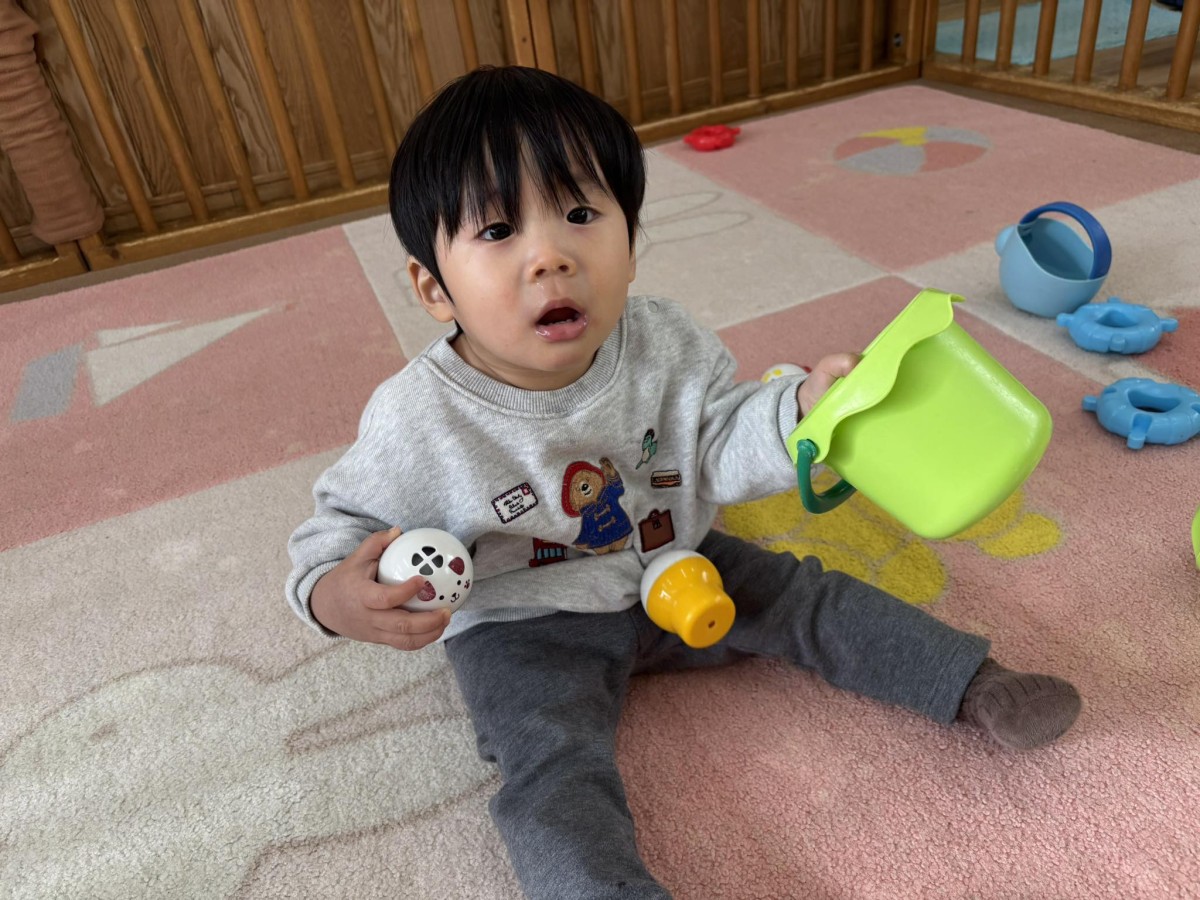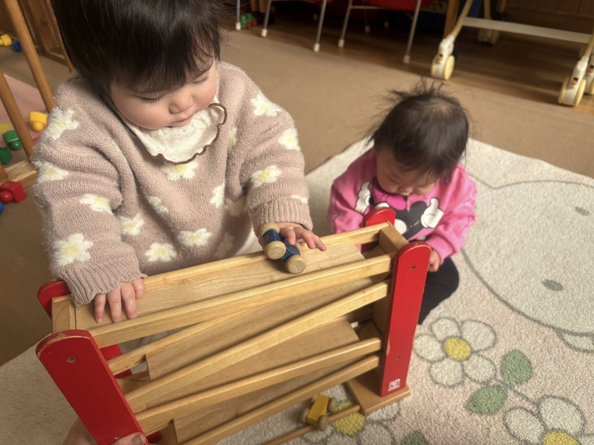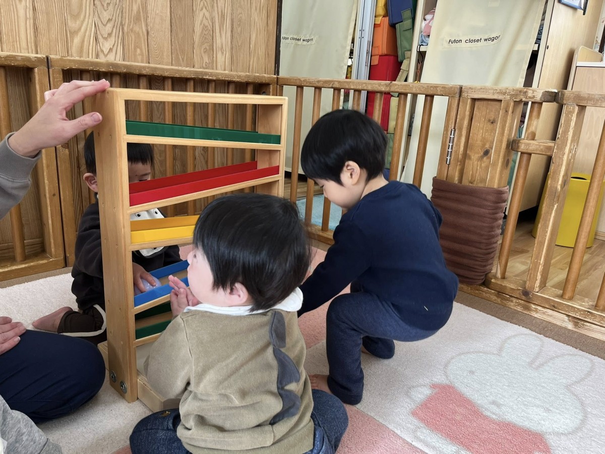 | 園庭と室内に分かれて遊びました。園庭では、1歳児クラスのお友だちとたくさん走り、室内にいるお友だちを見つけると手を振っていました!室内では、ミッフィーを一緒に積んで遊んでみたり型はめの木のおもちゃに挑戦したりしました。型はめはいくつかの形を同じ形の枠にはめることができて保育士を驚かせてくれました。 |