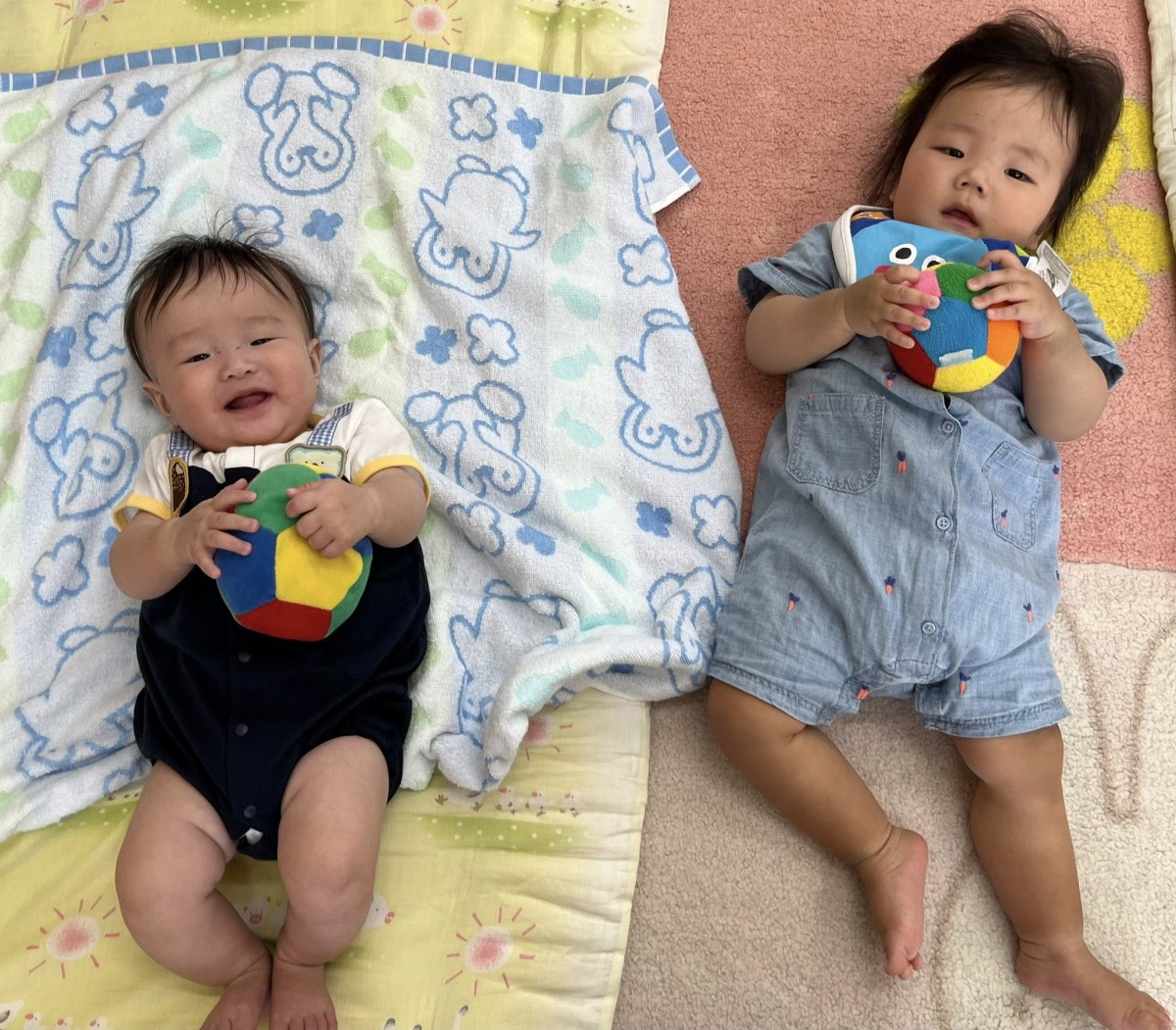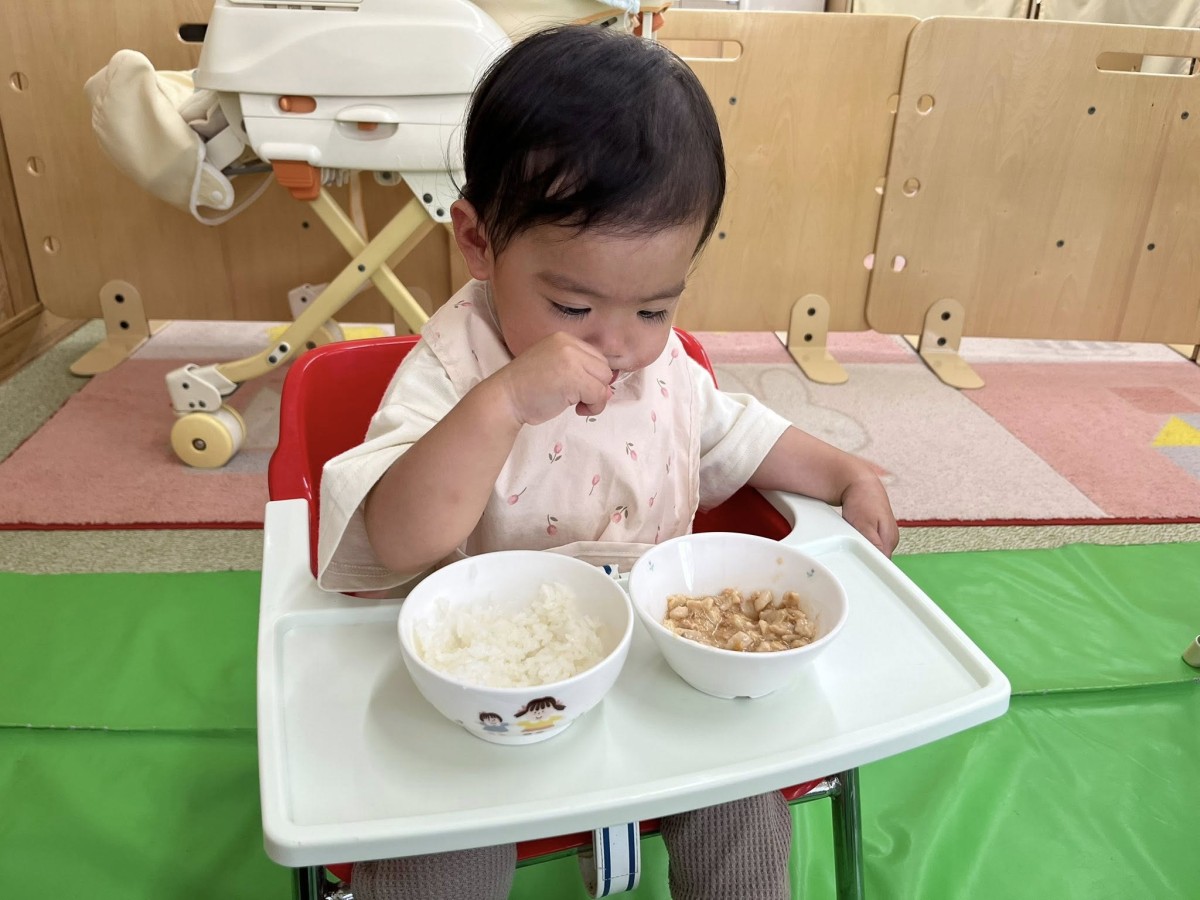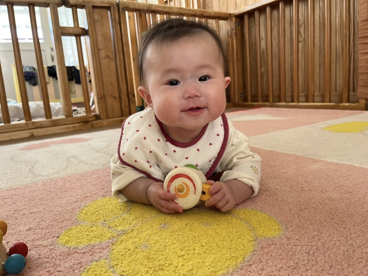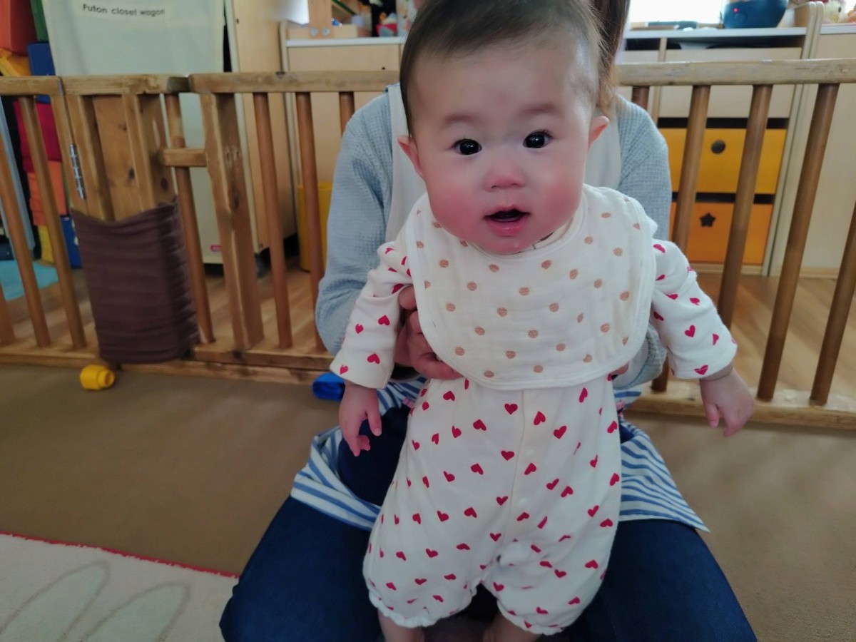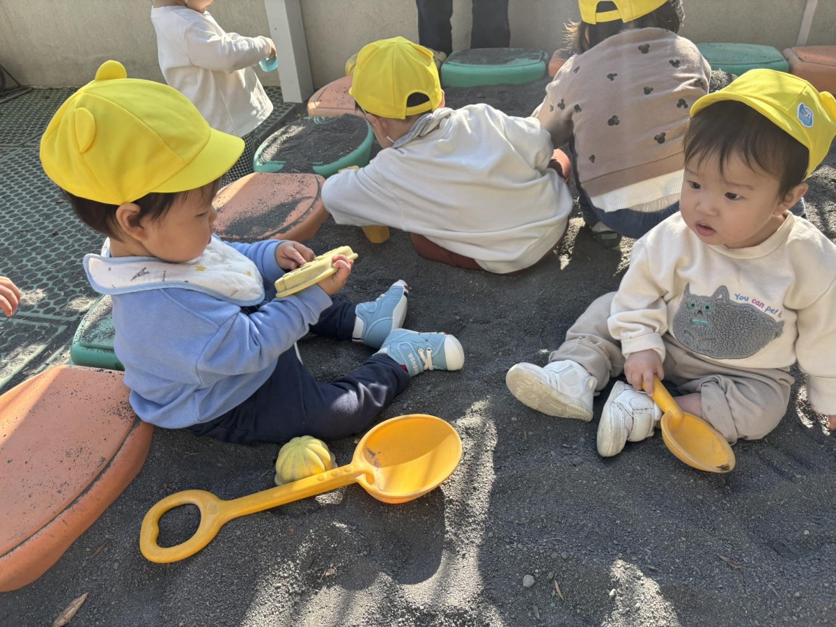 | 1日より新しいお友だちが入園し12人になりました。ミルクも飲みぐっすり眠り、いいお顔も見せてくれます。今日はお部屋と園庭に分かれて遊びました。室内ではハイハイでみんなで追いかけっこをしていました。隅っこまで行って逃げ場がなくなるとみんなで顔を見合わせて笑っていました。園庭ではお砂遊びに夢中でした。 |