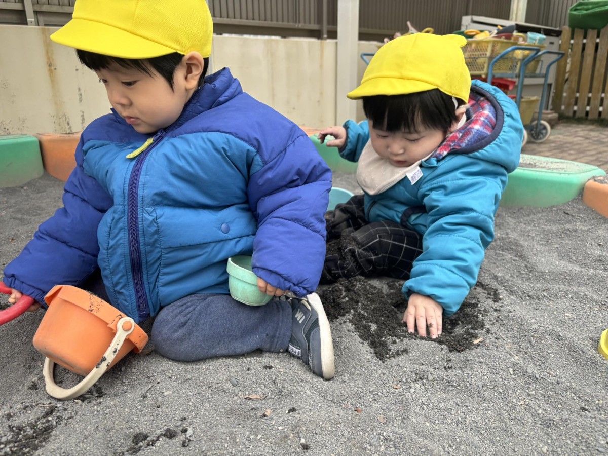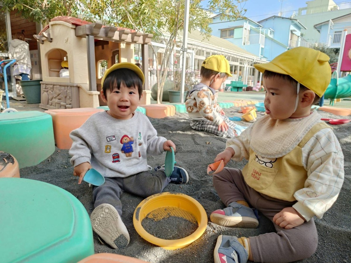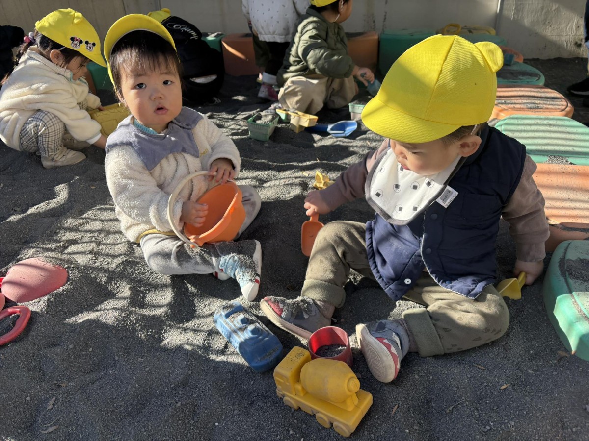 あけましておめでとうございます。本年もよろしくお願いいたします。 今日はみんなで園庭に出て遊びました。歩けるお友だちは靴を履き、他のお友だちは砂場近くに敷いたピクニックシートの上で遊びました。シートの上に砂を落とすと「ざあっ」といい音が聞こえてきて何度も砂を落として遊んでいました。年賀の式にも参加しました。 |