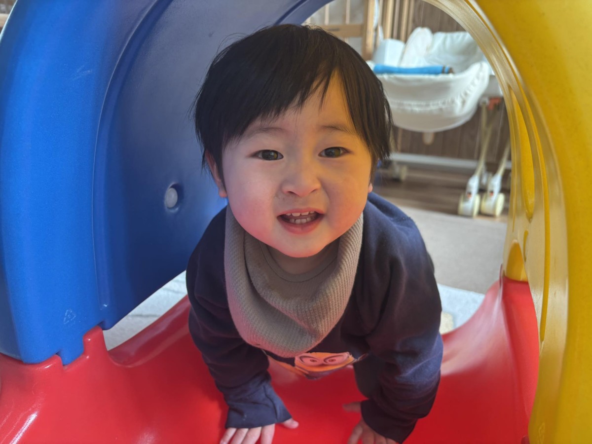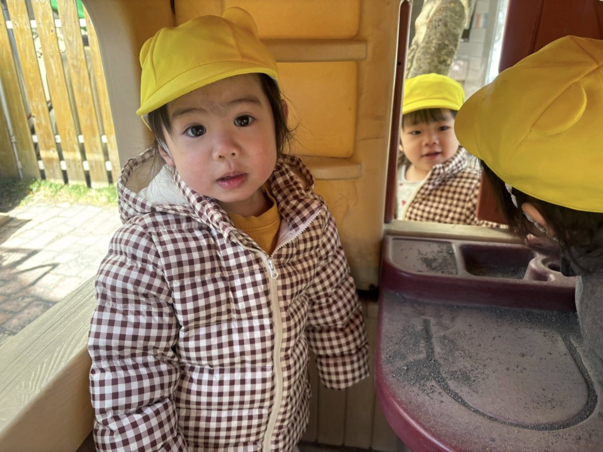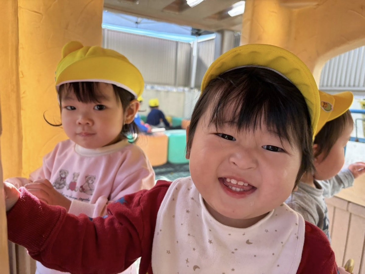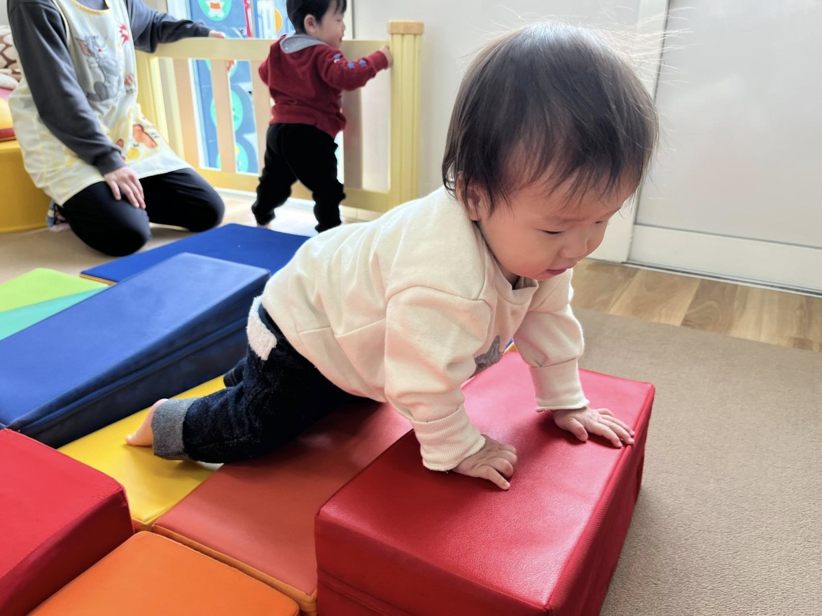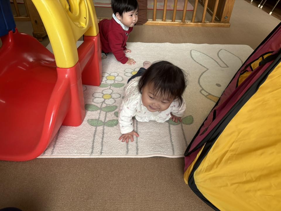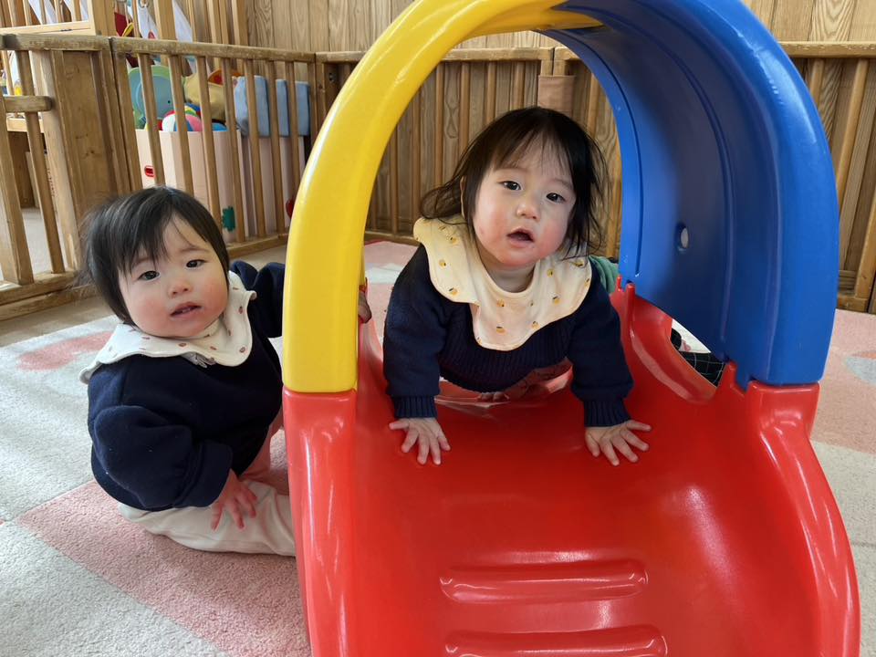 | 室内で遊びました。段差を登れるようになったお友だち。得意の飛行機ポーズを見せてくれました!座りながらピョンピョン跳ねてみたり、トンネルすべり台につかまって保育士が色んなところから顔を出すのを喜んでいました!ベビージムで遊ぶお友だちは、鏡に映った姿を不思議そうに見ていました。 |