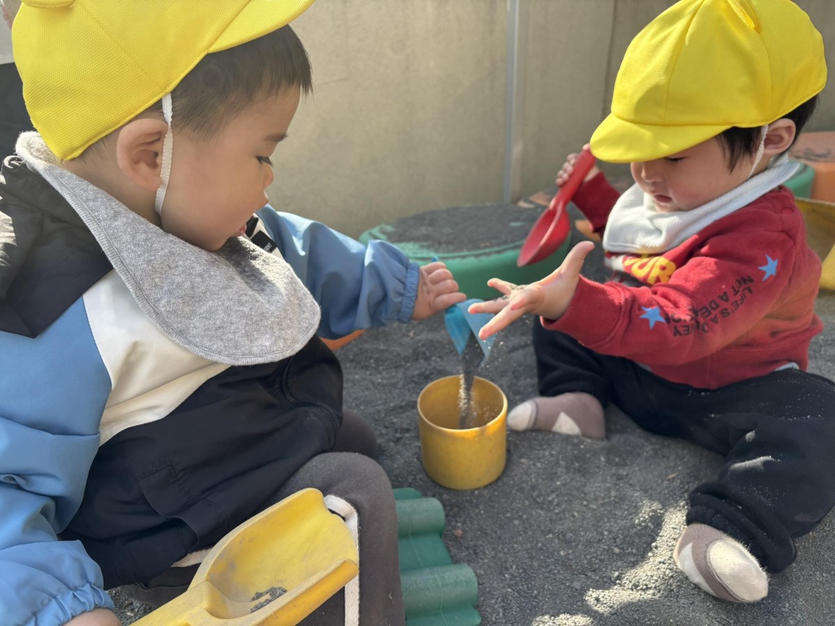 | 今日は園庭やお部屋で遊びました。お砂遊びがすっかり上手になって近くにあるスコップなどを使って砂を掬ってカップやお友だちが作っている山に積んでいました。お部屋では外の様子を仕切に見ていました。 |