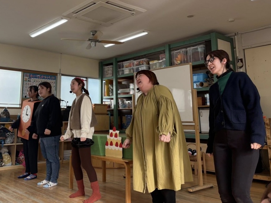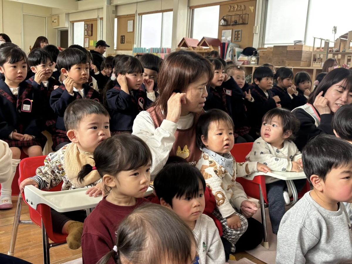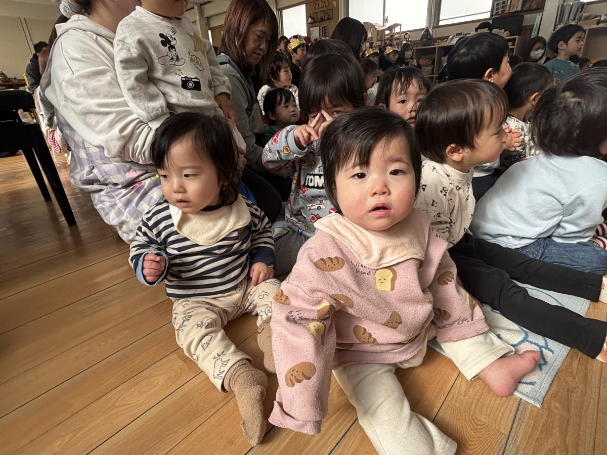 | 今日はお誕生会に参加しました。1月生まれのお友だちも大勢のお友だちの前でもニコニコご機嫌に過ごしてくれました。保育士によるオペレッタ「こびとのくつや」も夢中でみんな見てくれました。 |