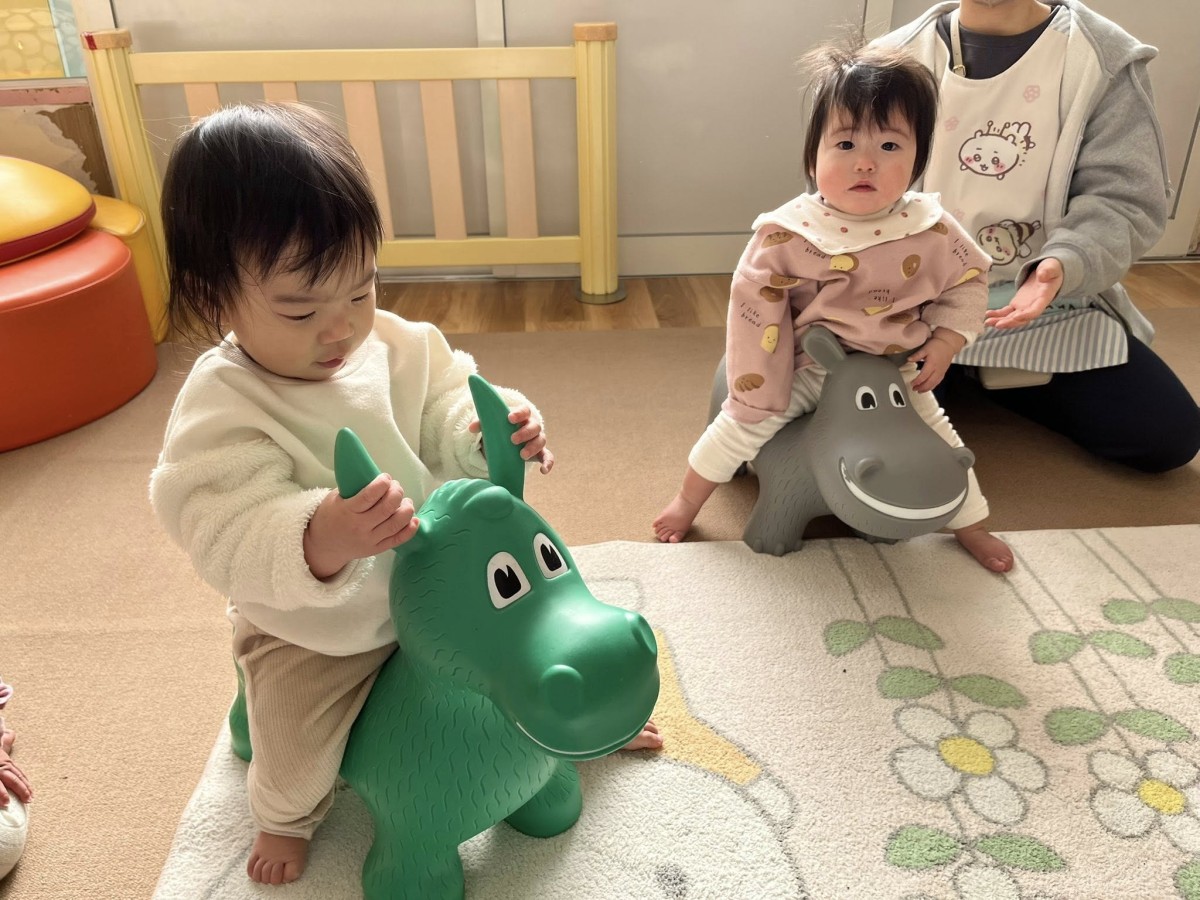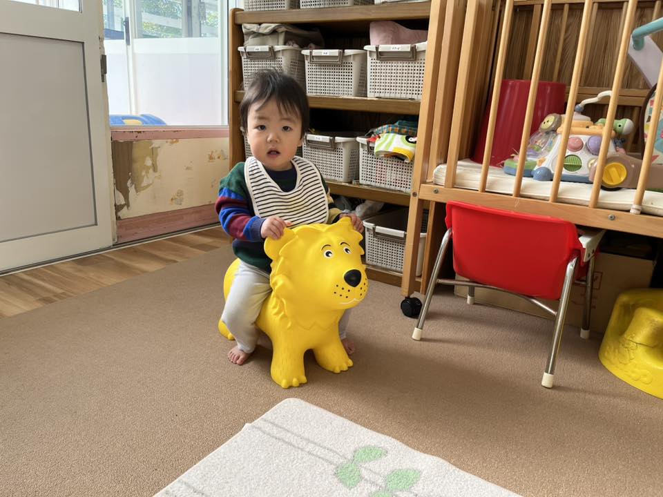 | 園庭と室内に分かれて遊びました。園庭では、保育士と手を繋いで「イチ、二」と歩いたりお気に入りの玩具を手に探索を楽しんだりしていました。お部屋ではロディに乗り、ぽよんぽよんと跳ねる感覚が面白いようで喜んで乗っていました。ワニの引き車やボールでも遊びました。 |
