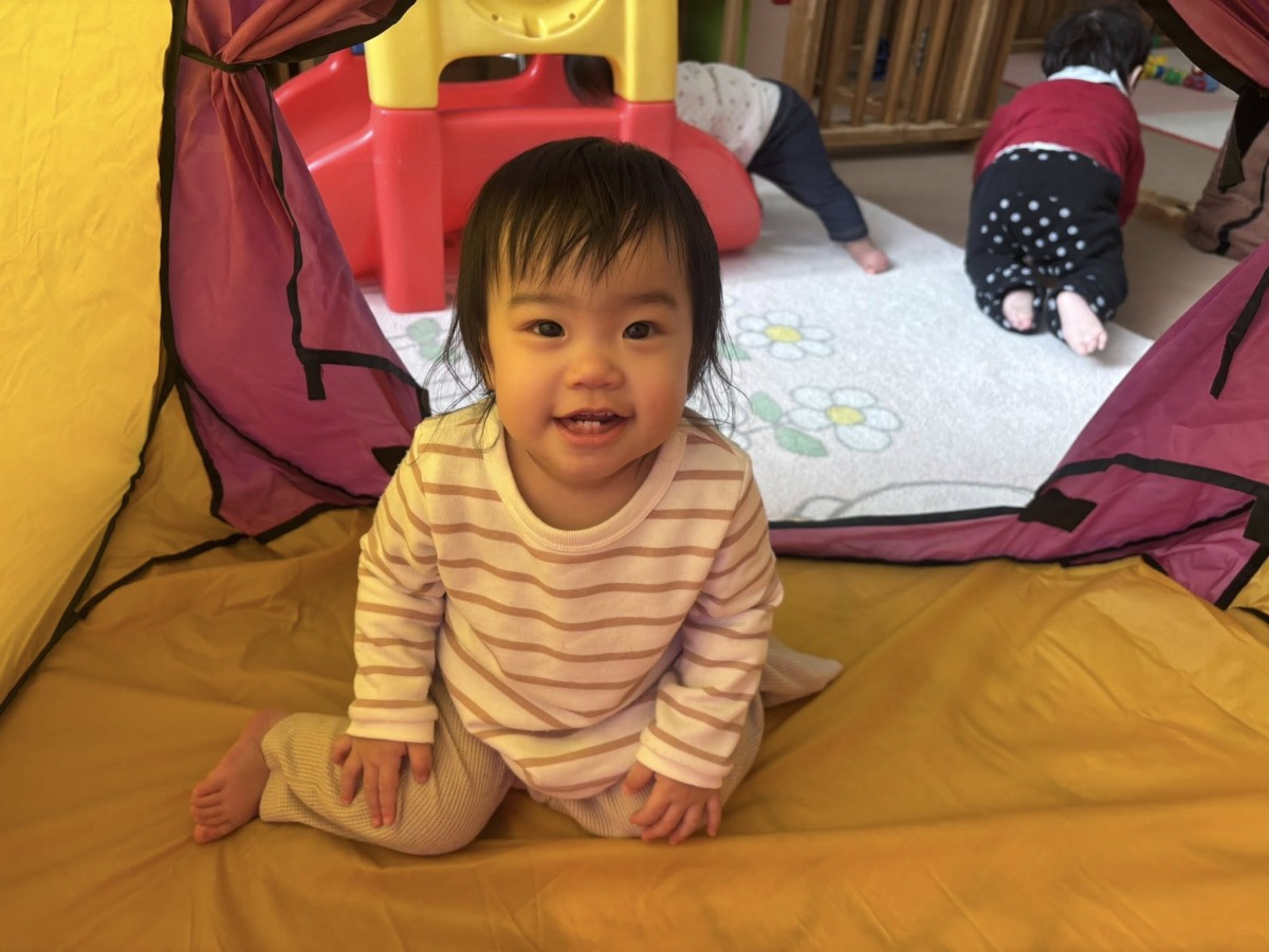 | 園庭にピクニックシートを敷いて遊びました。柵につかまっていると1歳児クラスのお友だちが来てタッチしたりお話したり嬉しそうでした!お砂を見つけるとシートの外まで触りに行くお友だちもいました。お部屋では、ミニテントで遊びました。今まで見ているだけだったお友だちも、お友だちと一緒に入ることができボールを投げたり寝転んだりして楽しんでいました。 |