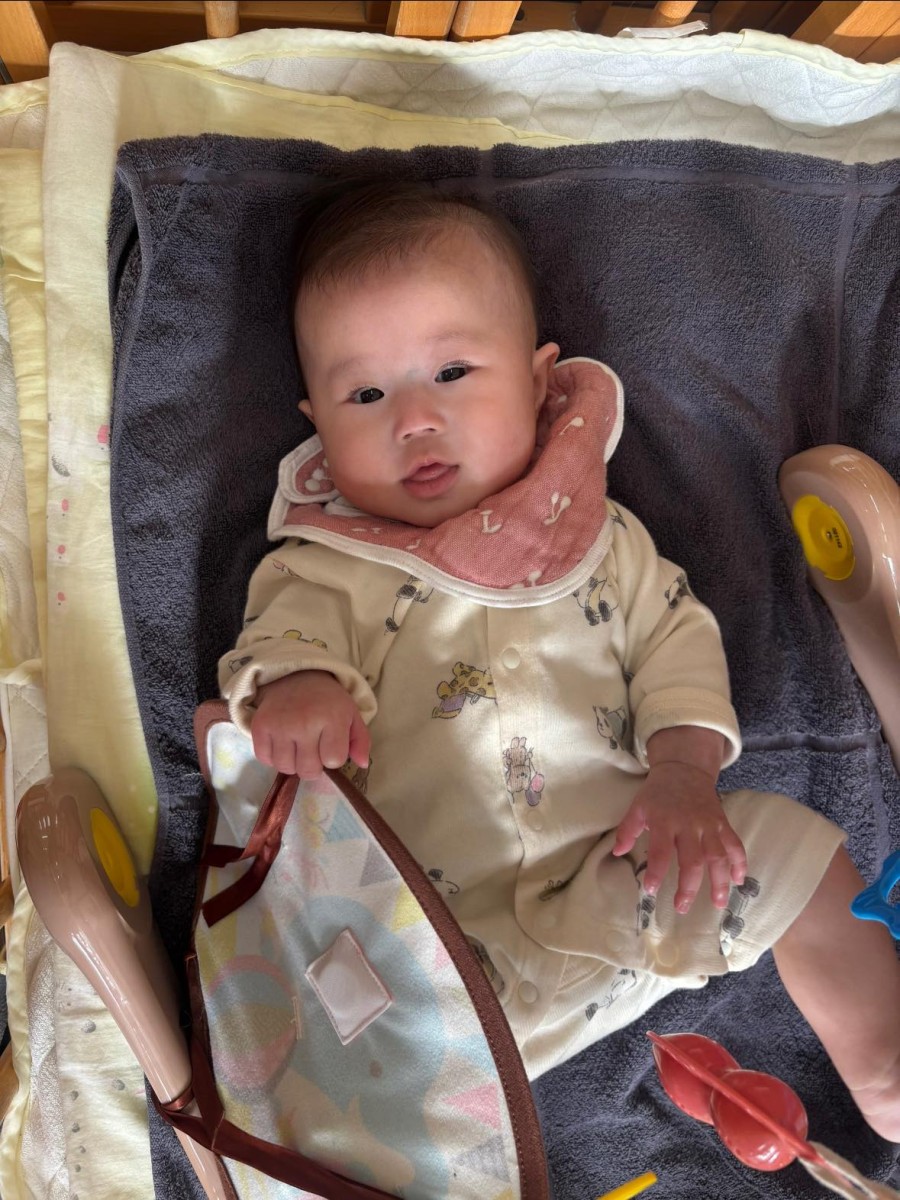 | 室内では絵の具を使った手形スタンプをしました。手をギュッと握って絵の具の感触を楽しんでいました。その後は、ベビーカーに乗ってお散歩に行きました。色々な発見を指差ししながら教えてくれましす。保育士が赤ちゃんを抱っこしていると、よしよしと頭を撫でてくれるお友だちもいます♪ |