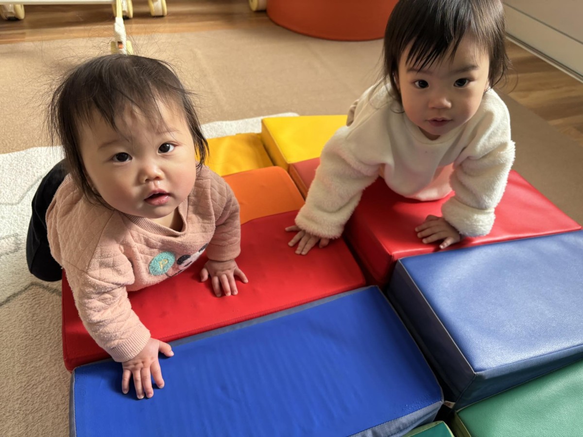 | 今日はお部屋で遊びました。階段マットが見えると歩いたりずり這いをしたりして登って遊んでいました。ドアを開けて園庭が見える空間を作ると横並びになって仲良く外を見ている姿がとても可愛いです。 |