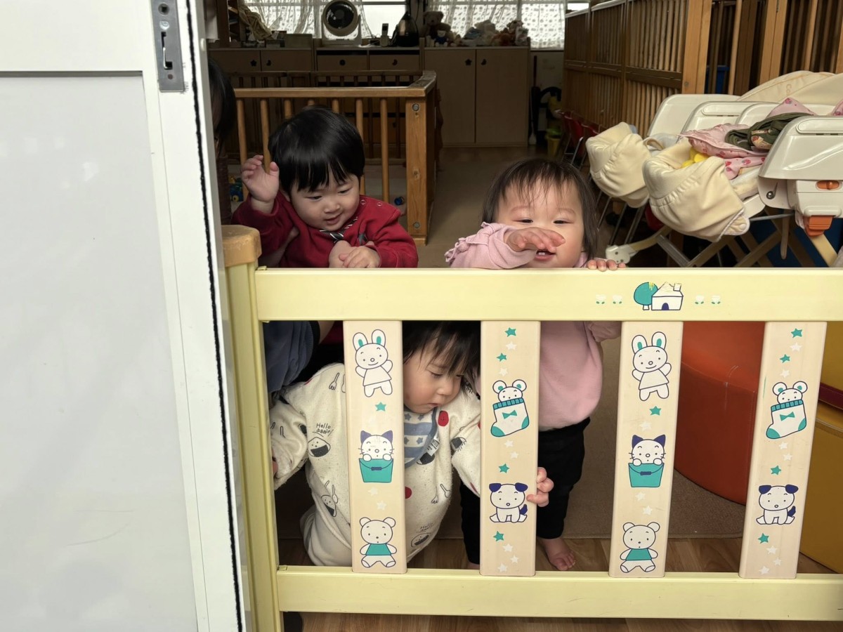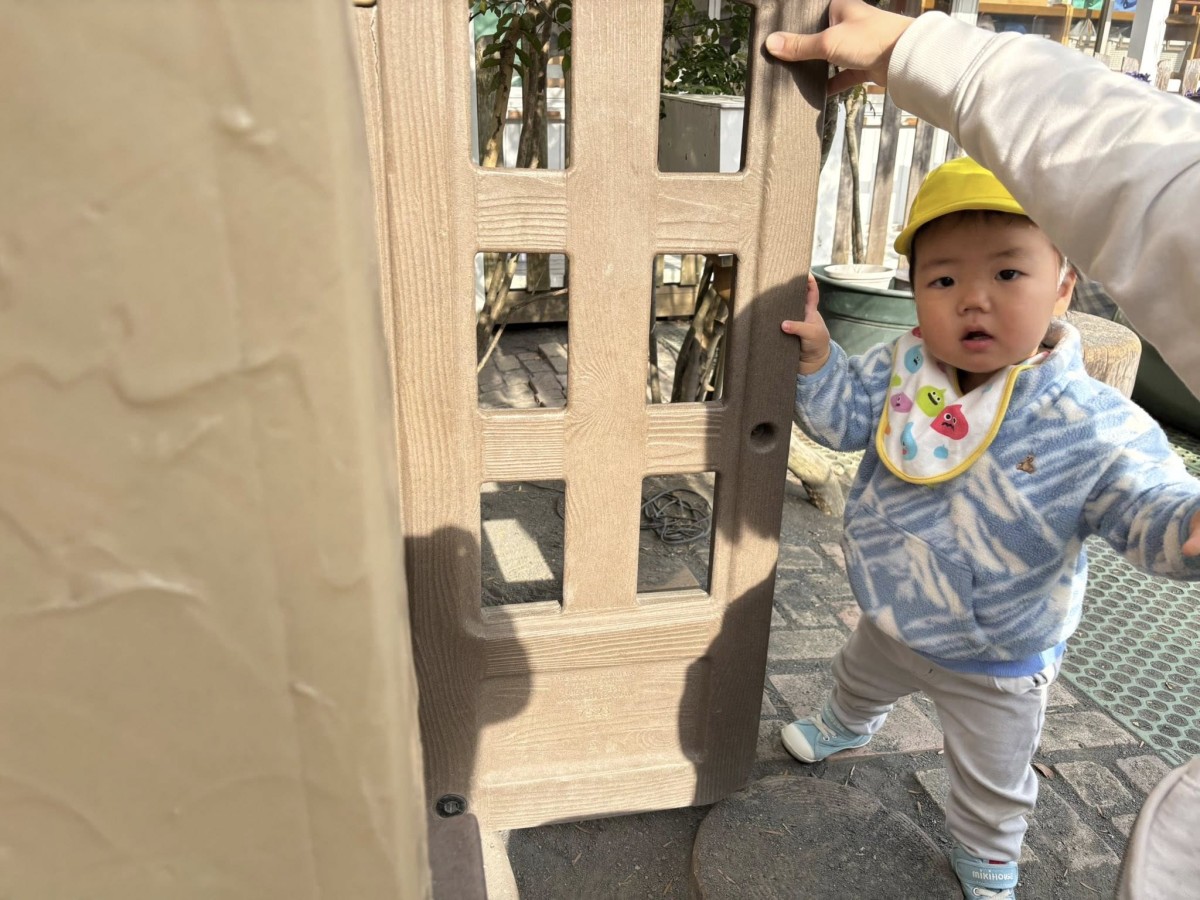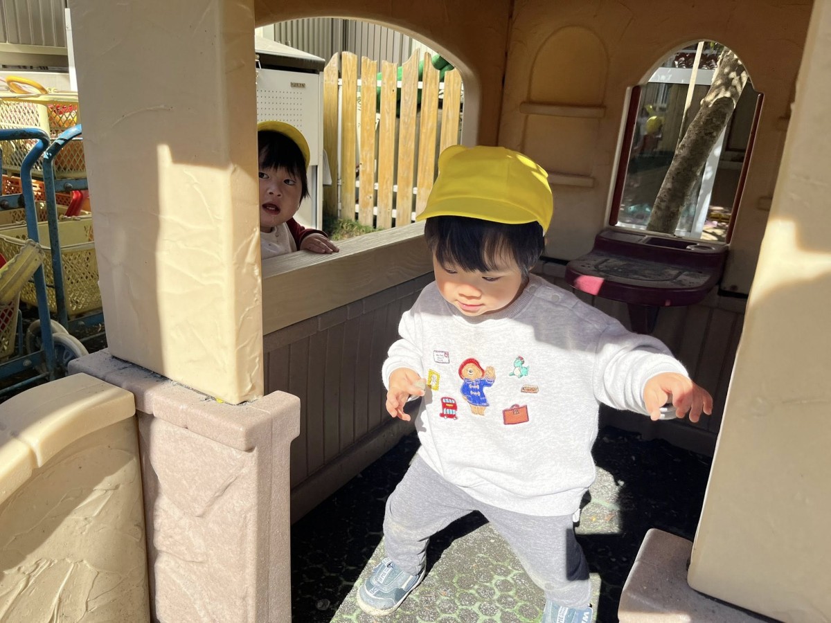 | 今日は園庭と室内に分かれて遊びました。スモールハウスの扉の開閉が大好きで「入る?」と伺うようにドアを開け閉めしていました。室内ではお部屋のあちこちを探索しながらお友だちの後を追いかけたり逃げたりして遊んでいました。 |