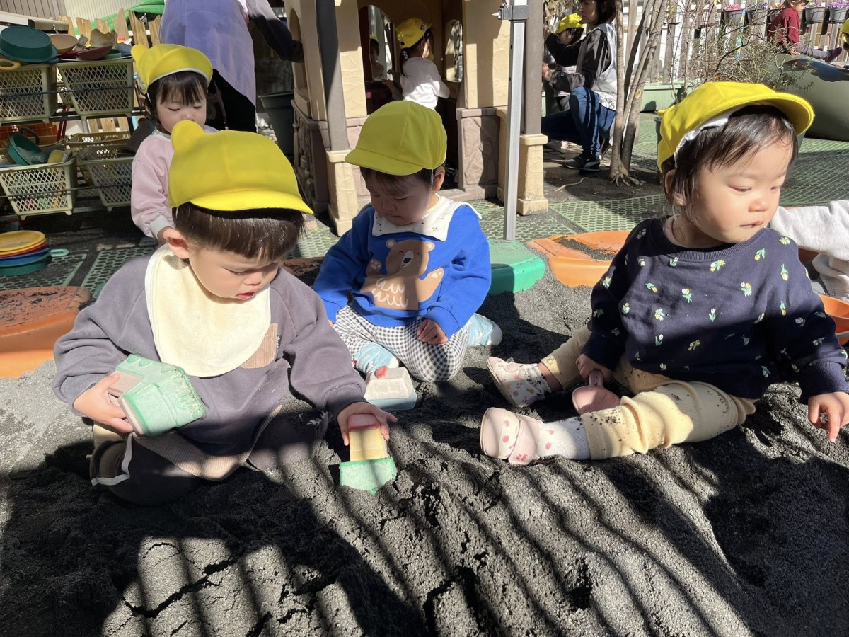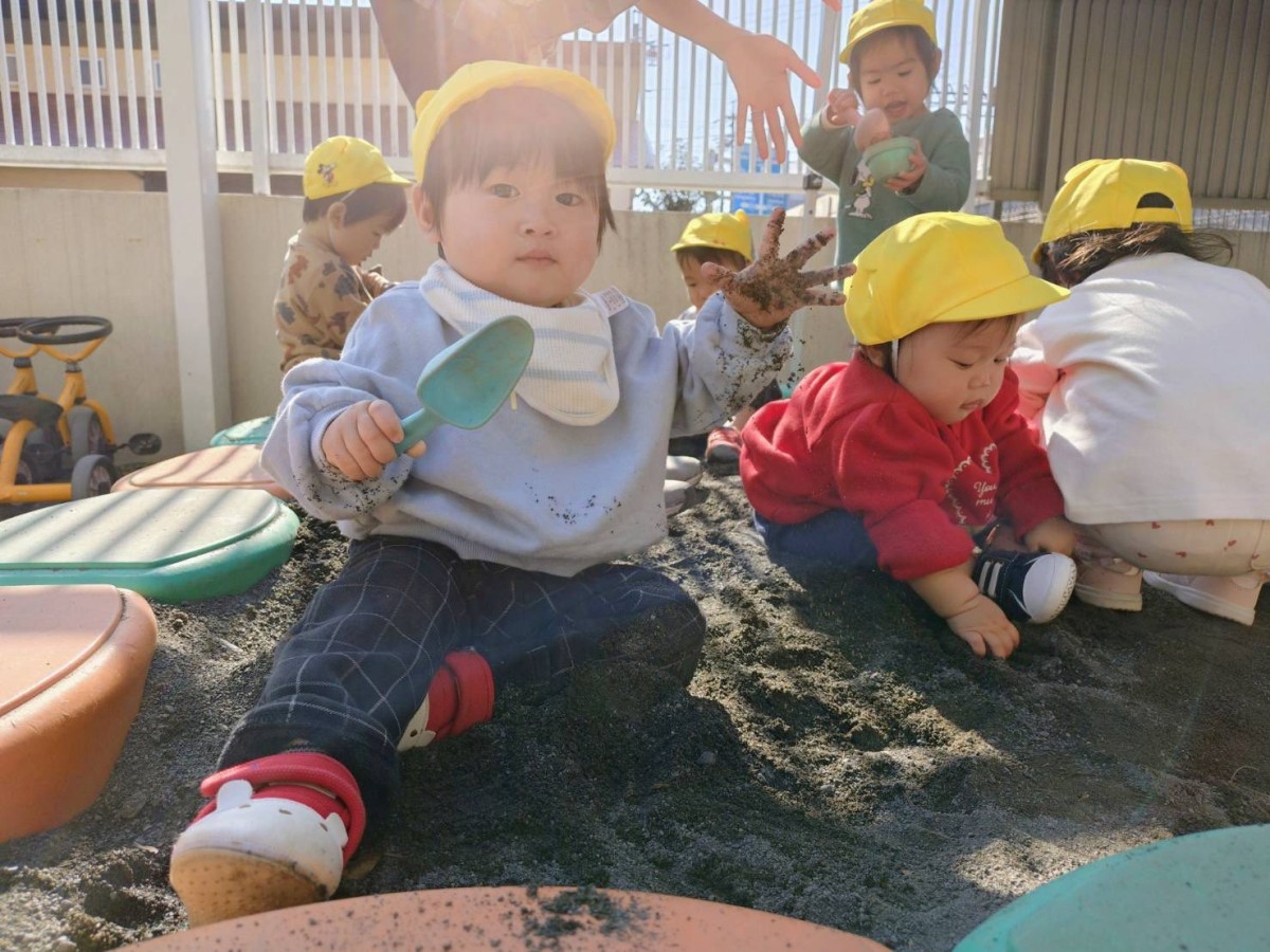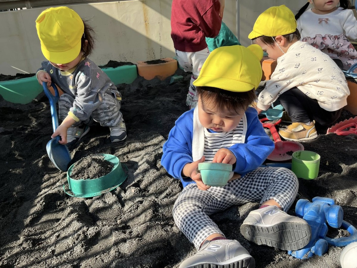 | 園庭へ出ました。暖かさが心地よく、元気に遊びました。スコップでザクザクと勢いよく掘るお友だち、指先で砂をつまんでカップに入れているお友だち、それぞれ夢中で遊んでいました。歩けるようになったお友だちも増え、探索を楽しんでいます! |