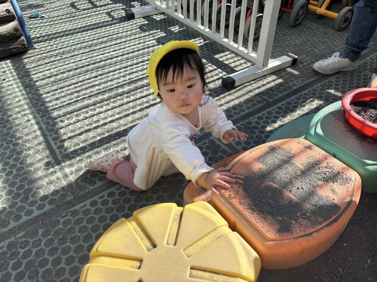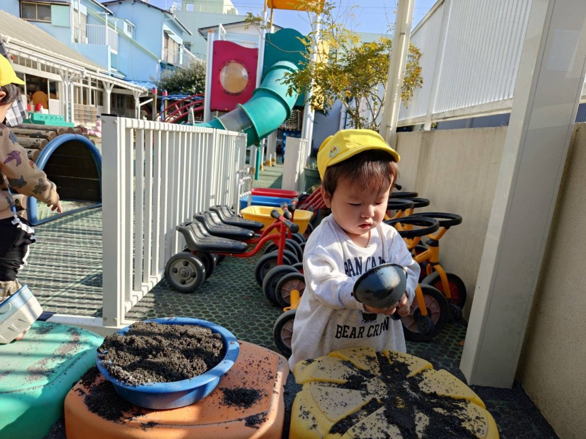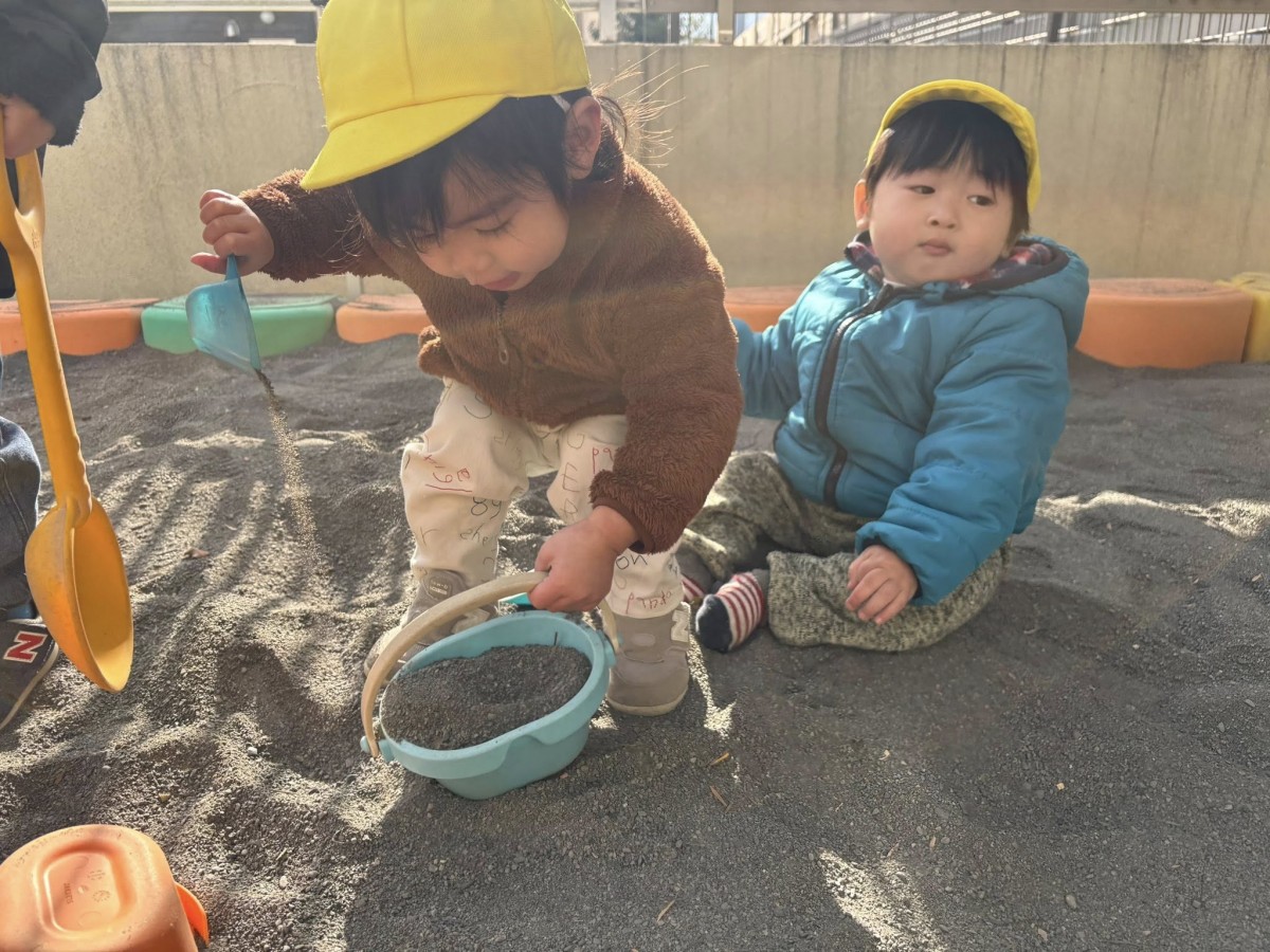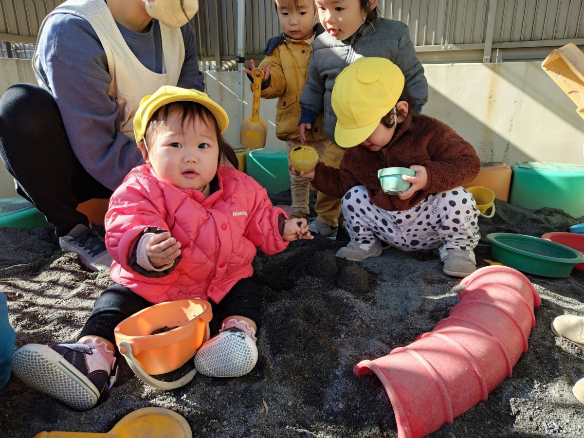 | 園庭へ出ました。暖かさが心地よく、元気に遊びました。スコップでザクザクと勢いよく掘るお友だち、指先で砂をつまんでカップに入れているお友だち、それぞれ夢中で遊んでいました。歩けるようになったお友だちも増え、探索を楽しんでいます! |