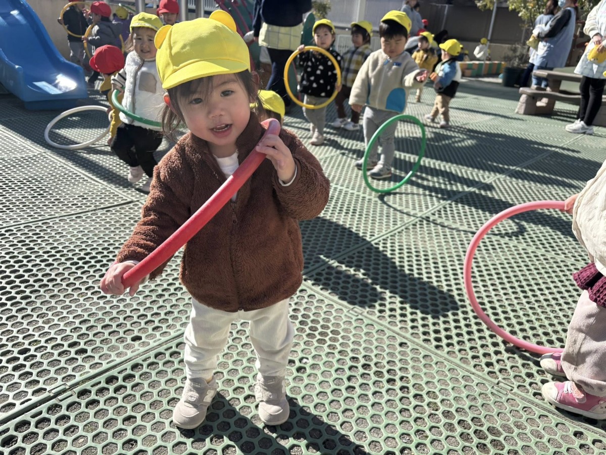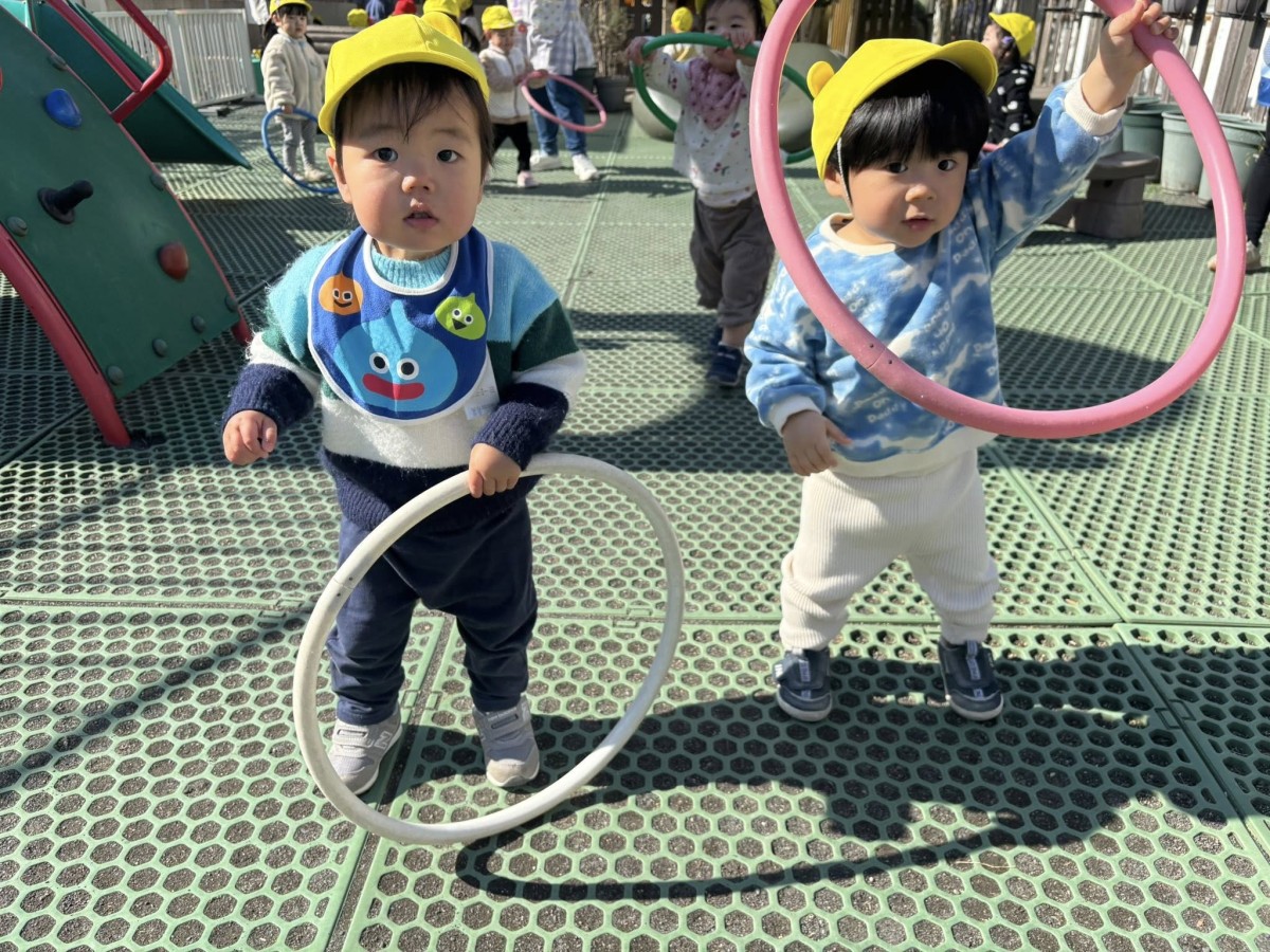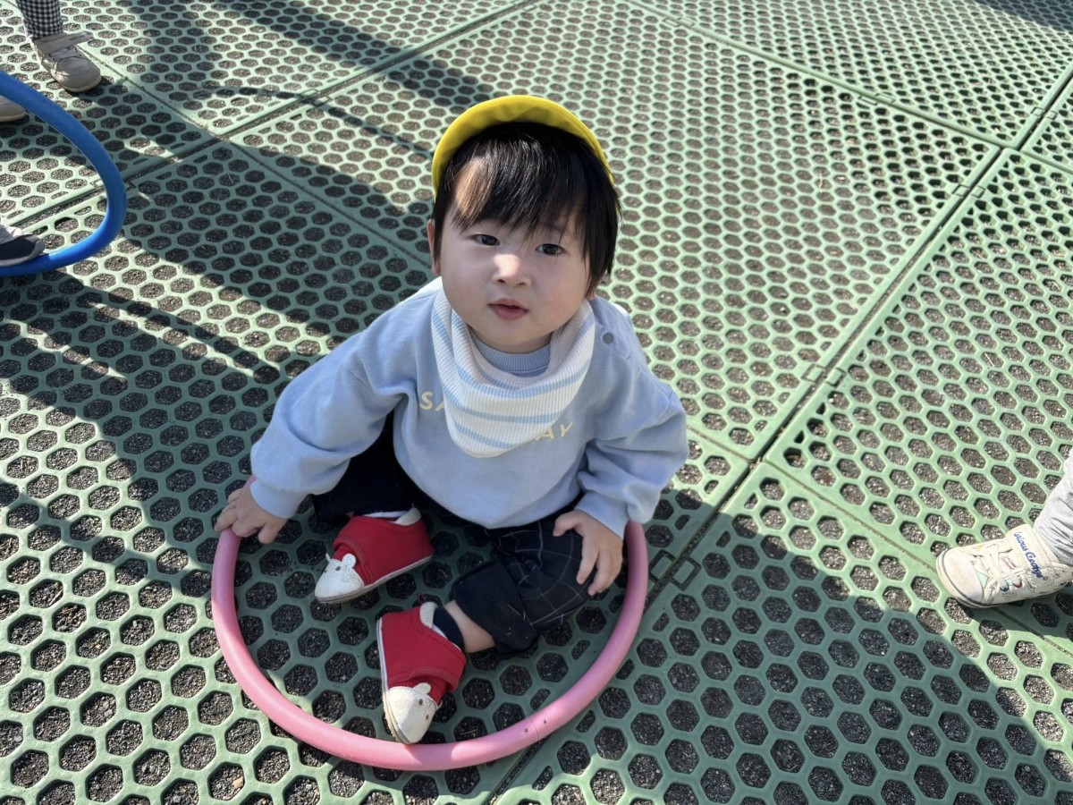 | 今日は園庭で遊びました。フラフープで遊んでいる1歳児さんを見て、やってみたい!遊びたい!と取りに行っていました。保育士が転がすと「待てー」と追いかけて遊んでいました。 |
