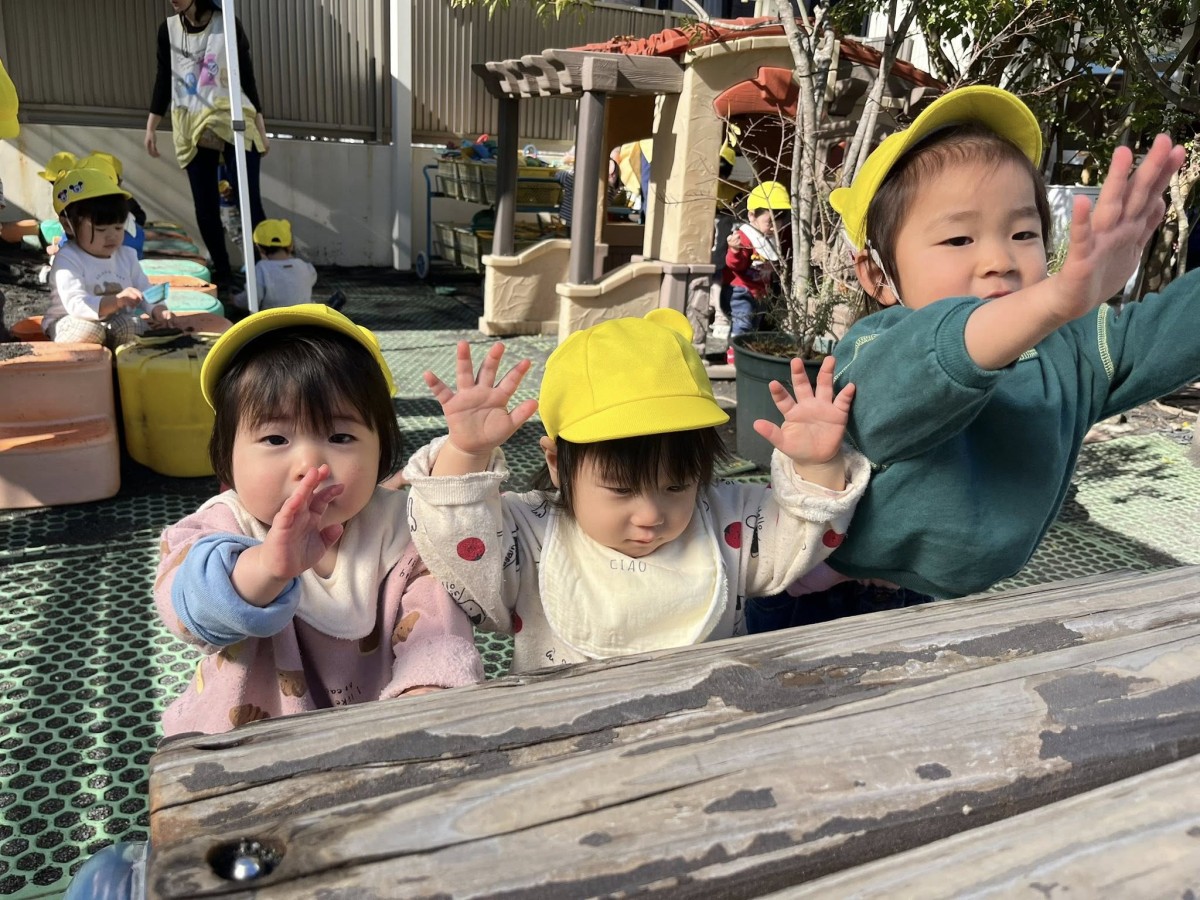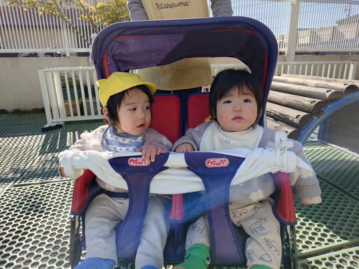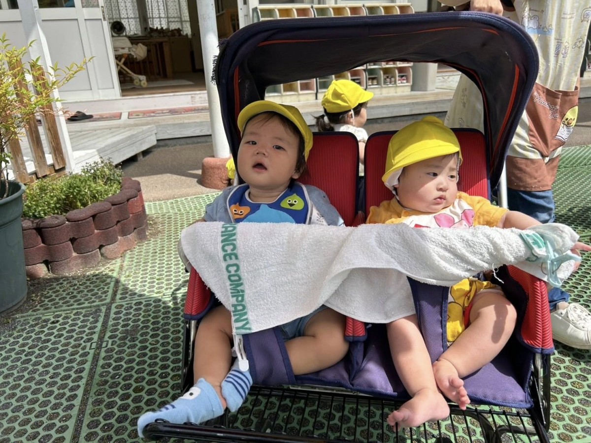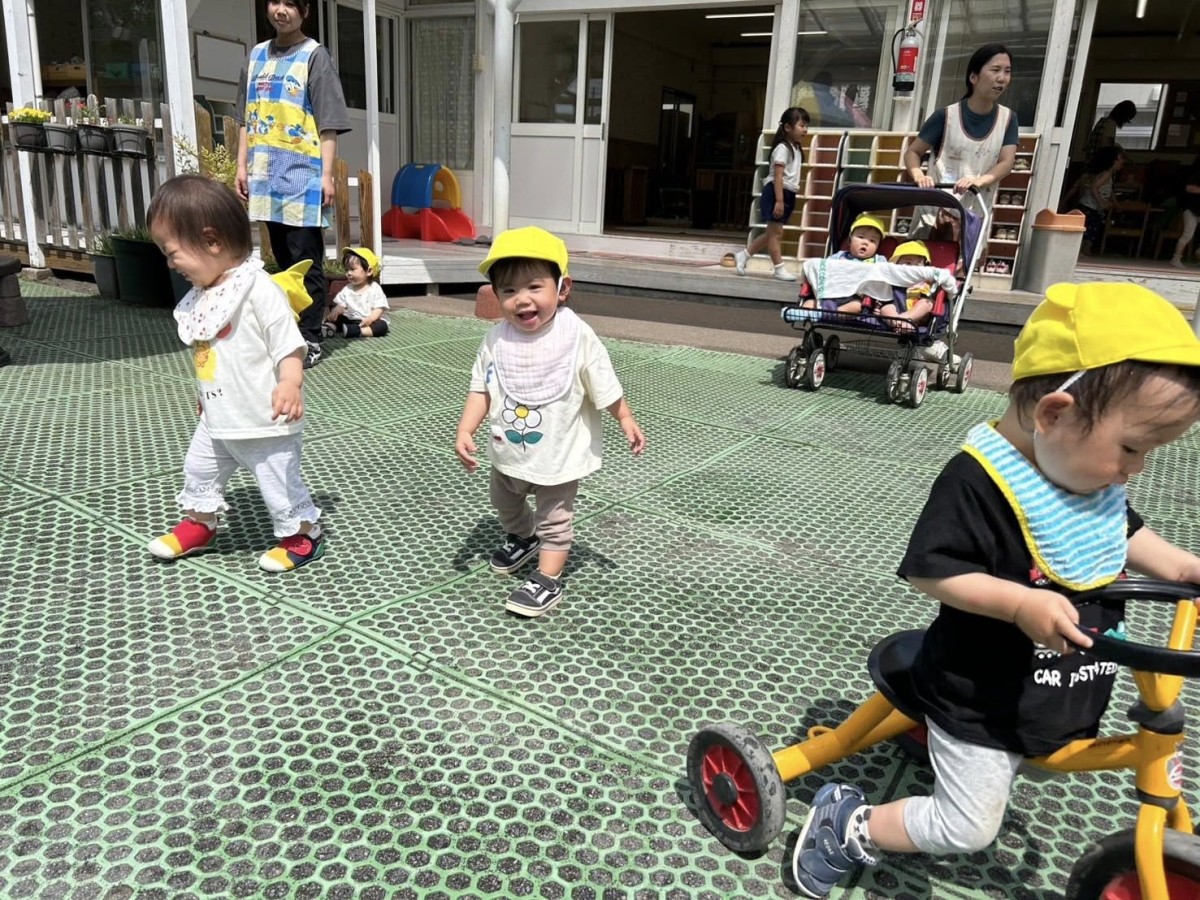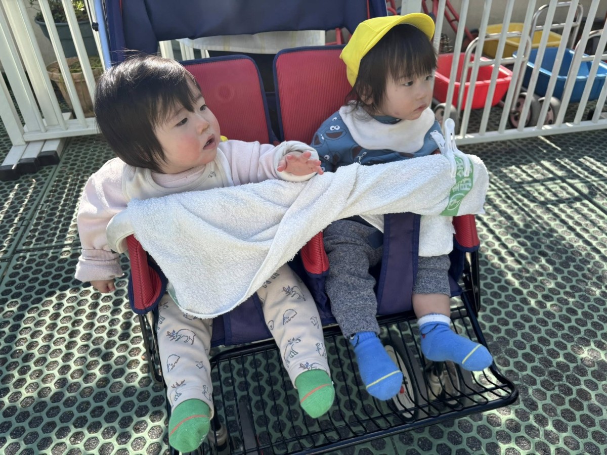 | 今日はベビーカーに乗り園庭に出ました。ベビーカーからの眺めを楽しんでいるとお外で遊んでいた一才児クラスのお友だちが気づいて話しかけたり手を振ってくれてりしてみんなも反応していました。 |