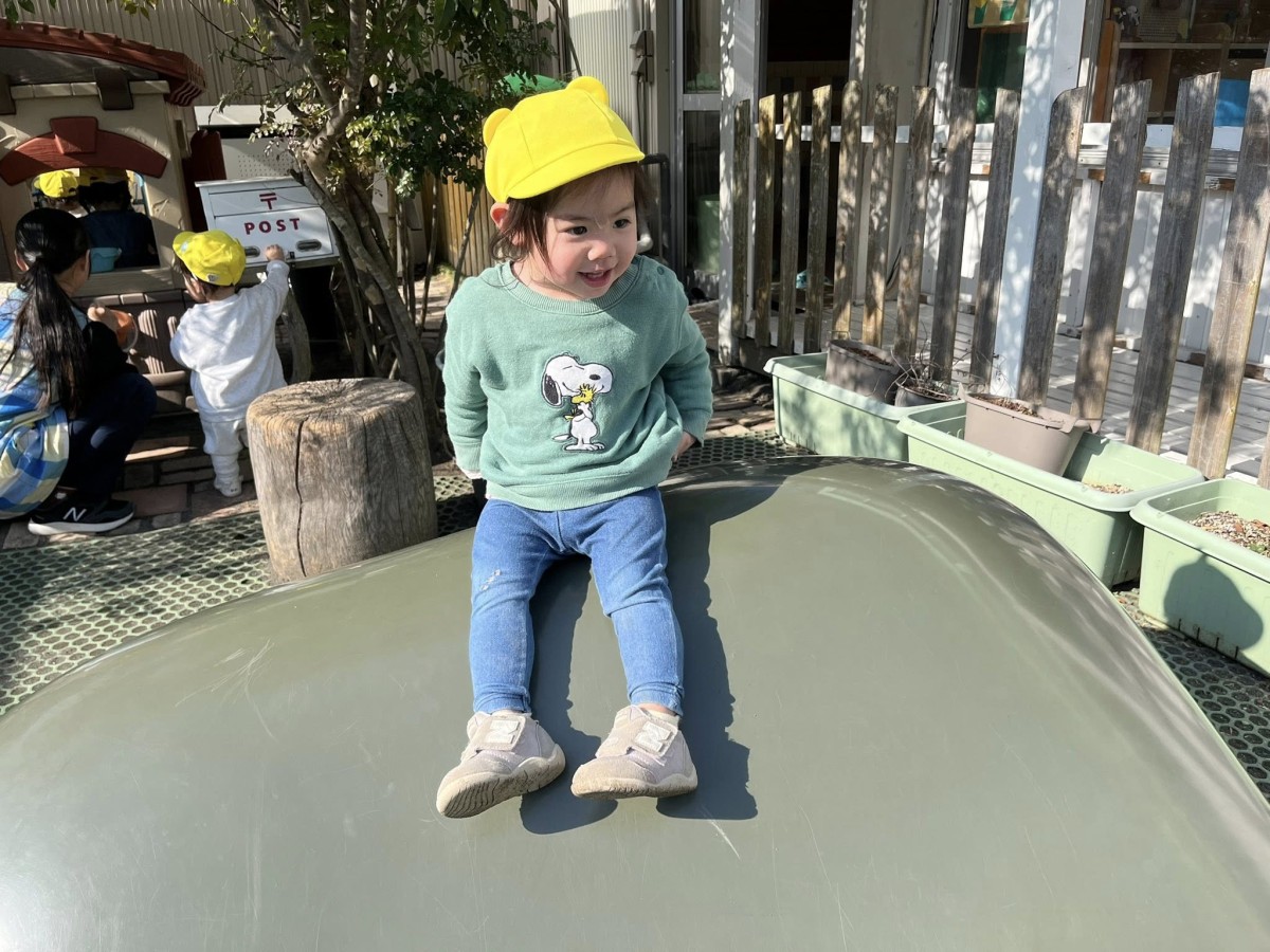| 今日は園庭で遊びました。スモールハウスの中からお友だちや保育士に向かって手を振ってくれていました。室内では大型マットによじ登って「できたよ」と嬉しそうな顔を見せています。 |