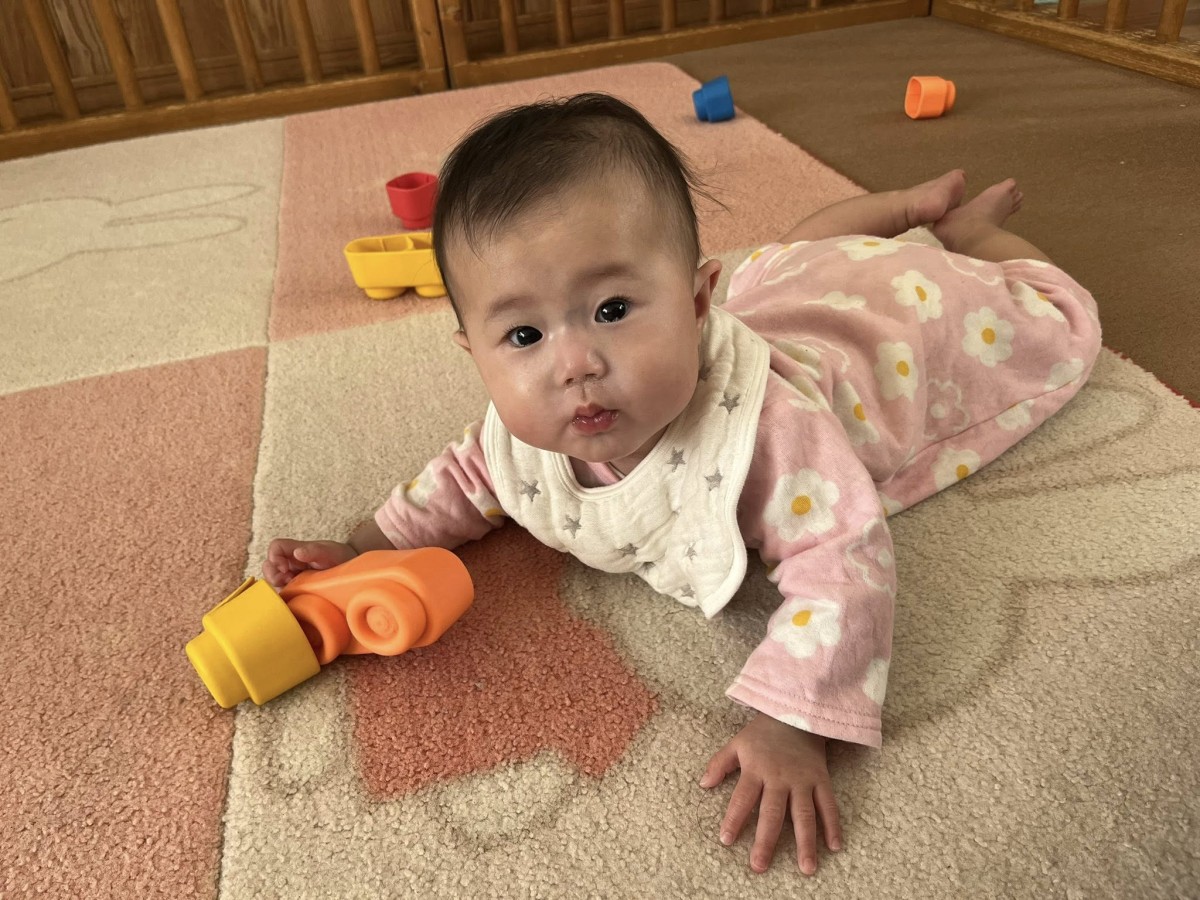 | 今日は室内と園庭で遊びました。園庭ではピクニックシートを敷いておもちゃを用意して遊びました。廊下を通るお友だちが気になって廊下につかまり立ちして手を伸ばして「ここにいるよ」とアピールしている子もいました。 |